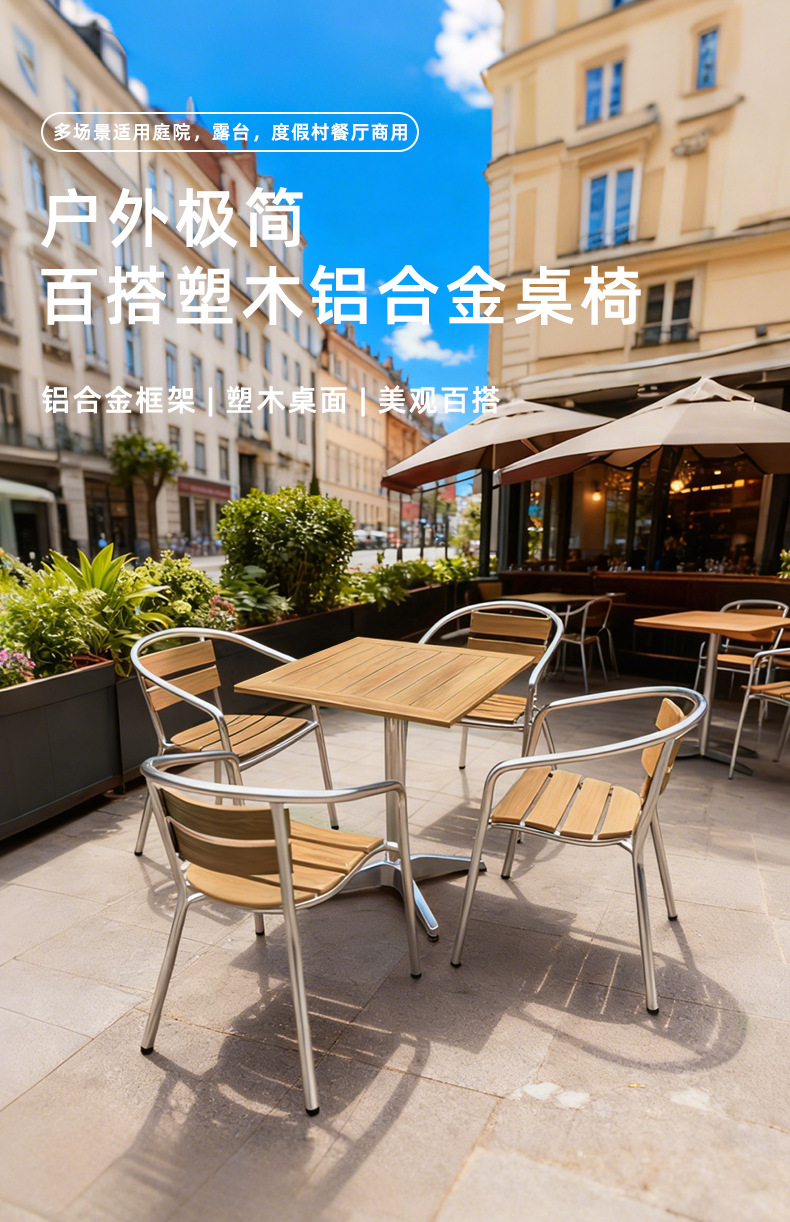 야외 플라스틱 목재 알루미늄 합금 테이블과 의자 조합 레저 의자 야외 안뜰 발코니 다이닝 테이블 온라인 유명 상점 매칭 테이블과 의자스토어 가기