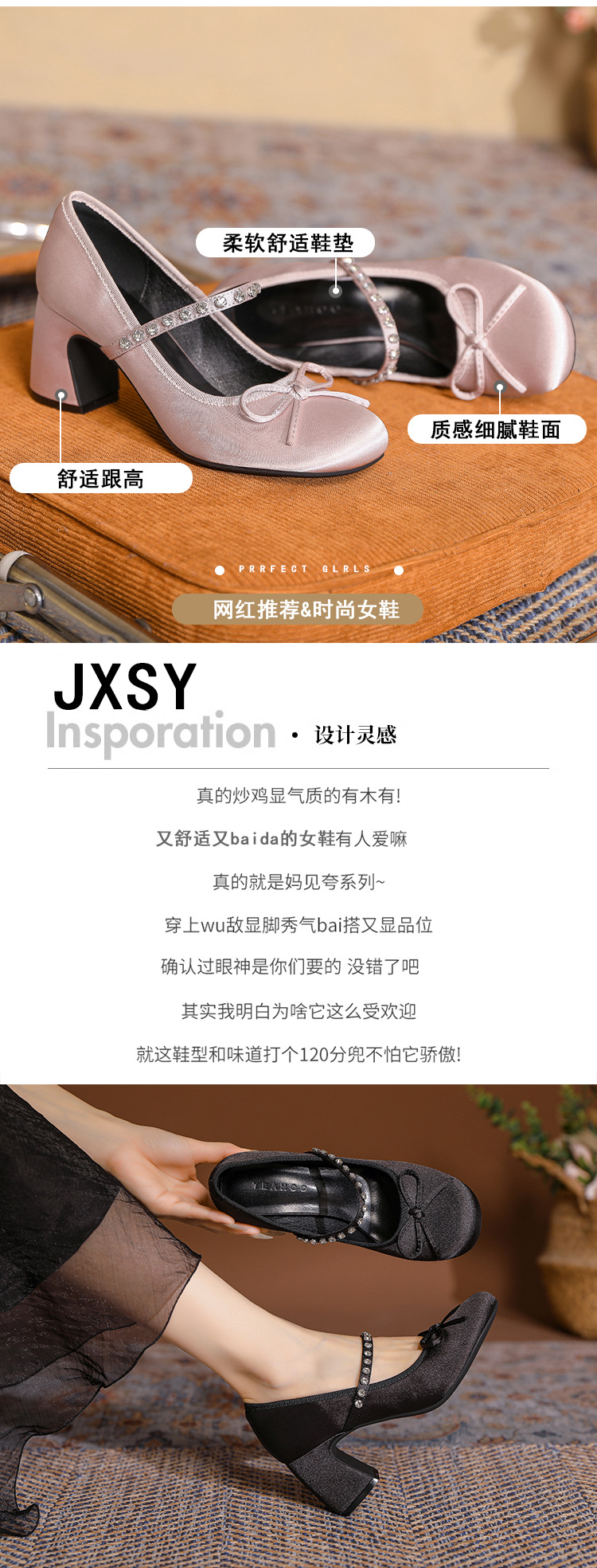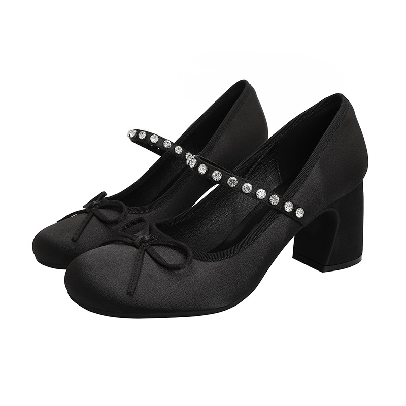핑크 샤넬 스타일 여성 신발 봄과 가을 새로운 귀여운 활 라인스톤 한 캐릭터 라운드 토 하이힐 메리 제인 신발