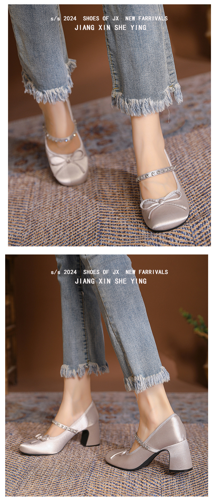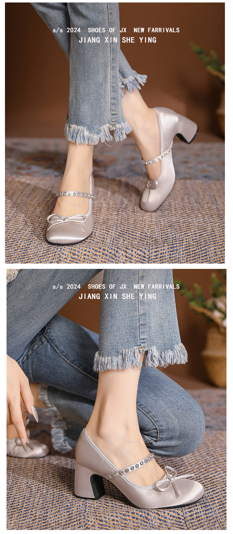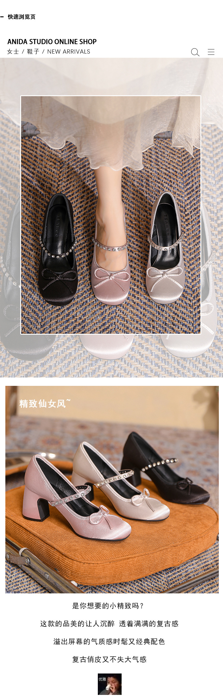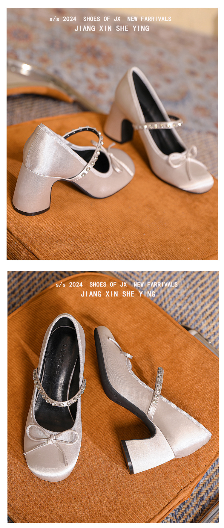 핑크 샤넬 스타일 여성 신발 봄과 가을 새로운 귀여운 활 라인스톤 한 캐릭터 라운드 토 하이힐 메리 제인 신발스토어 가기