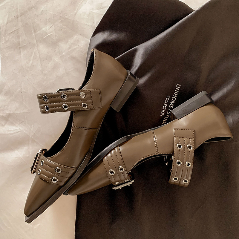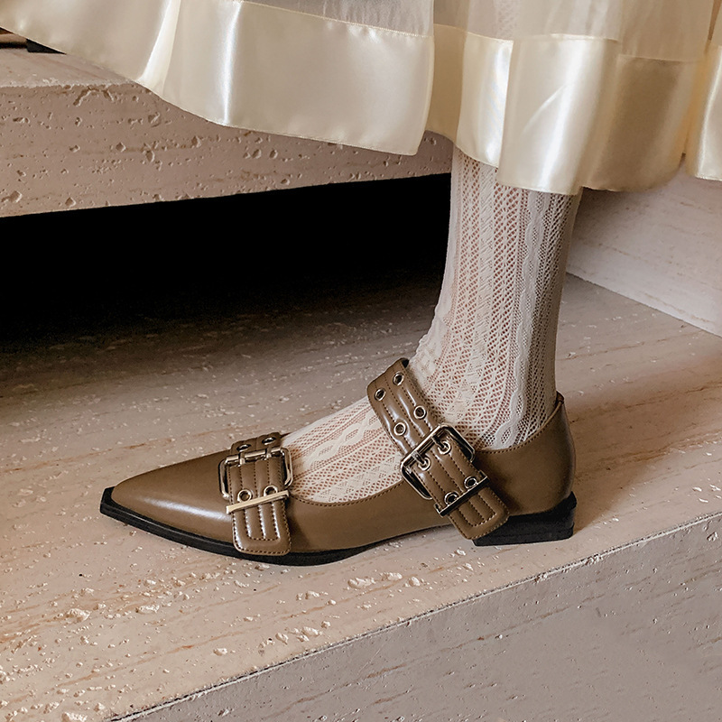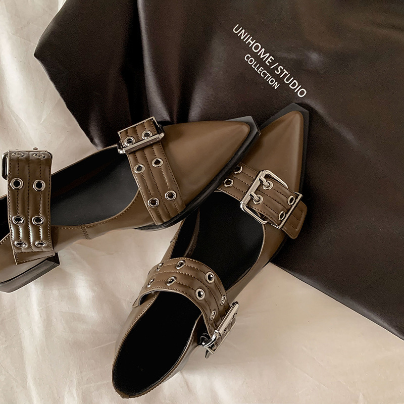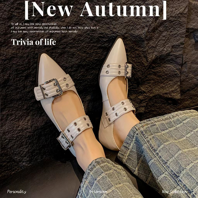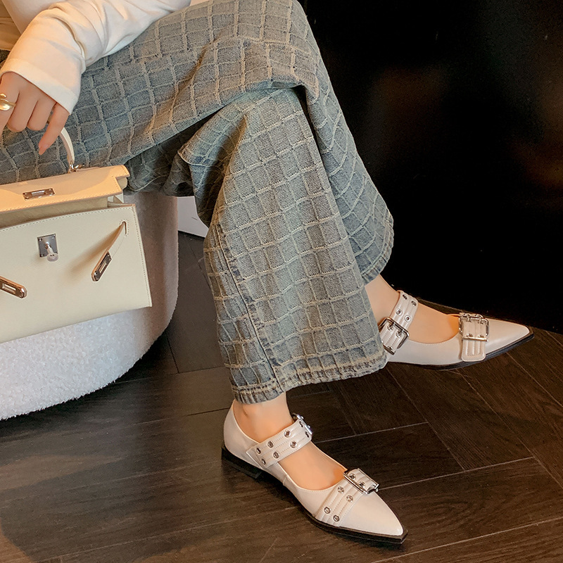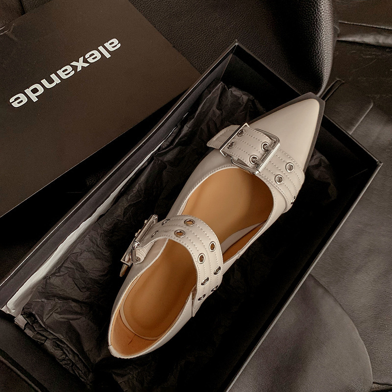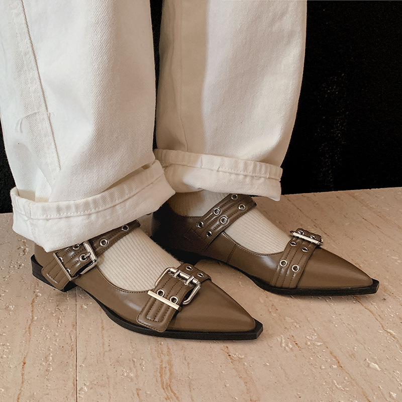 2024 새로운 영국 봄과 여름 벨트 버클 뾰족한 플랫 신발 얕은 여성 신발 트렌디 신발스토어 가기