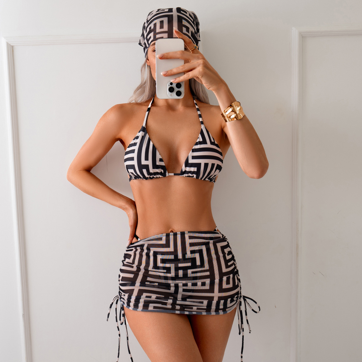 유럽과 미국은 동일한 스카프로 인쇄 된 메쉬 오버 스커트 3 피스 세트와 함께 국경을 넘는 새로운 여성 섹시한 스트랩 비키니스토어 가기