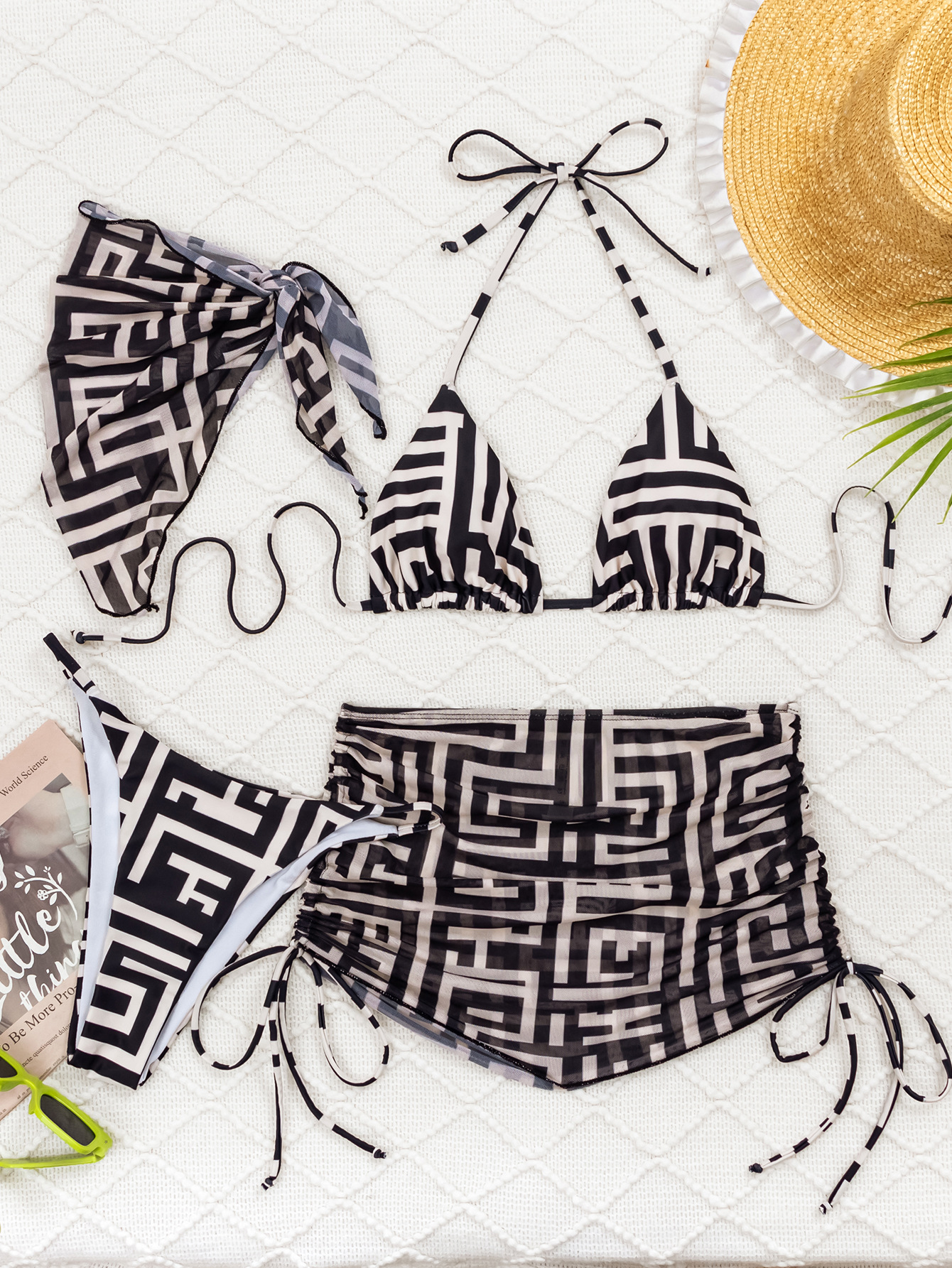 유럽과 미국은 동일한 스카프로 인쇄 된 메쉬 오버 스커트 3 피스 세트와 함께 국경을 넘는 새로운 여성 섹시한 스트랩 비키니