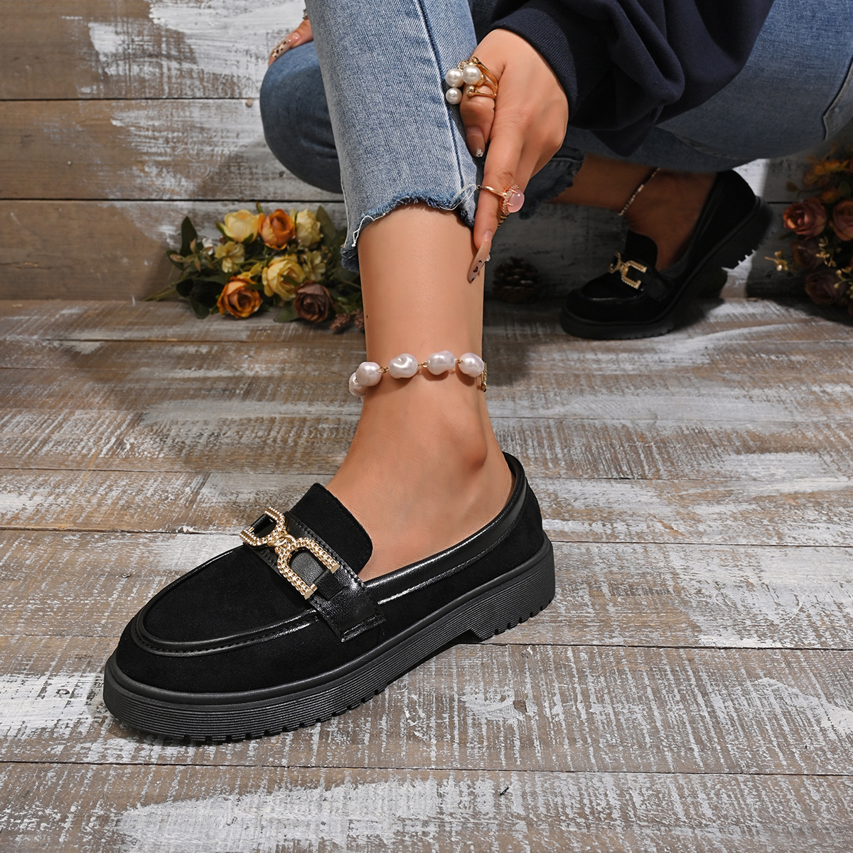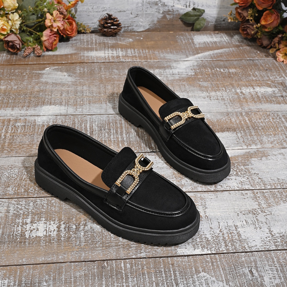 두꺼운 밑창 로퍼 여성의 영국 가죽 신발 여성의 2024 가을 새로운 빈티지 금속 버클 슬립 온 두꺼운 싱글 레이어 신발스토어 가기