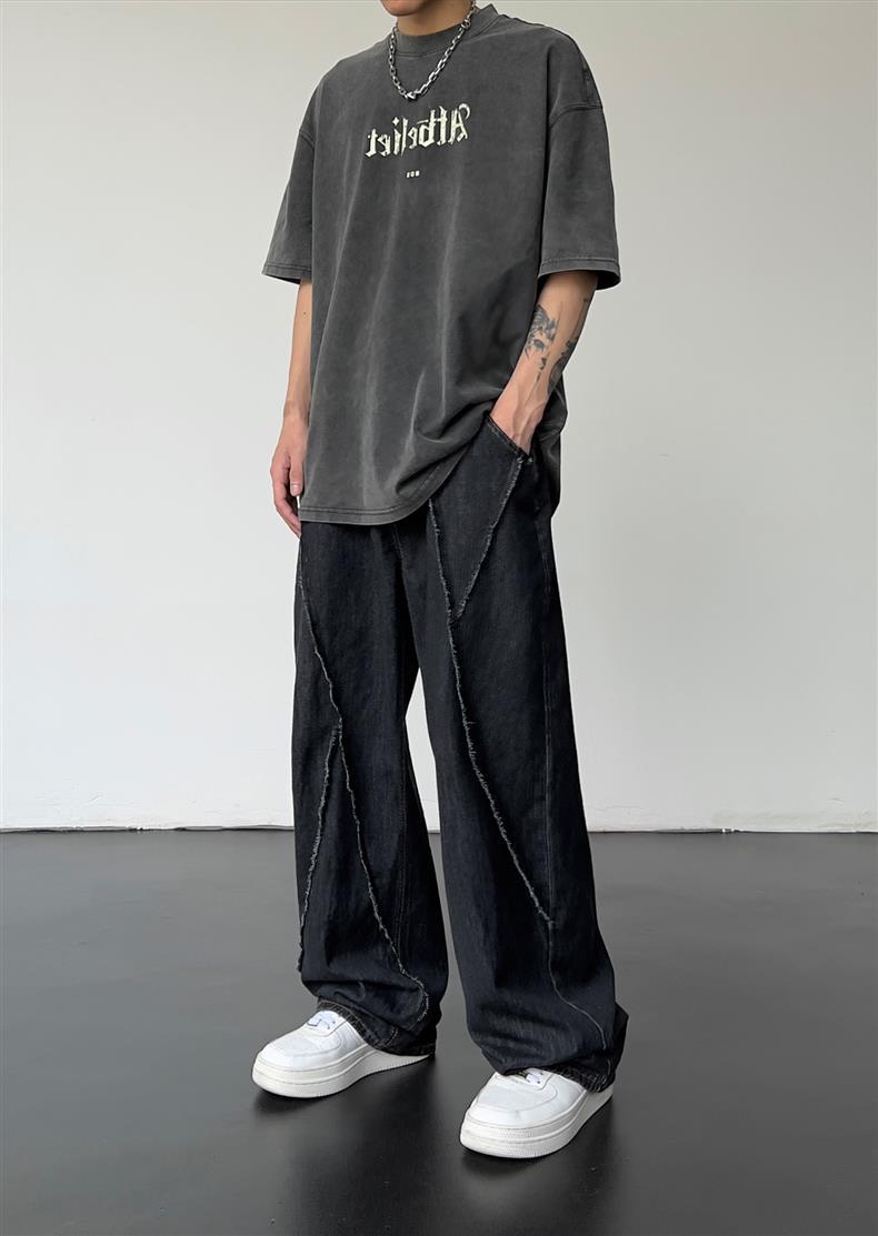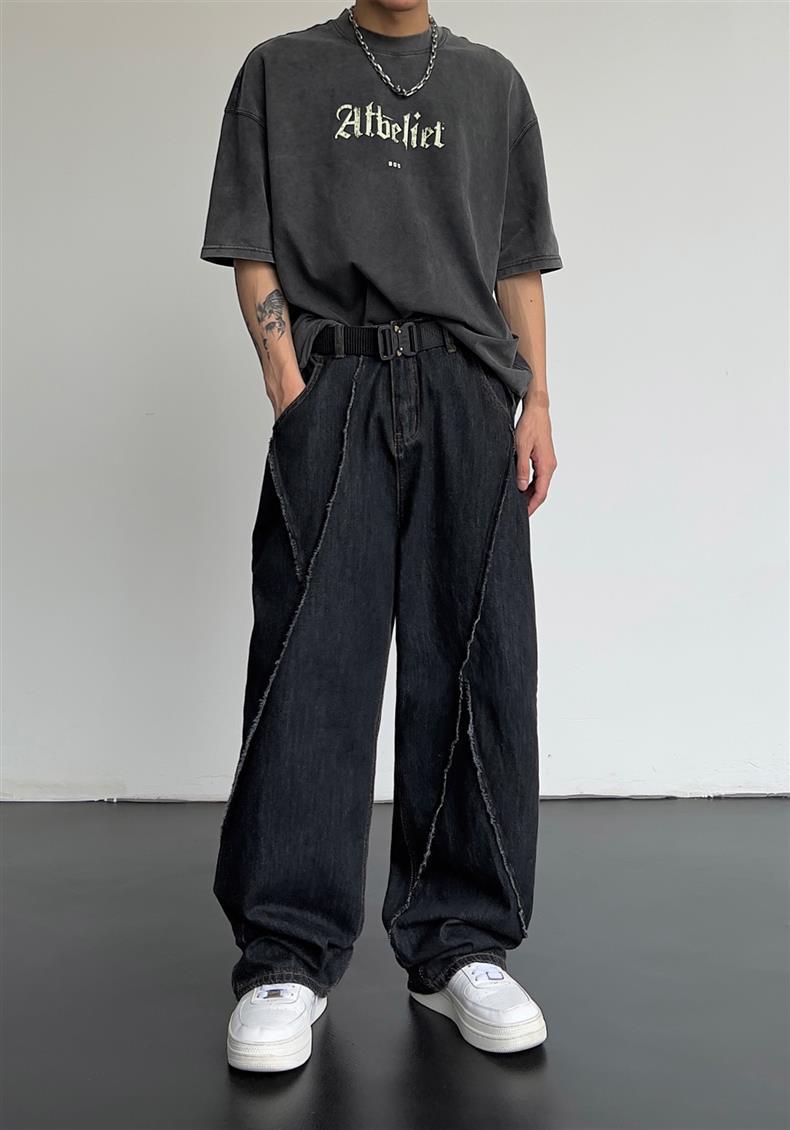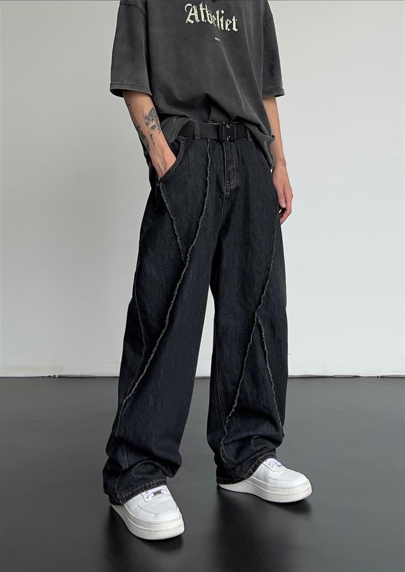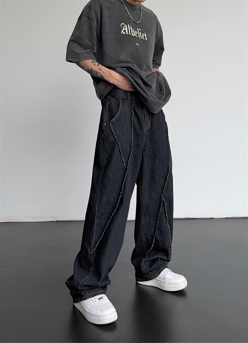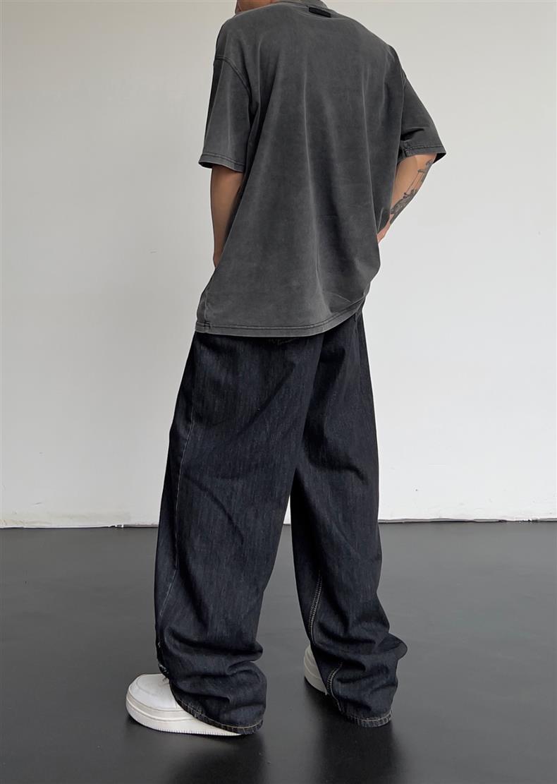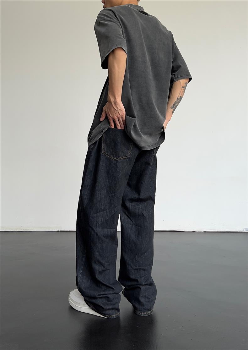일본식 레트로 느슨한 스트레이트-다리 청바지 남자 하이 스트리트 가을 힙합 트렌디 올매치 캐주얼 와이드 레그 바지스토어 가기
