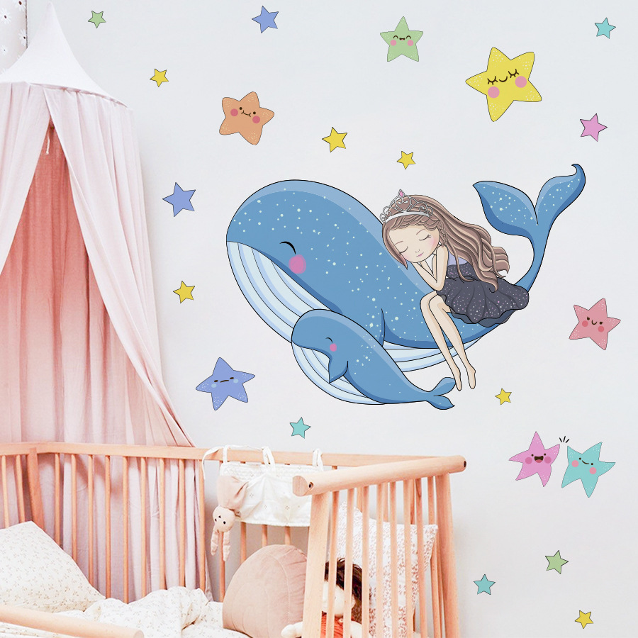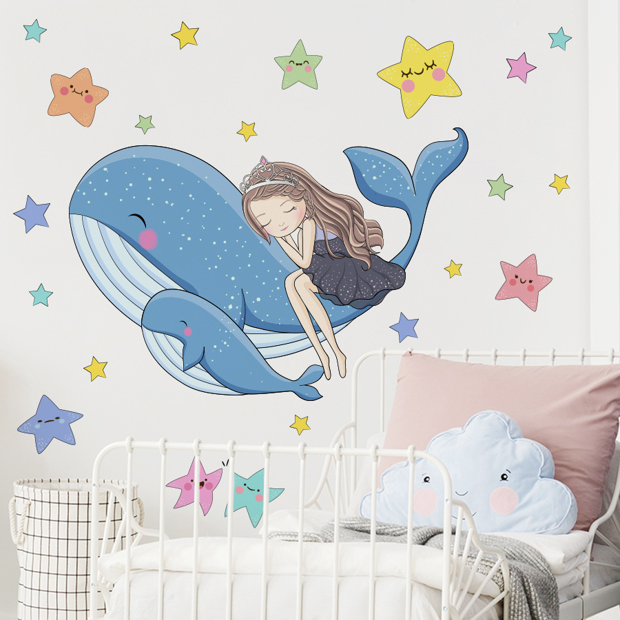 만화 드림 스타 고래와 소녀 자기 접착 벽 스티커 어린이 방 침실 기숙사 장식 스티커 BR3362H