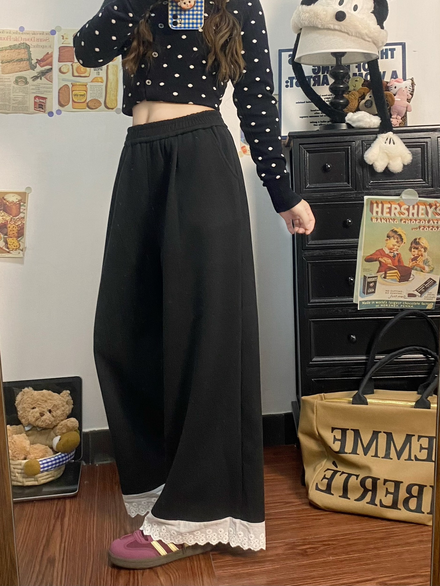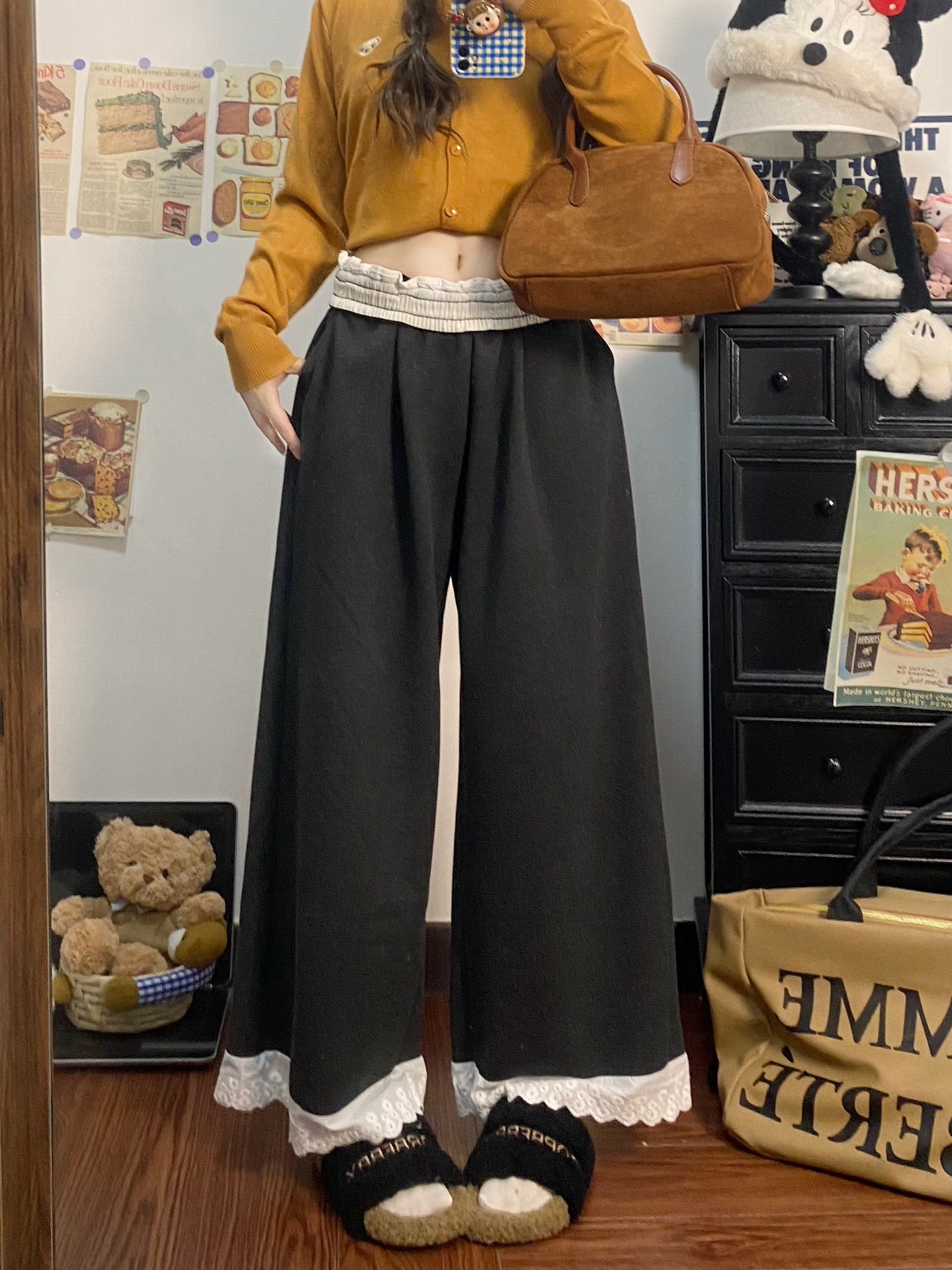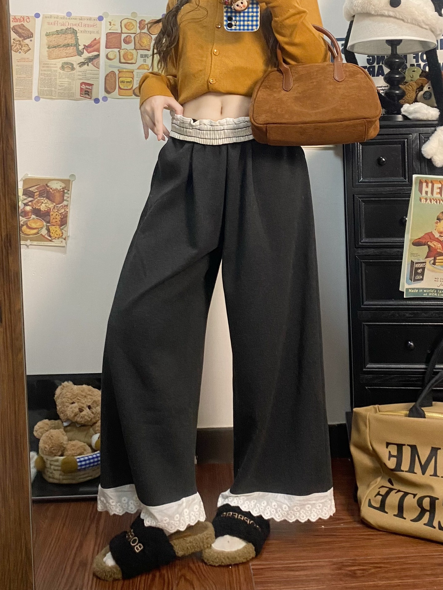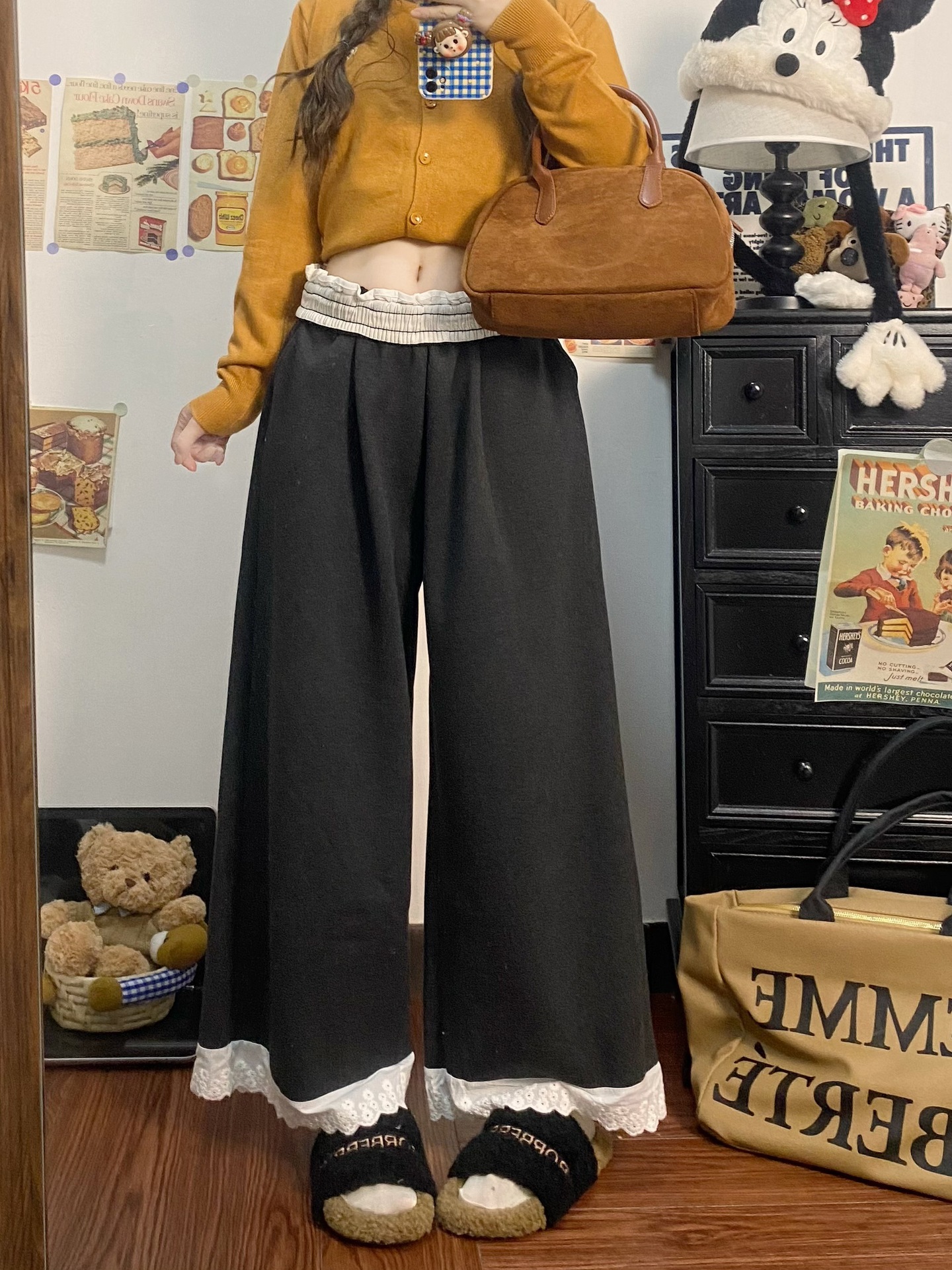 2025 유행 올매치 두꺼운 캐주얼 소프트 울 소재 높은 허리 레이스 바느질 스트레이트 다리 바지 간단한 와이드 다리 바지스토어 가기