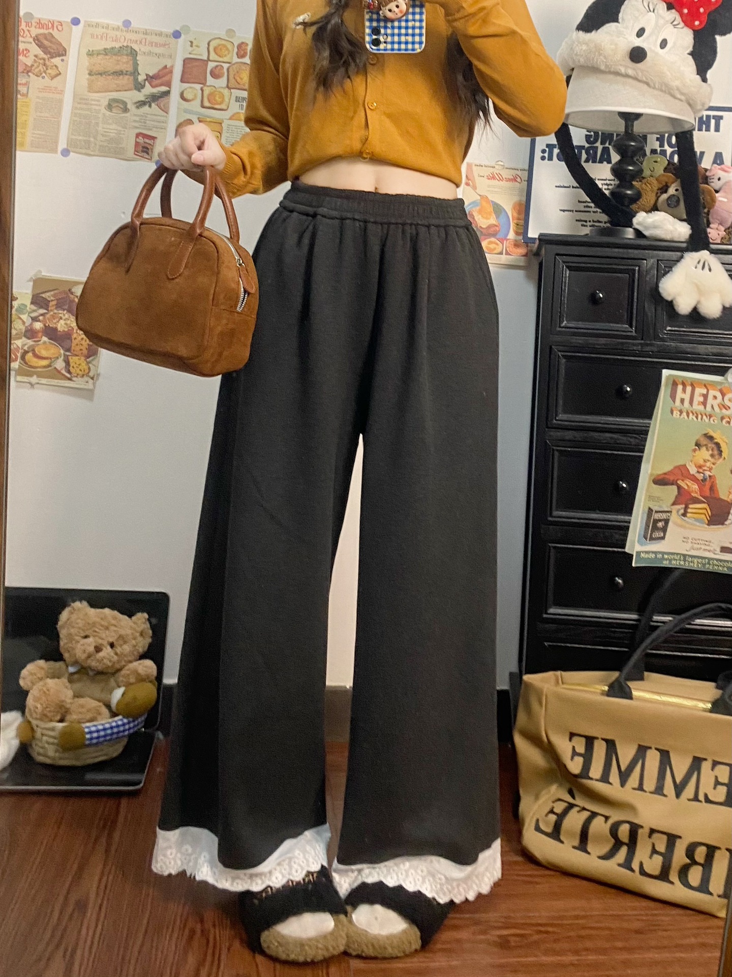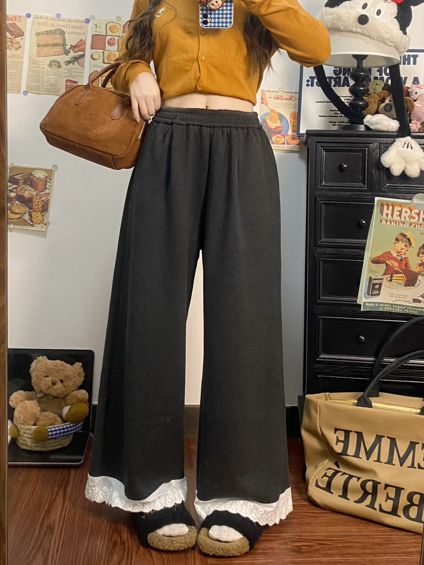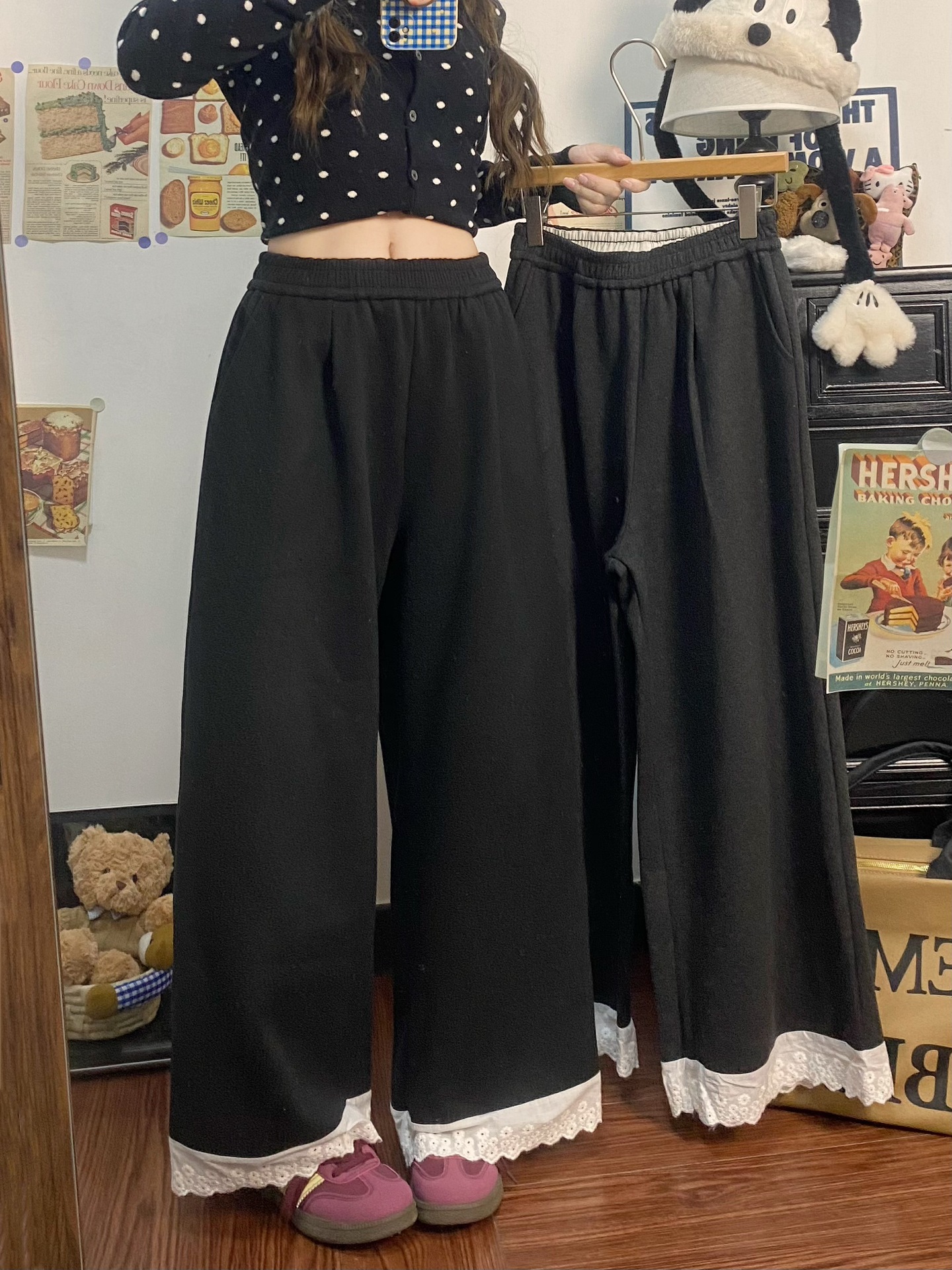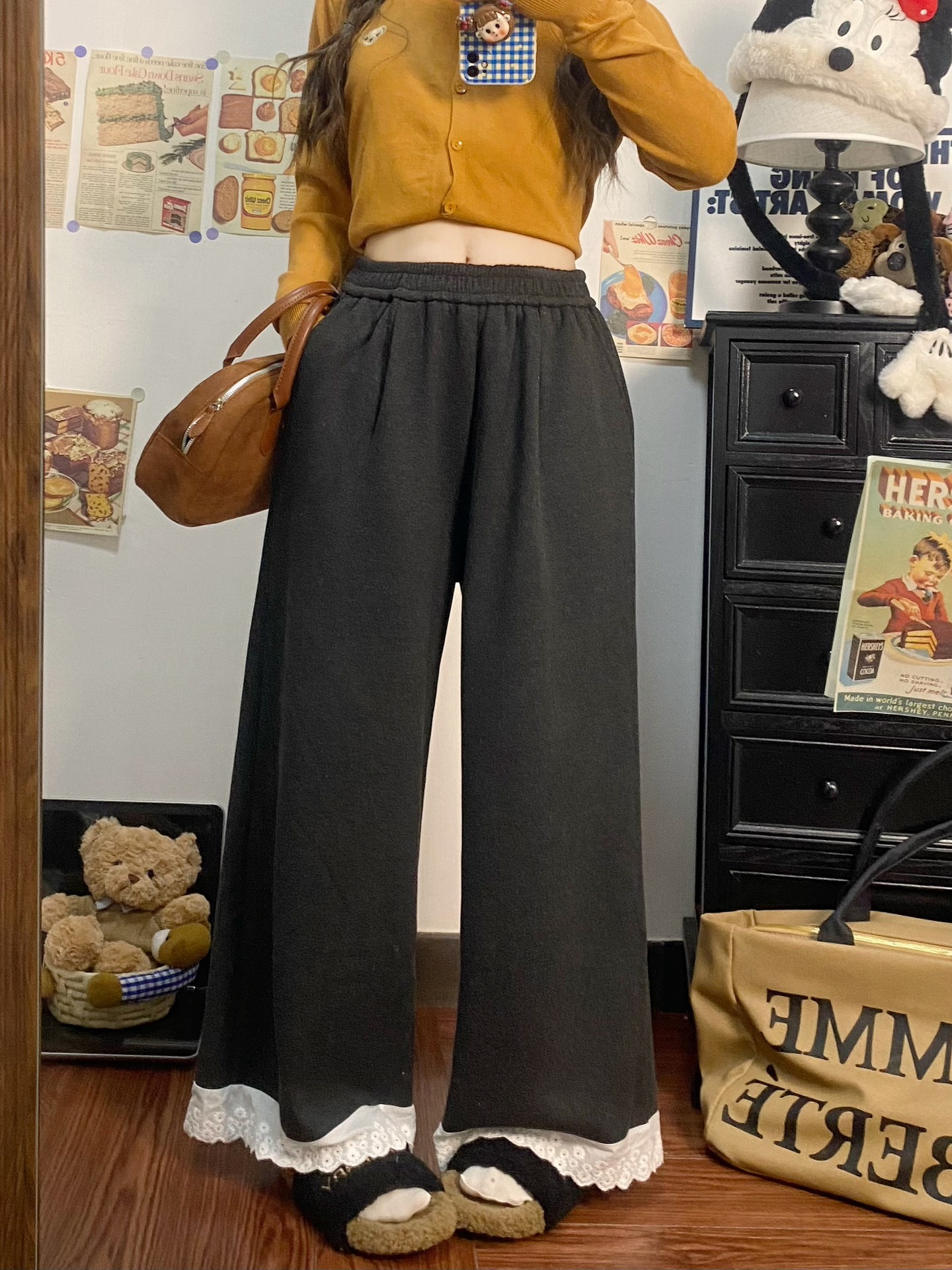 2025 유행 올매치 두꺼운 캐주얼 소프트 울 소재 높은 허리 레이스 바느질 스트레이트 다리 바지 간단한 와이드 다리 바지스토어 가기