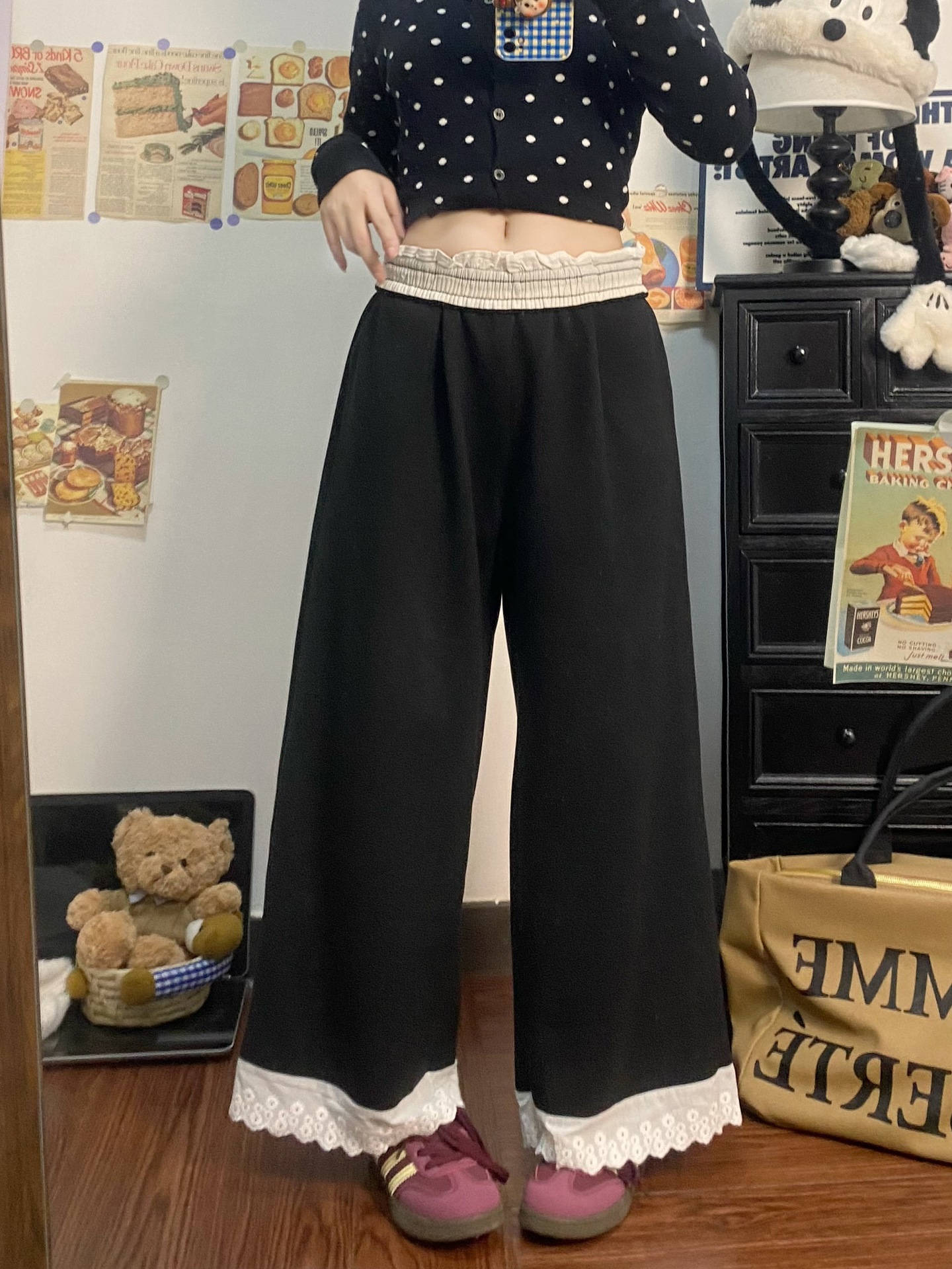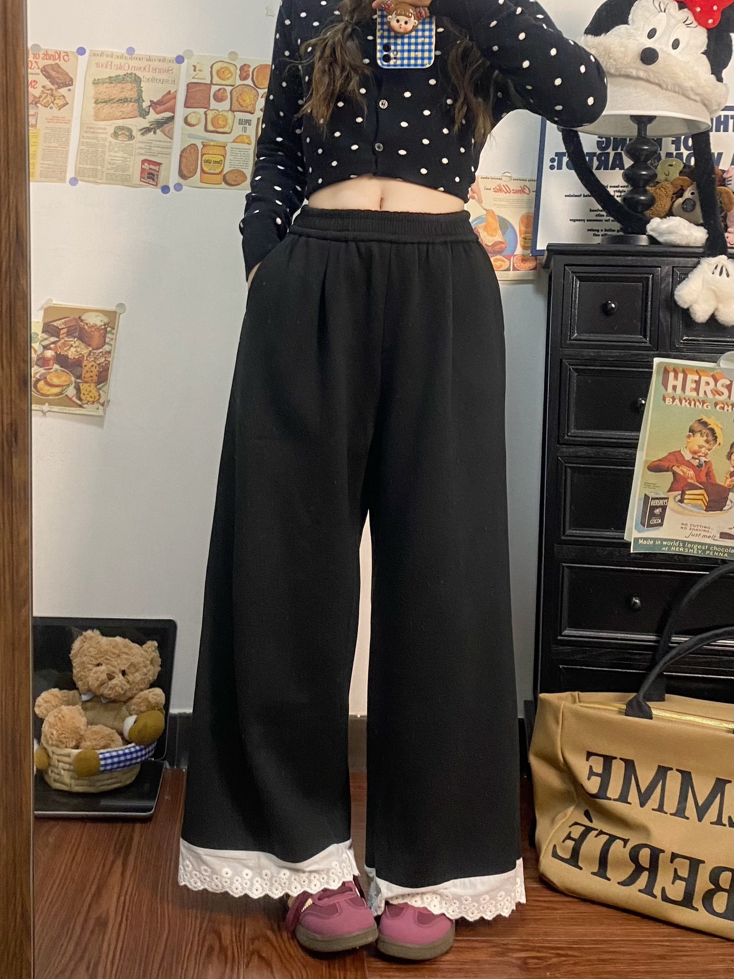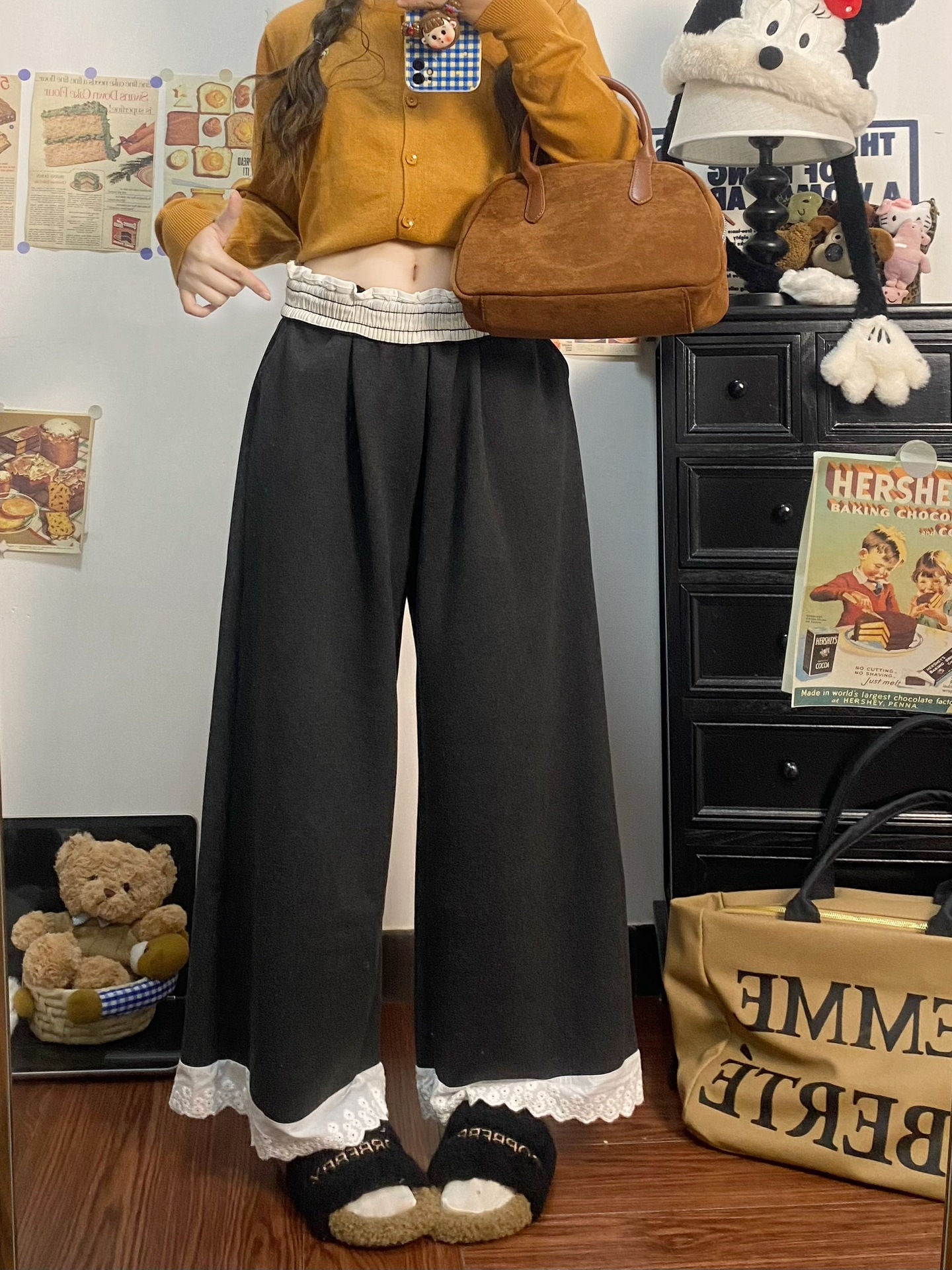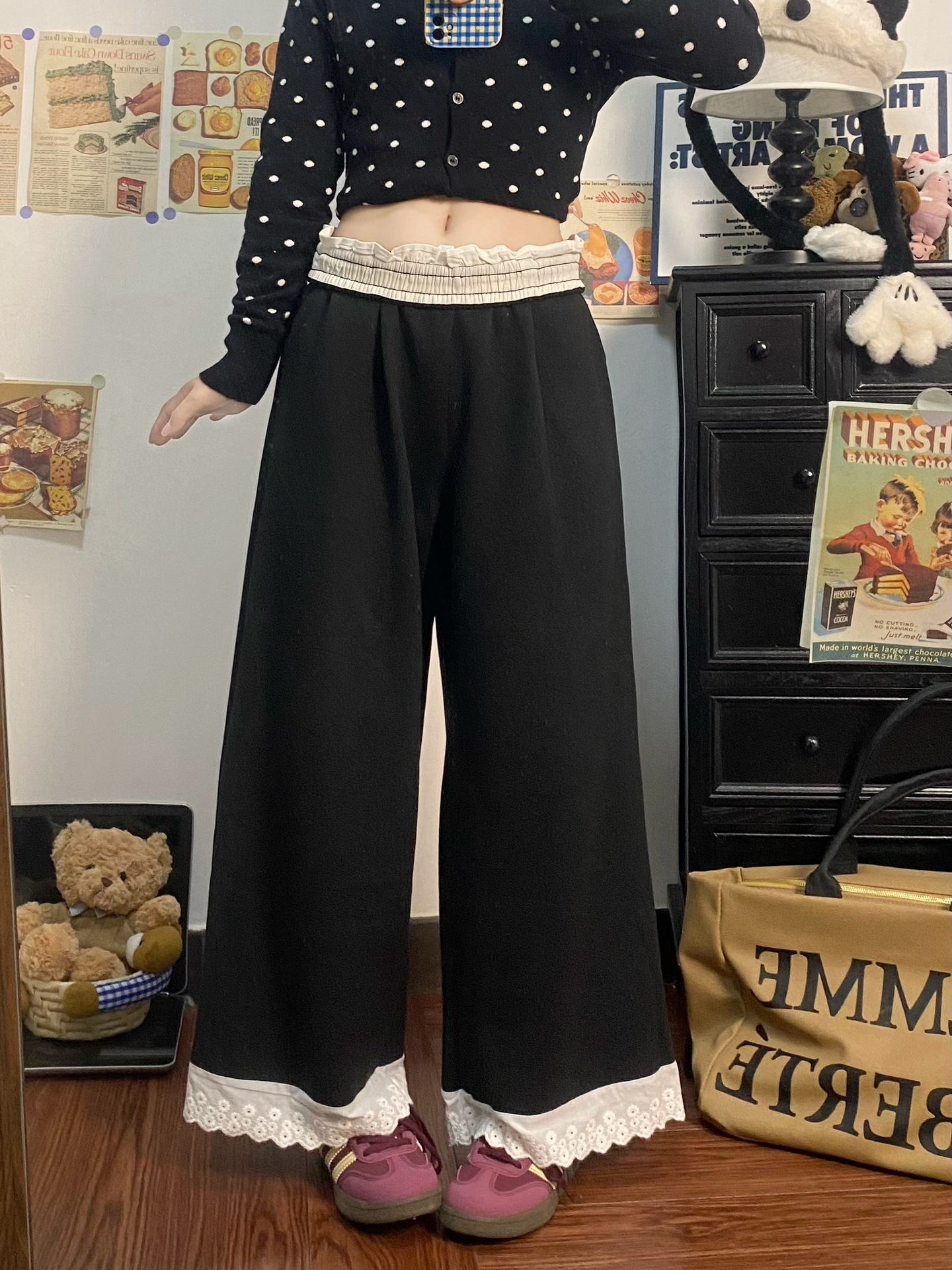 2025 유행 올매치 두꺼운 캐주얼 소프트 울 소재 높은 허리 레이스 바느질 스트레이트 다리 바지 간단한 와이드 다리 바지스토어 가기