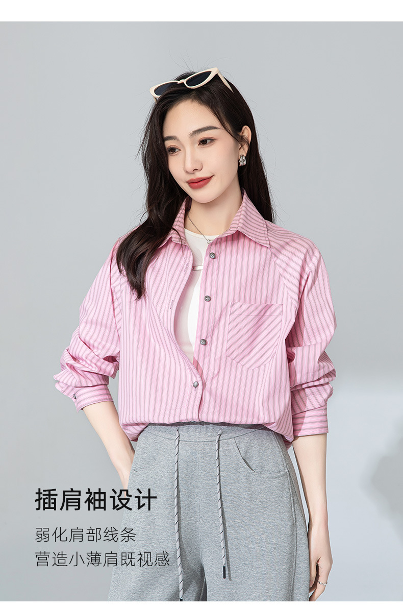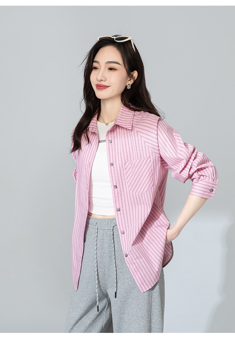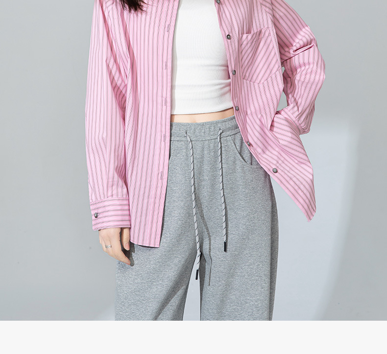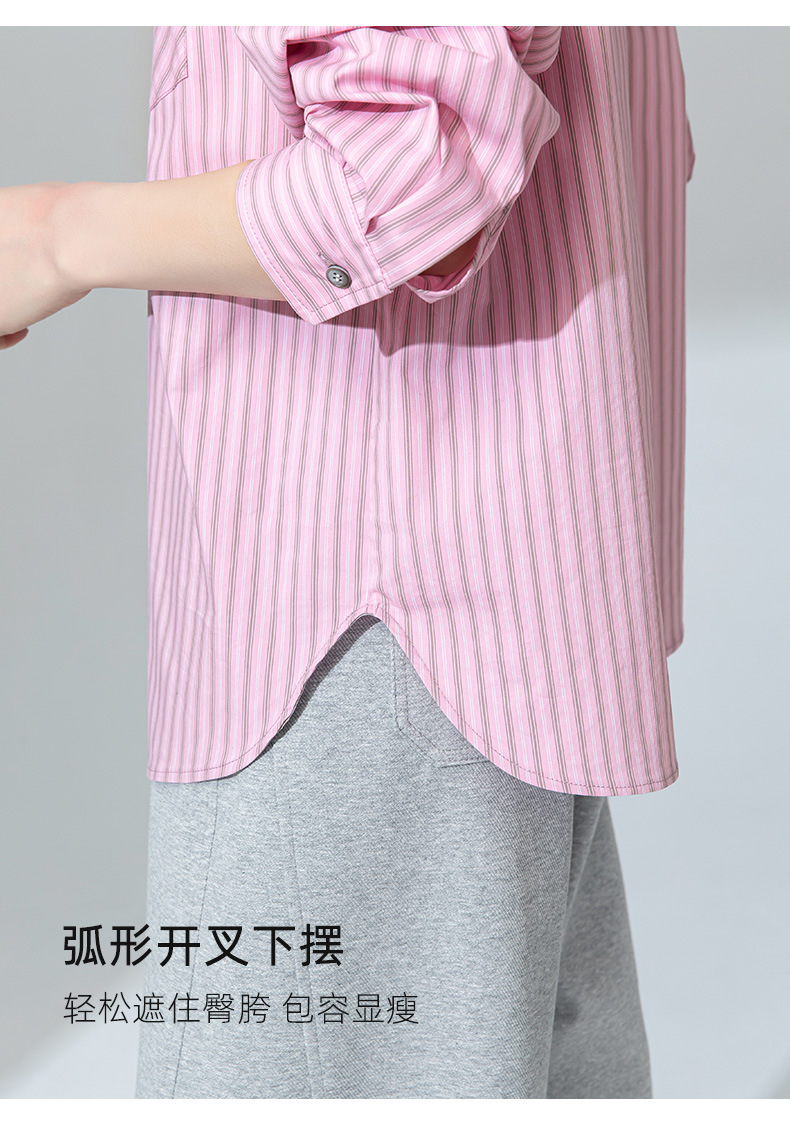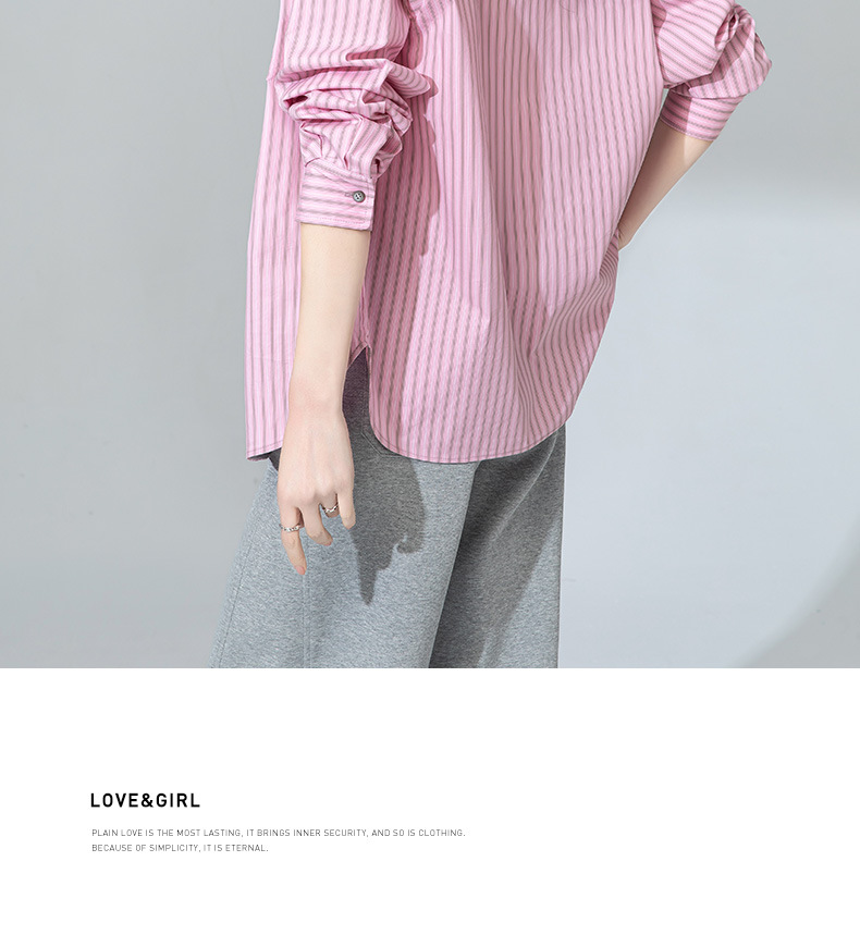 Xinge 이른 봄 셔츠 코트 여성의 새로운 디자인 센스 니쉬 핑크 스트라이프 스택 온 느슨한 게으른 스타일 긴팔 탑