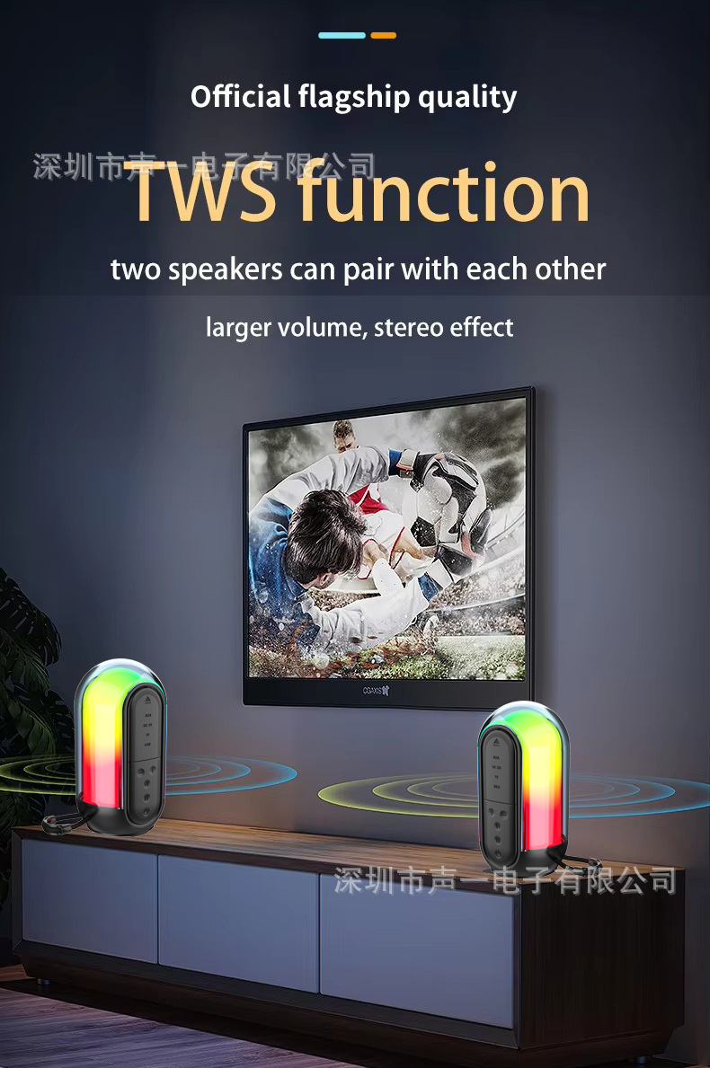 带BT/USB/AUX/TF卡、DC-5V充电(Type-c座)+USB不升压、无屏/无锂电保护电路、TWS+5W单功放、带充电管理4054+带幻彩灯、幻彩灯受M键控制、按键音量