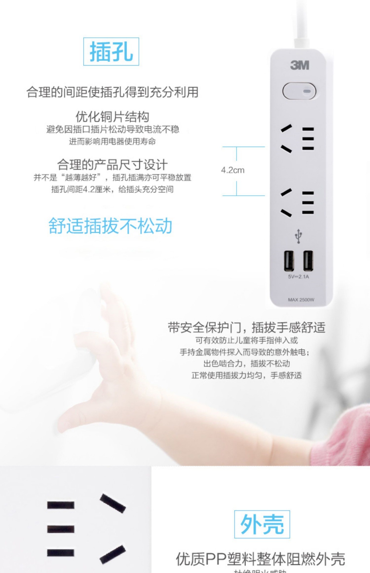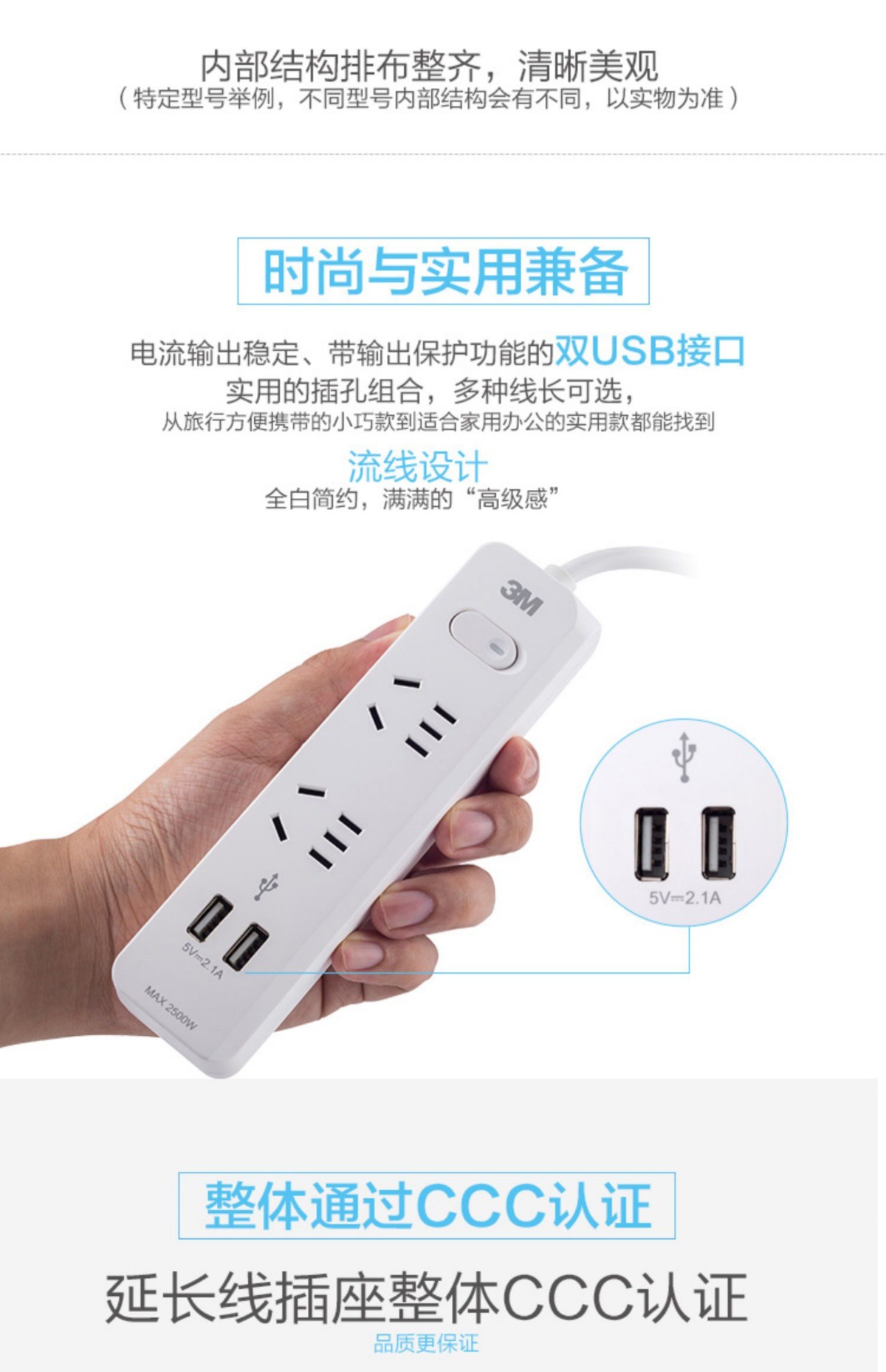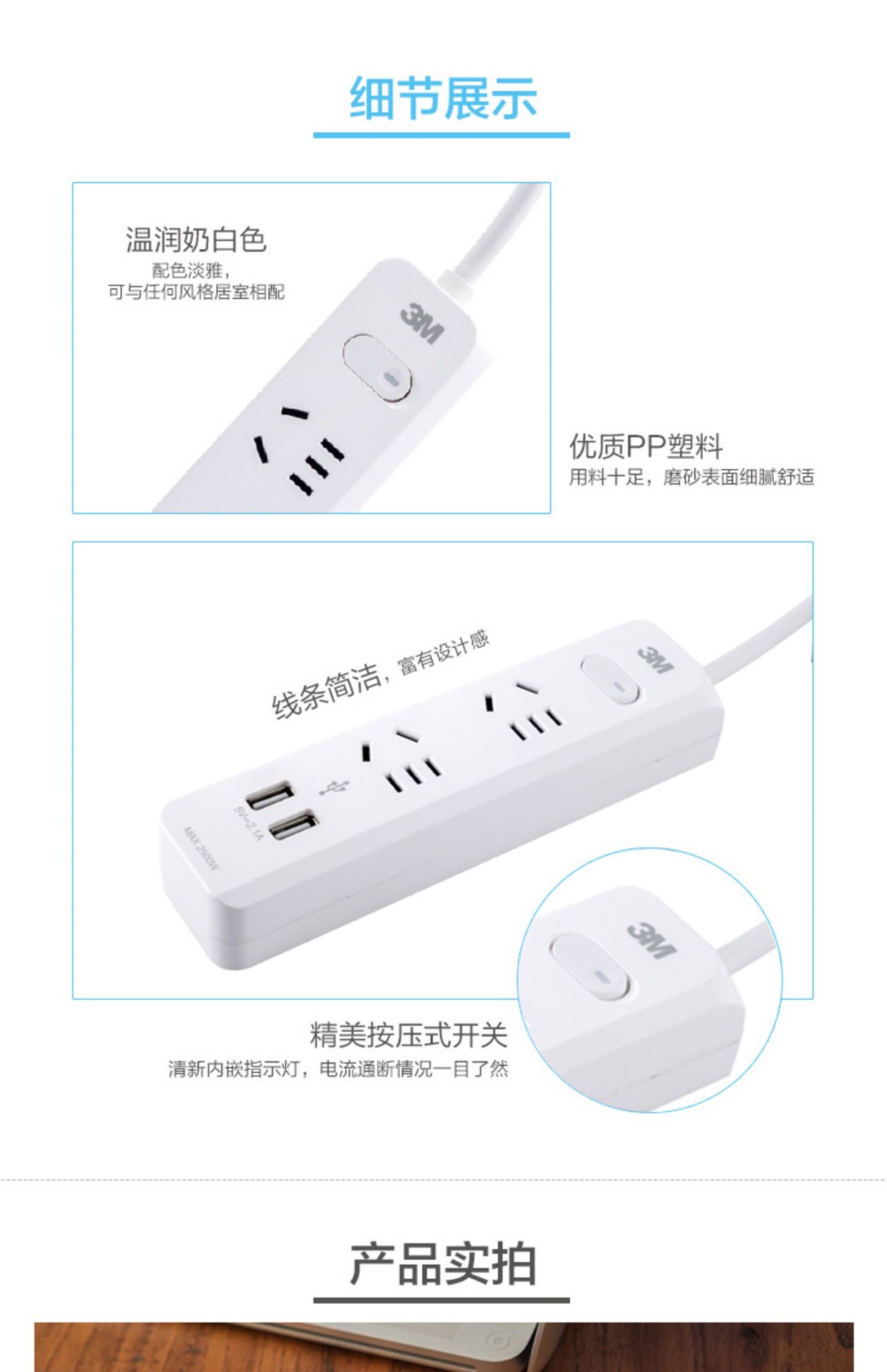 3M 가정용 전원 소켓 USB 플러그 보드 멀티 사용 플러그 6 홀 드로보드 1.8m 전도성 EMD