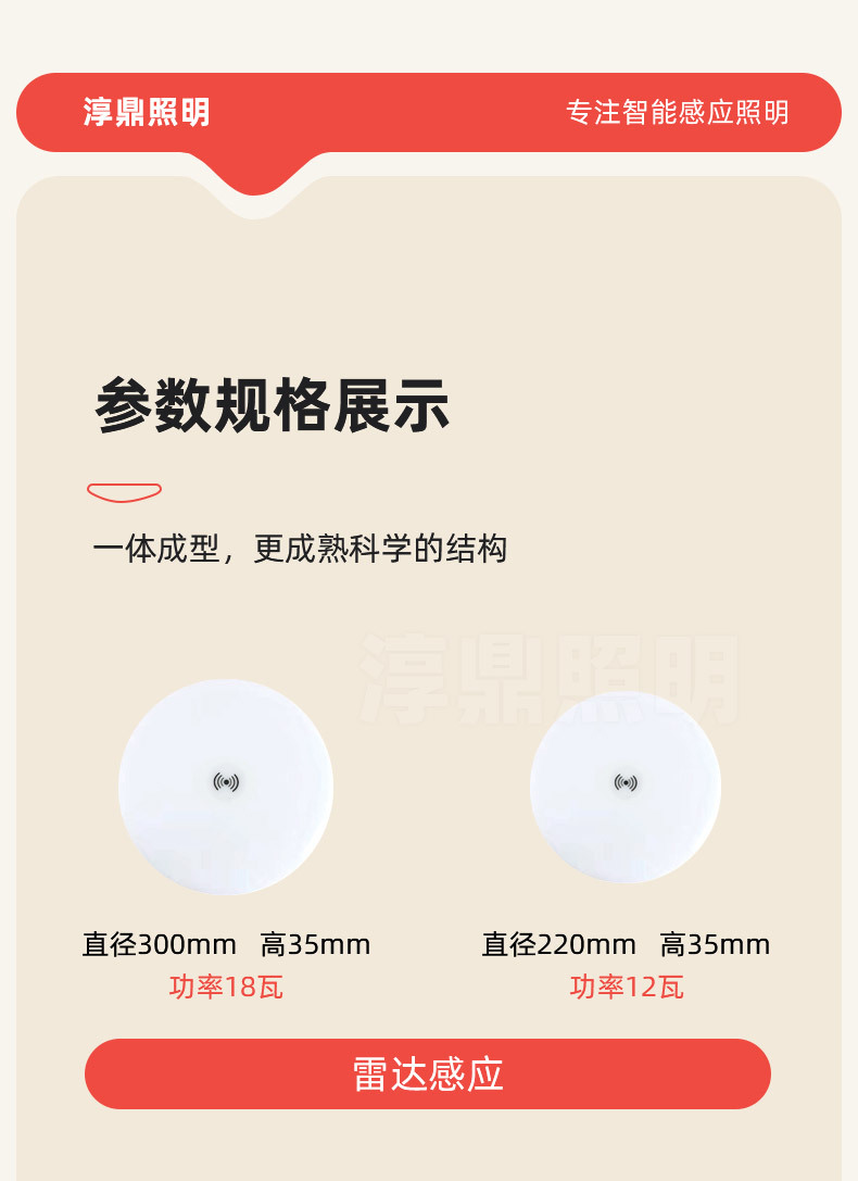 • 레이더 유도, PP, 흰색, 300MM 18W, DOB, 백색광, 주 전원에 연결