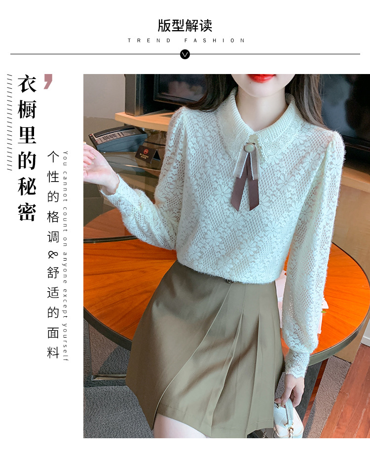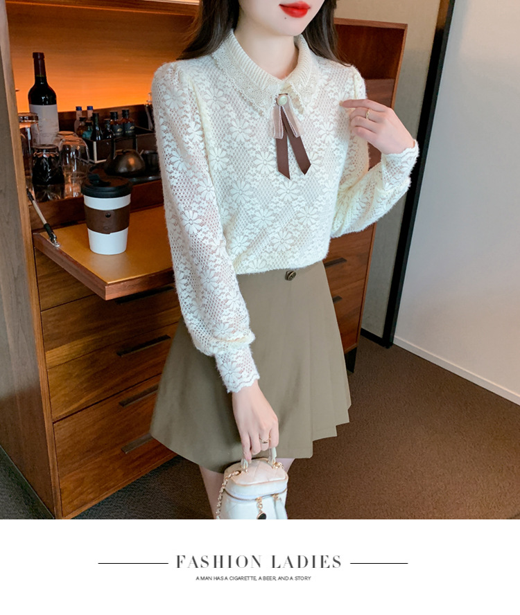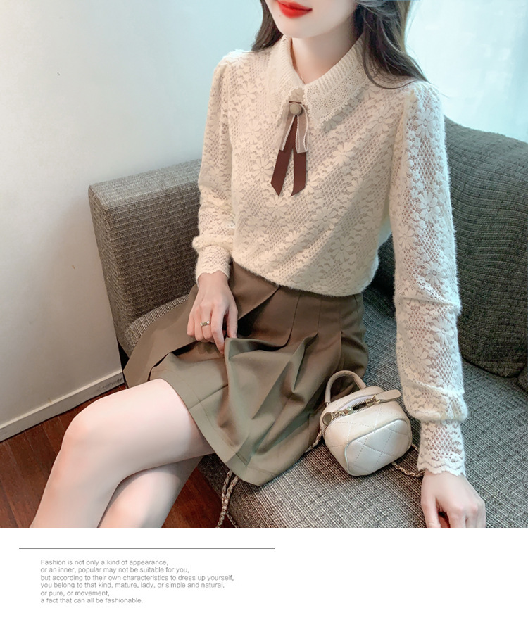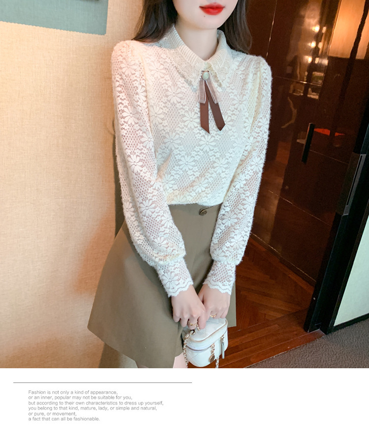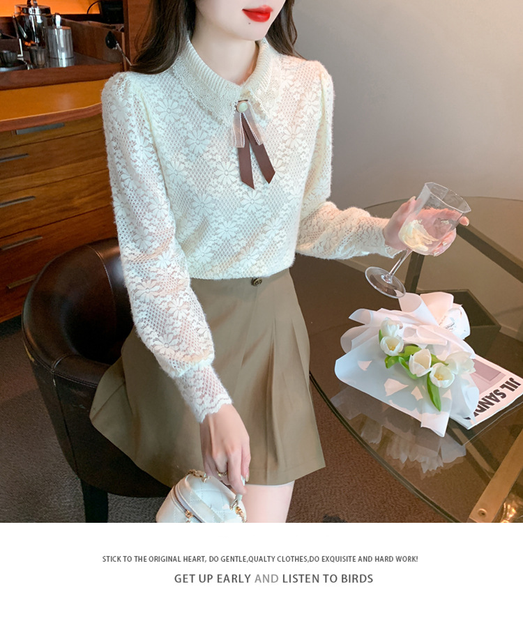 여성 Bowknot 셔츠 2024 겨울 새로운 패션 서양 스타일 틈새 최고의 프랑스 우아한 레이스베이스 셔츠스토어 가기