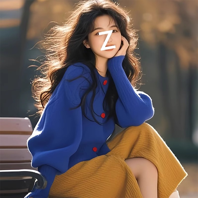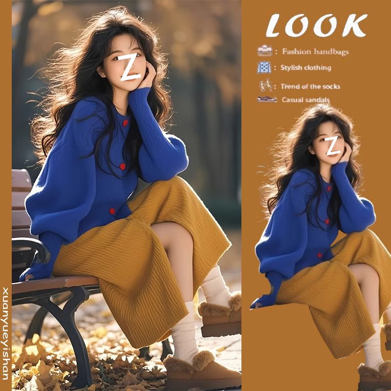 • 블루 가디건 + 카키 스커트 [투피스 세트]