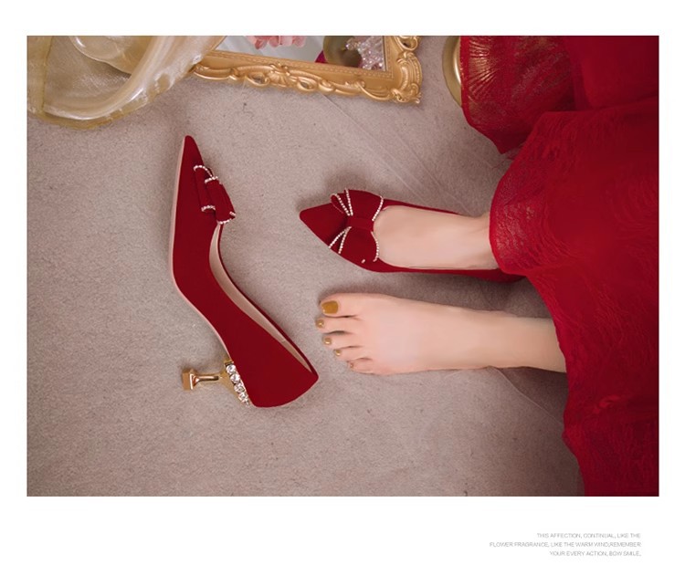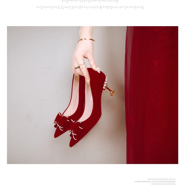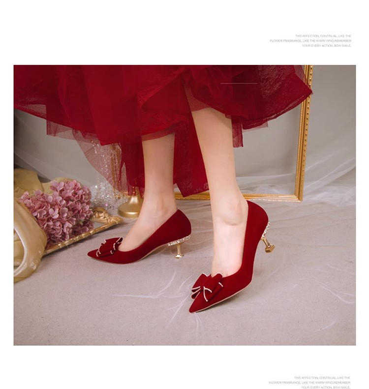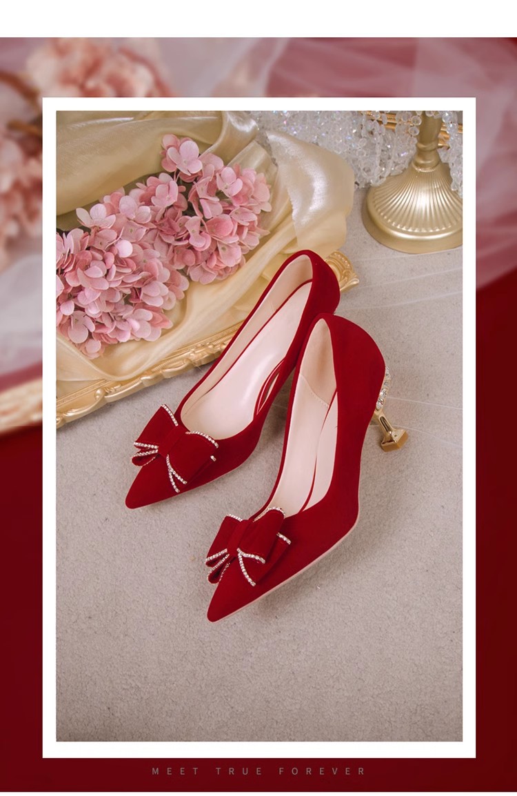 웨딩 슈즈 여성용 레드 스웨이드 신부 신발 중국 스타일 Xiuhe 웨딩 원피스 라인스톤과 나비 넥타이 슈즈가 달린 하이힐 신발스토어 가기