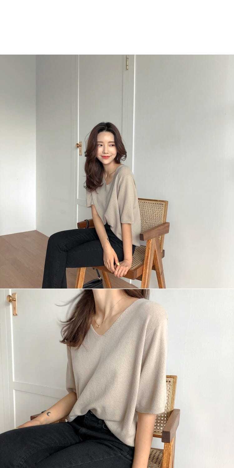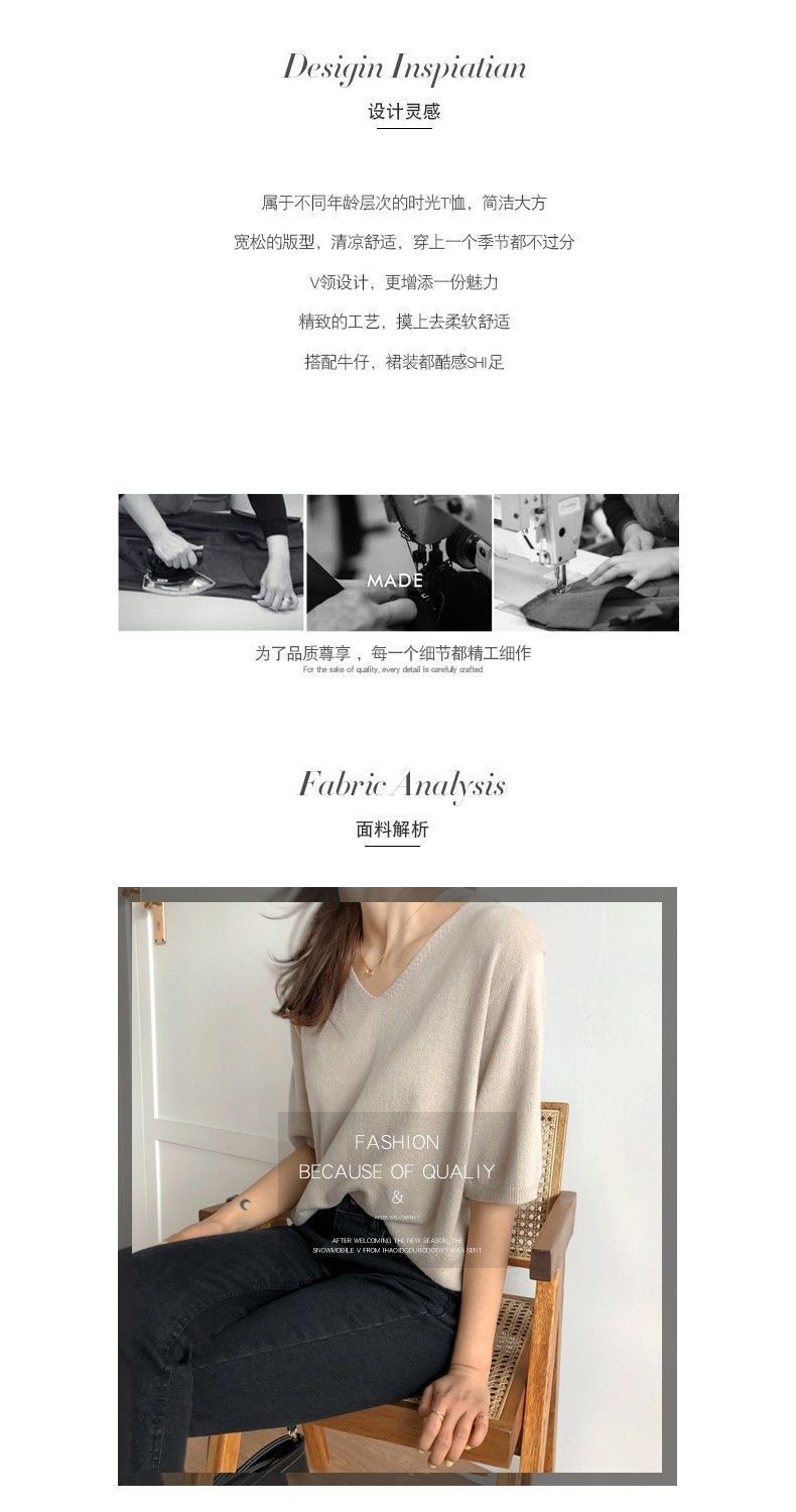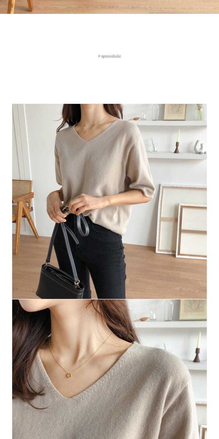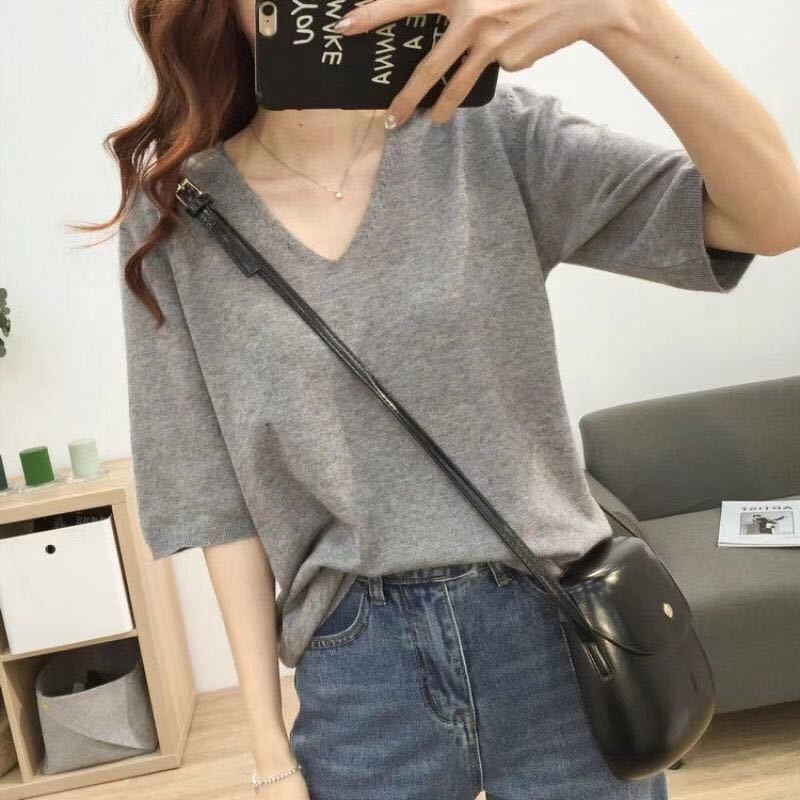 봄 새로운 아이스 실크 니트 스웨터 여성 7 점 슬리브 얇은 여름 V-Neck 외부 착용 느슨한베이스 하프 슬리브 5 점 탑스토어 가기