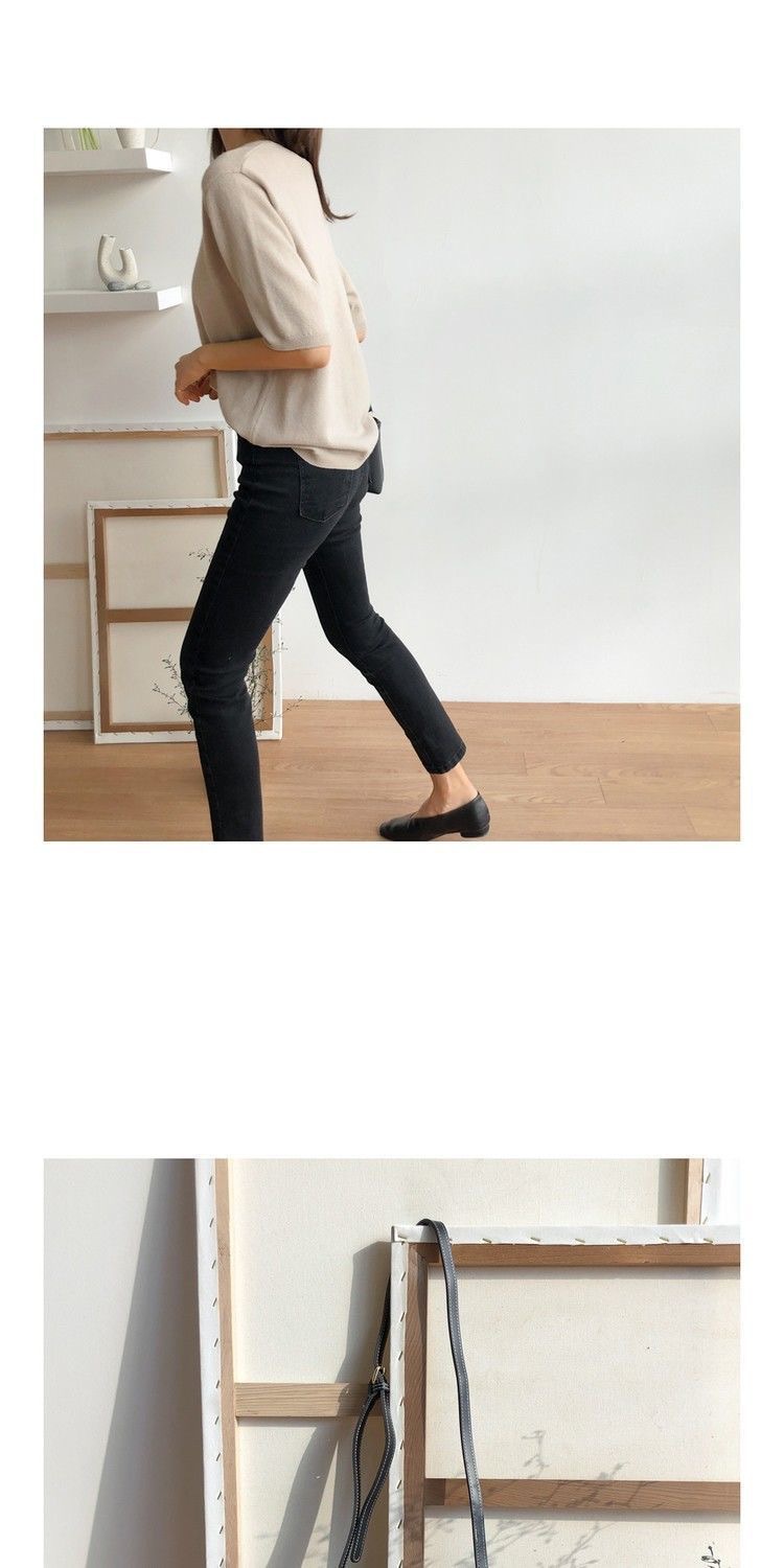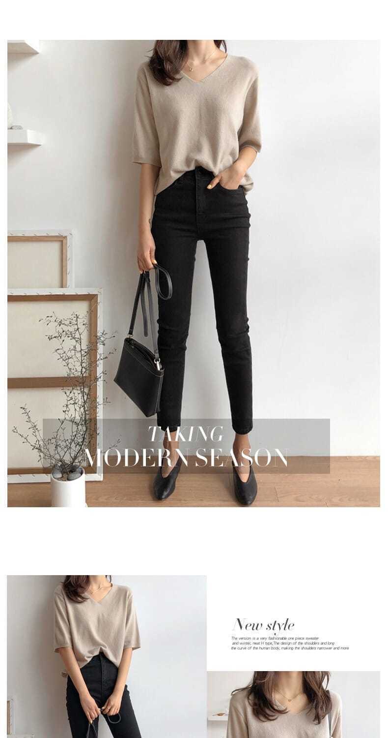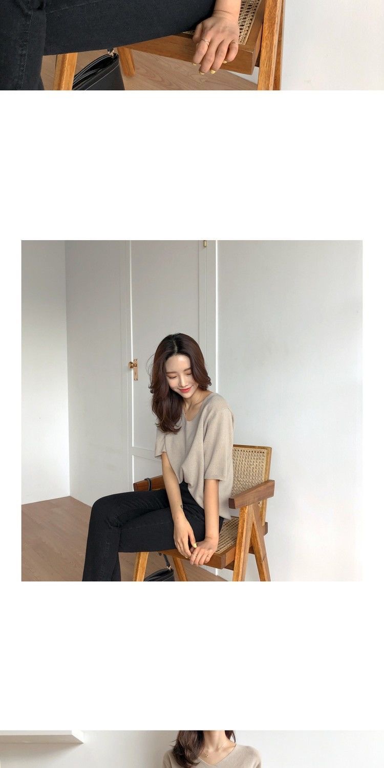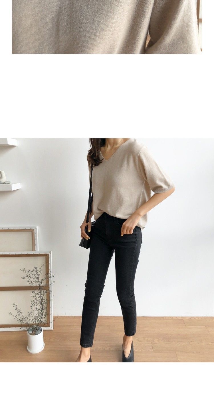 봄 새로운 아이스 실크 니트 스웨터 여성 7 점 슬리브 얇은 여름 V-Neck 외부 착용 느슨한베이스 하프 슬리브 5 점 탑스토어 가기