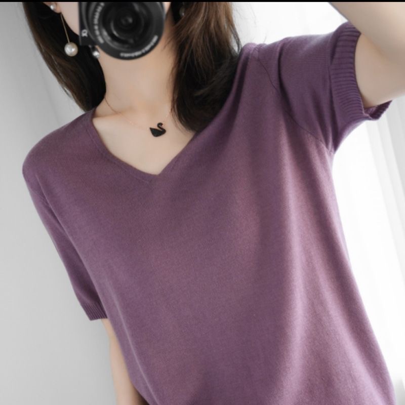 봄 새로운 아이스 실크 니트 스웨터 여성 7 점 슬리브 얇은 여름 V-Neck 외부 착용 느슨한베이스 하프 슬리브 5 점 탑