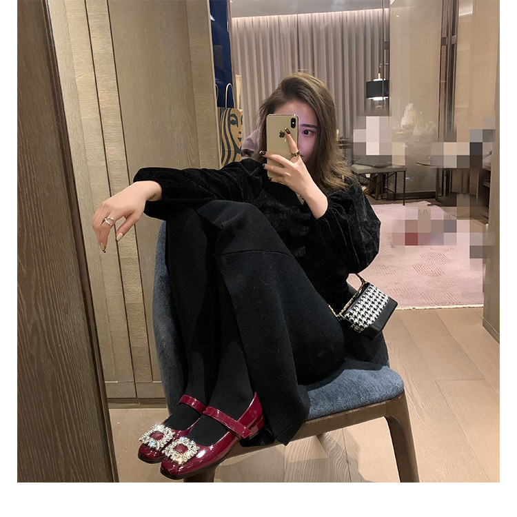재고 프랑스 우아한 통근자 플래시 다이아몬드 스퀘어 버튼 플랫 두꺼운 바닥 두꺼운 가죽 스퀘어 발가락 메리 제인 신발
