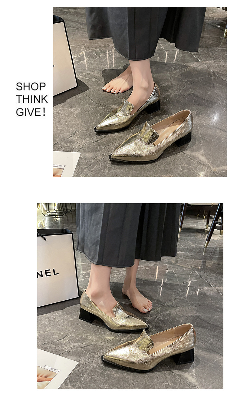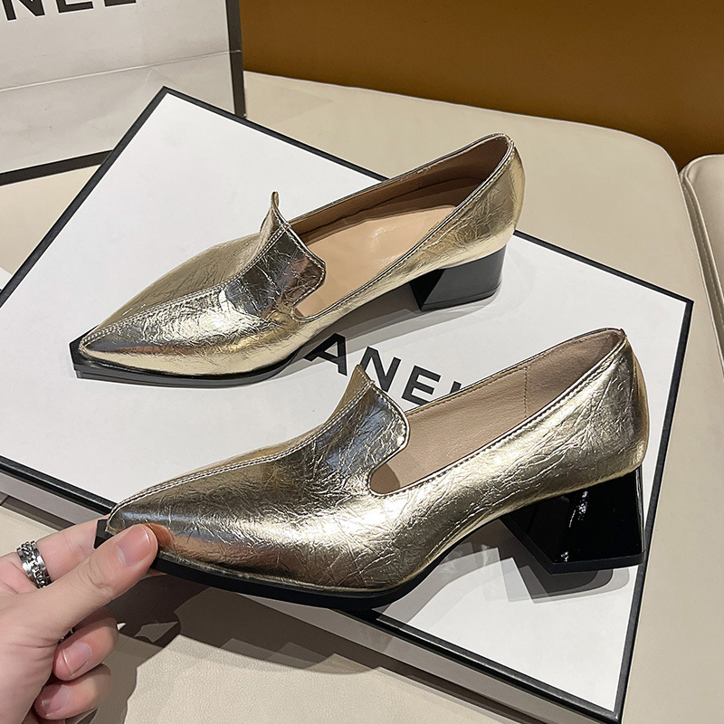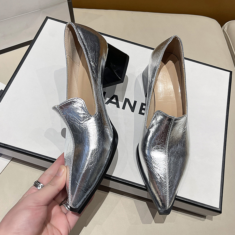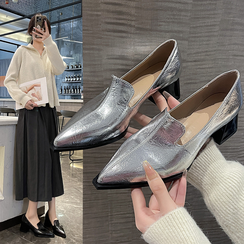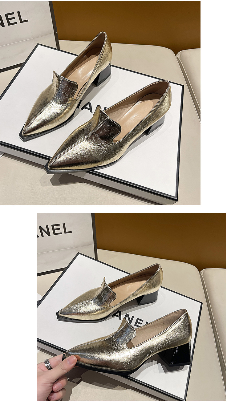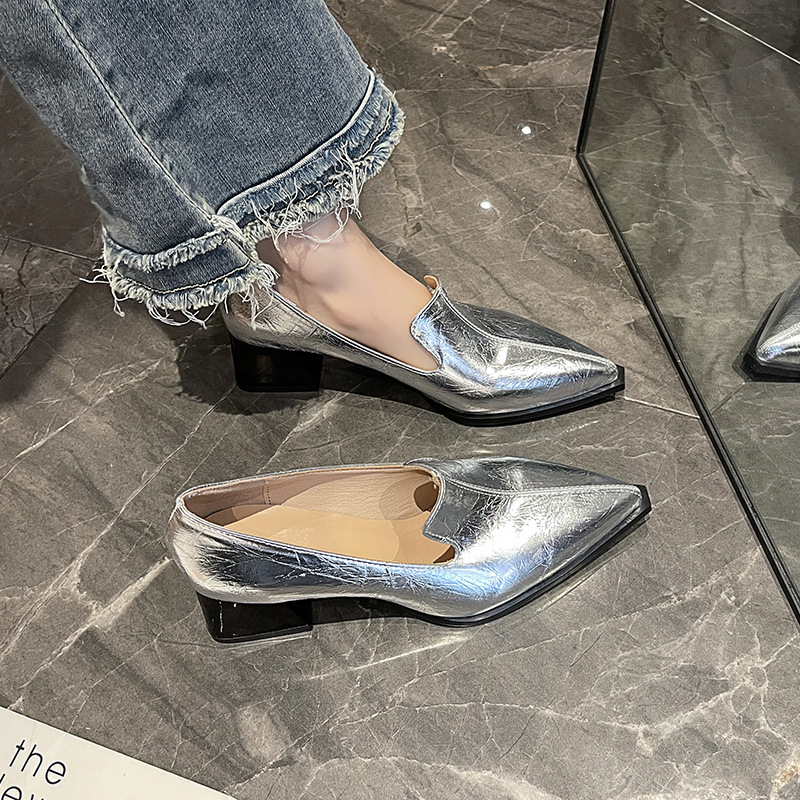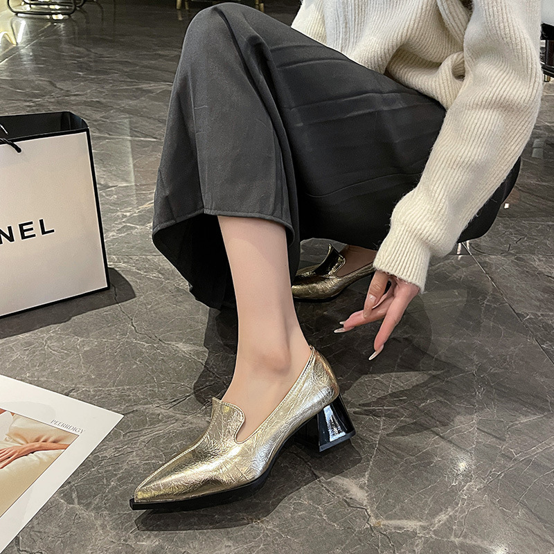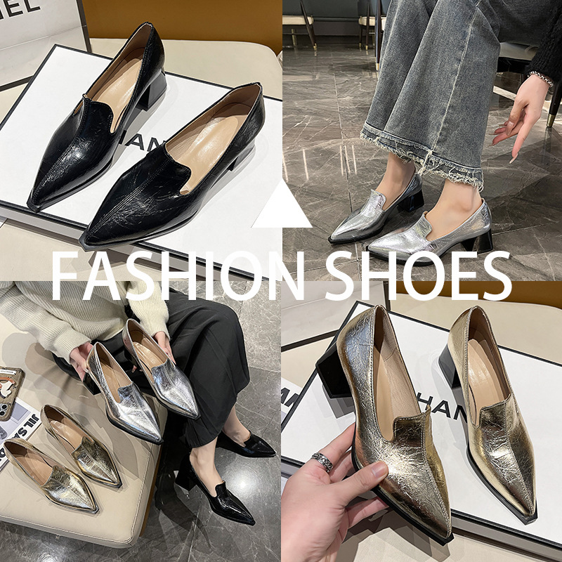 하이힐 2025 봄 새로운 여성 신발 뾰족한 황금 패션 신발 두꺼운 힐 미드 힐 패션 신발 실버 깊은 입 싱글 신발스토어 가기