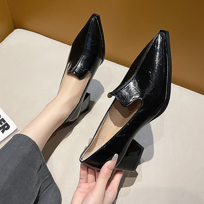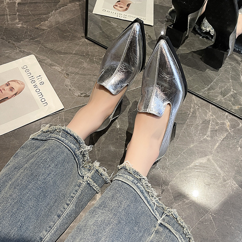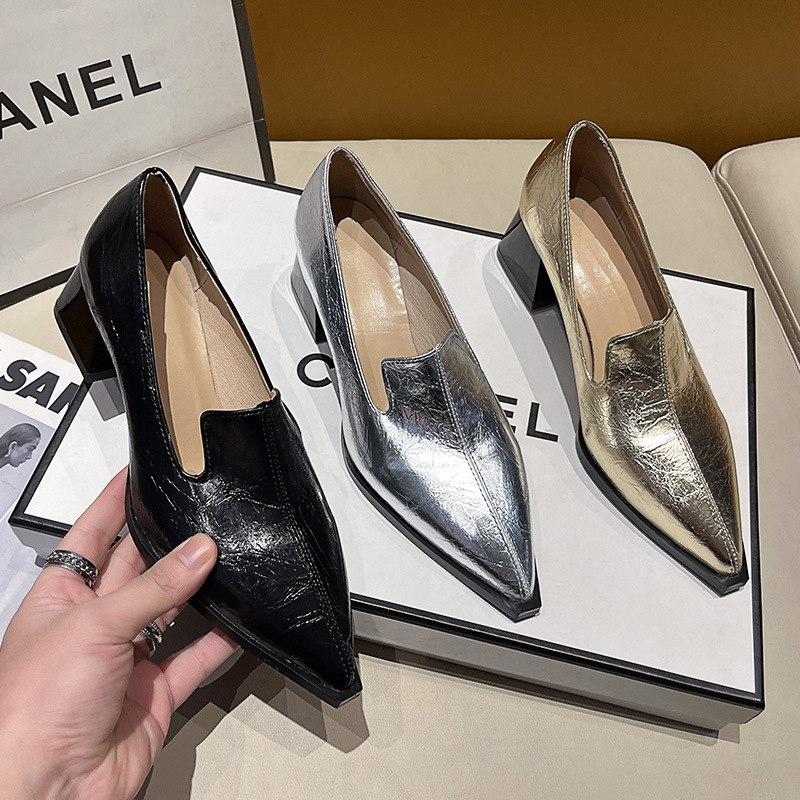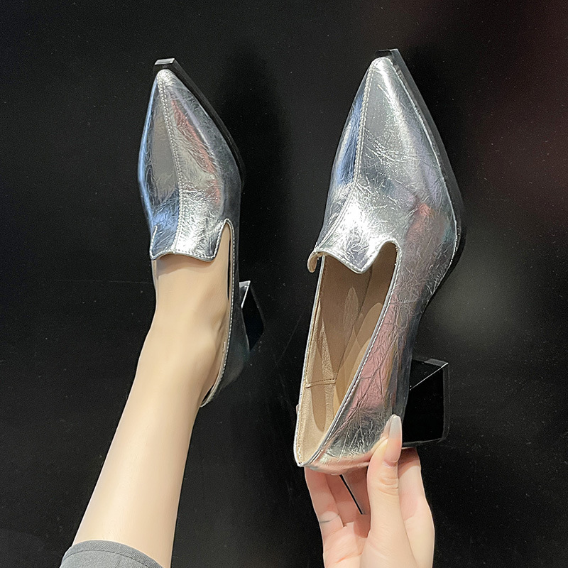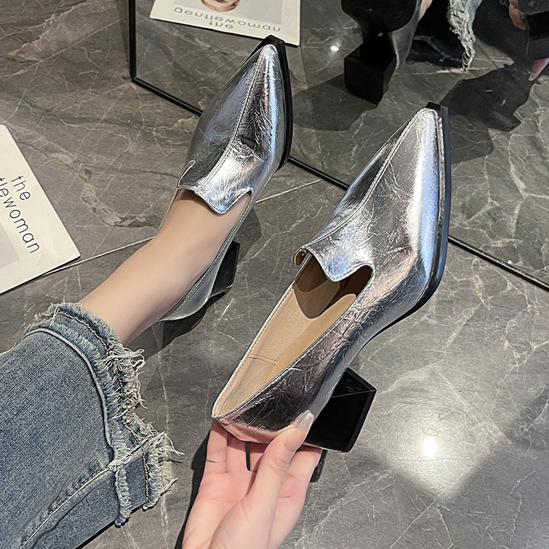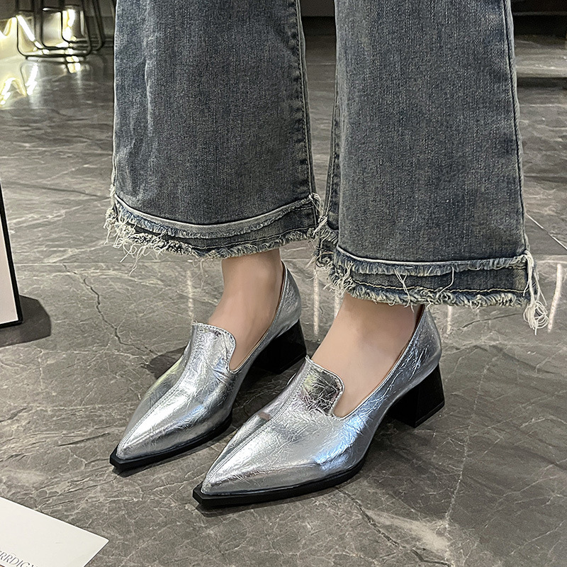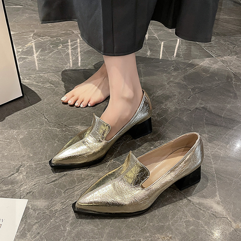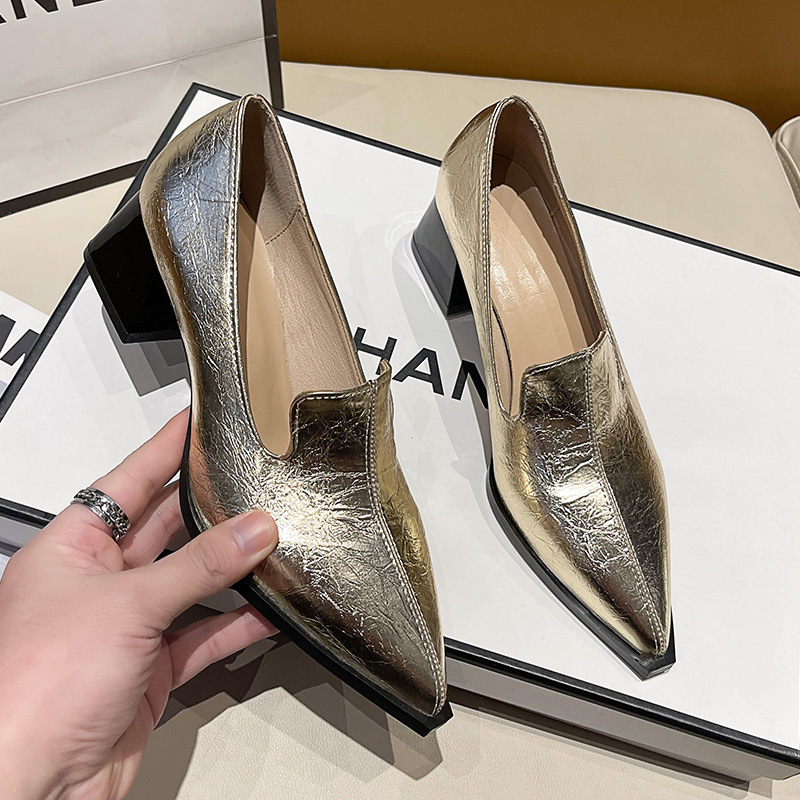 하이힐 2025 봄 새로운 여성 신발 뾰족한 황금 패션 신발 두꺼운 힐 미드 힐 패션 신발 실버 깊은 입 싱글 신발