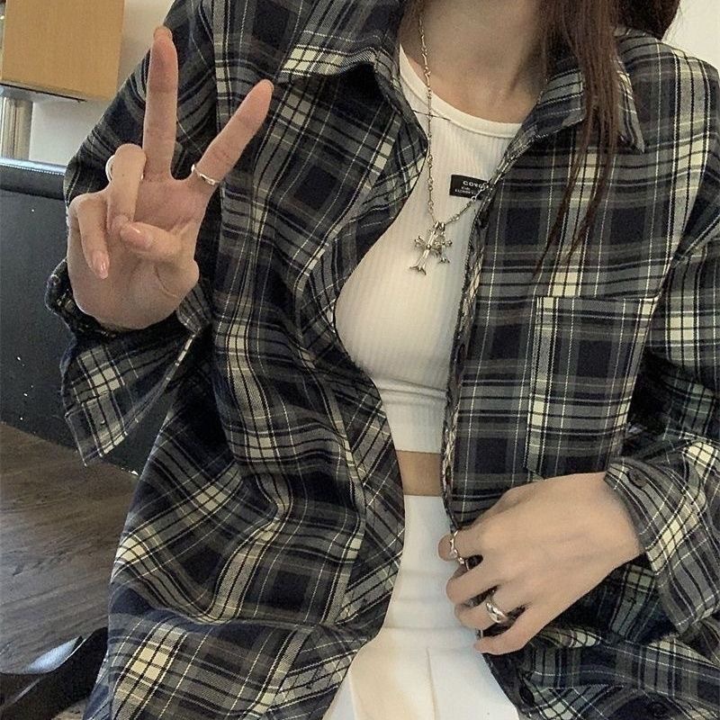 디자인 센스 틈새 긴 소매 셔츠 여성의 봄과 가을 빈티지 체크 셔츠 재킷 느슨한 캐주얼 폴로 칼라 탑 트렌디
