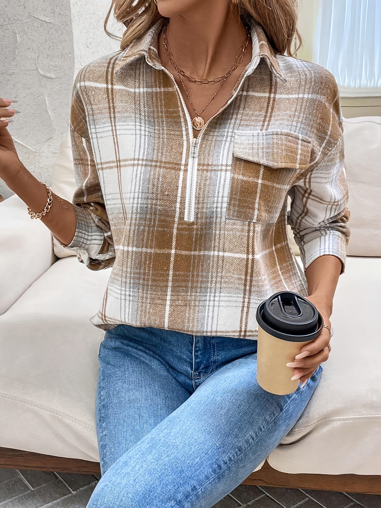 유럽과 미국의 아마존 국경 간 격자 무늬 포켓 하프 오픈 지퍼 라 캐주얼 셔츠 여성 독립 스테이션 AliExpress