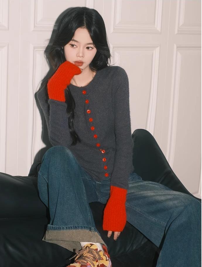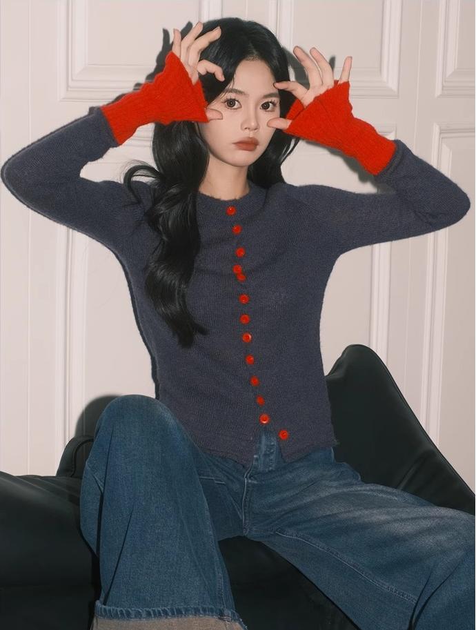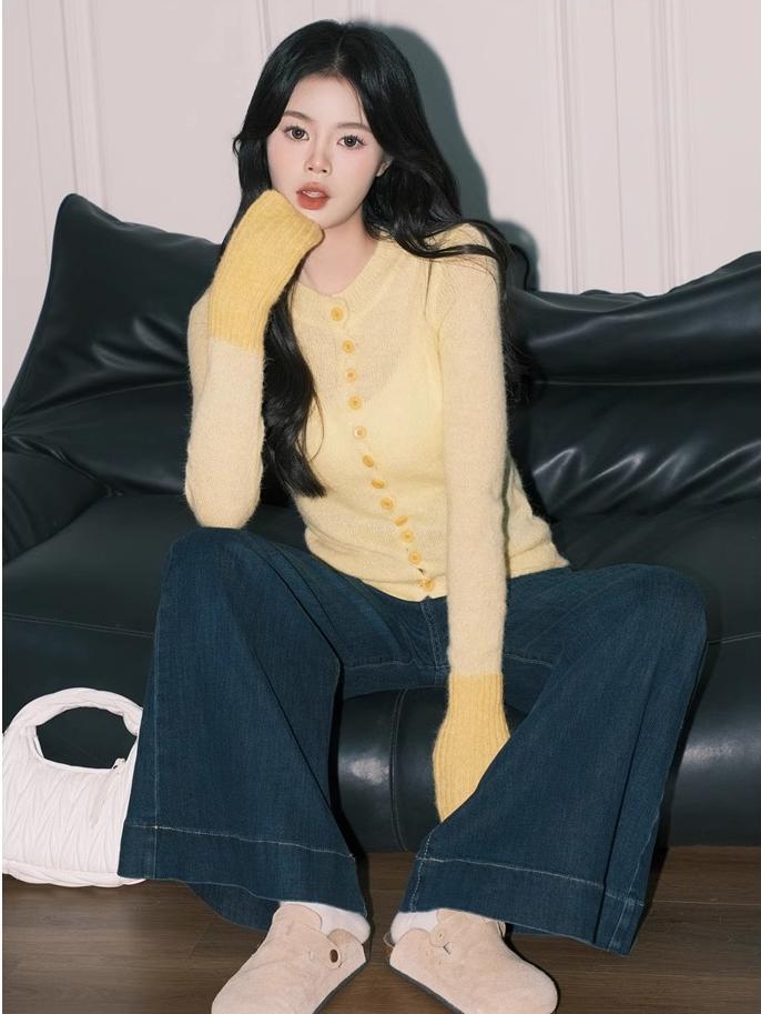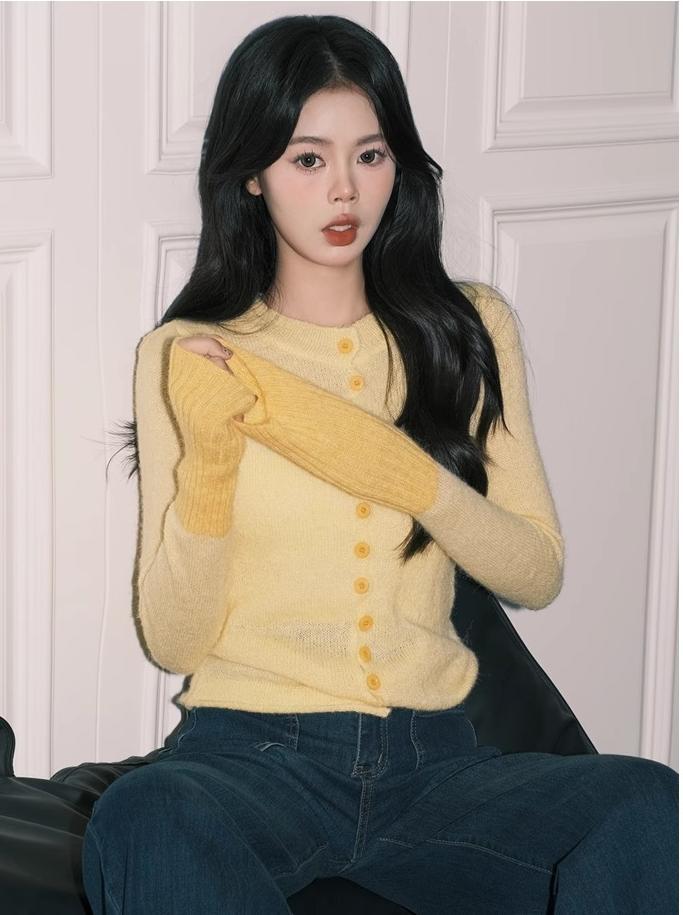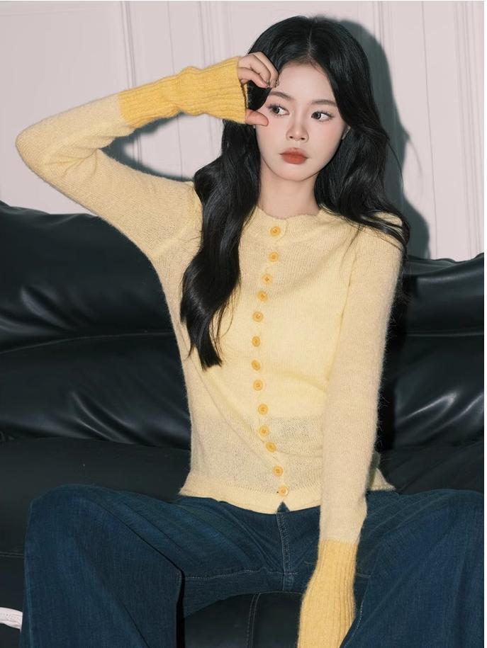 부드러운 Waxy Chic 거위 노란색 스티칭 니트 카디건 여성의 가을 게으른 긴팔 슬림 핏 탑스토어 가기