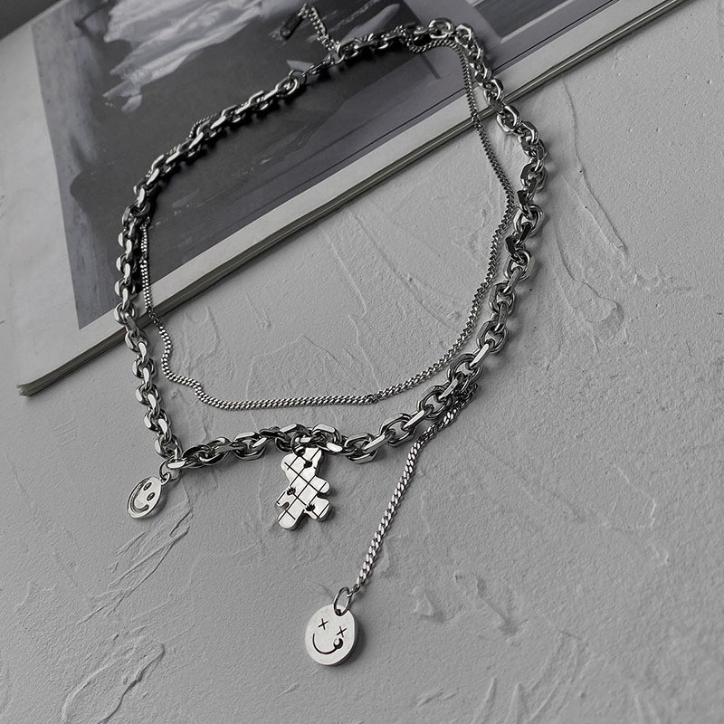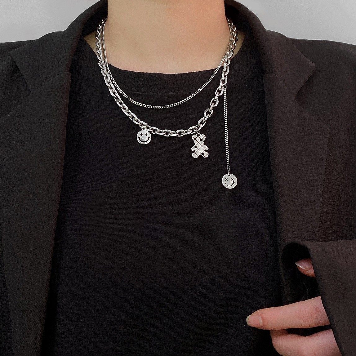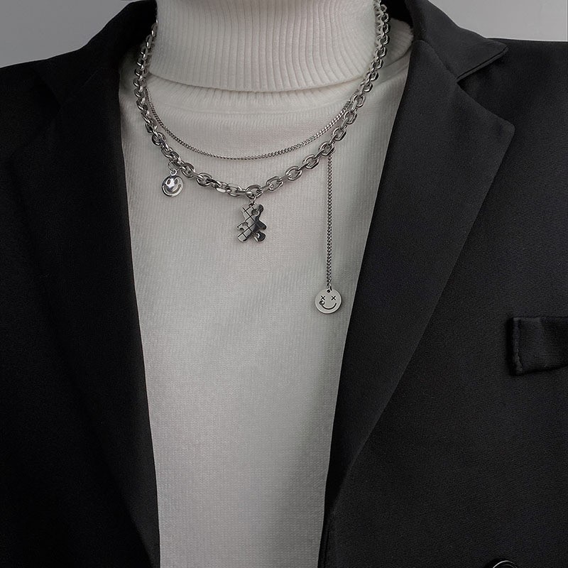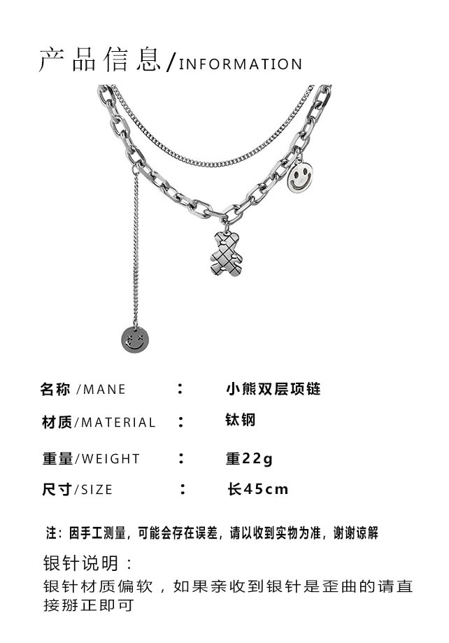 한국 틈새 티타늄 스틸 더블 레이어 귀여운 곰 목걸이 여성의 세련된 독특한 웃는 얼굴 펜던트 짧은 스웨터 체인스토어 가기