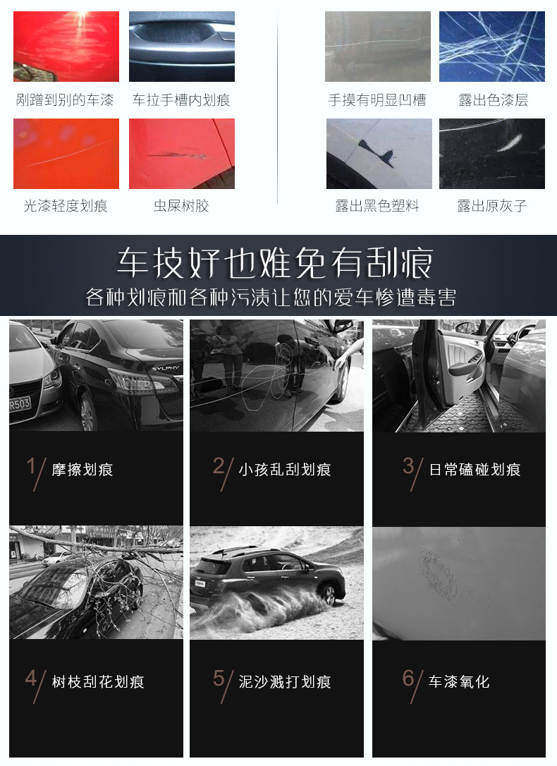 1,修复布主要针对漆面轻微痕处理【如指甲痕,浅层擦撞痕,沙粒磨痕等】较深的划痕【不伤漆】用力多擦几分钟也可以有一定的淡化效果!