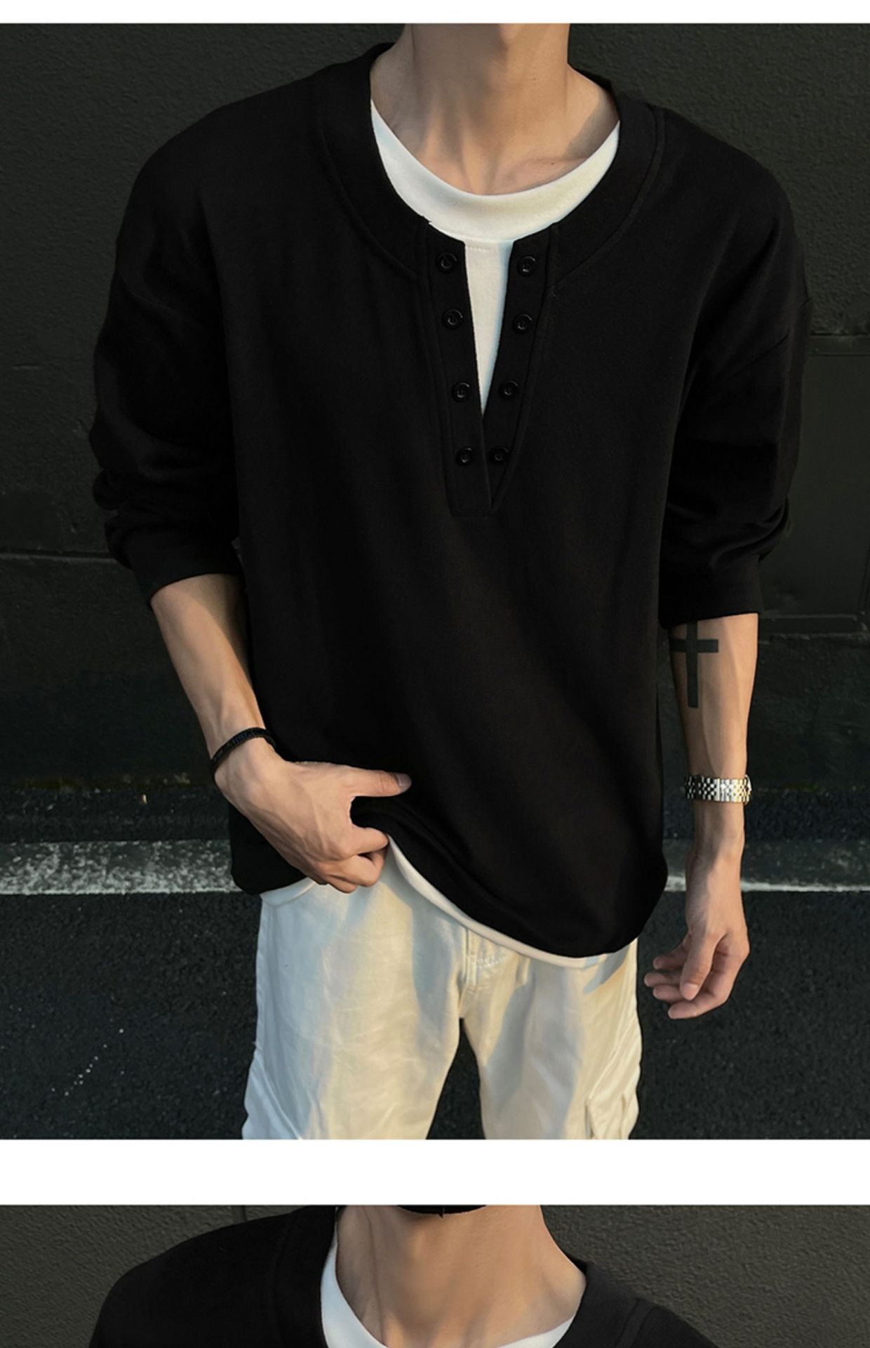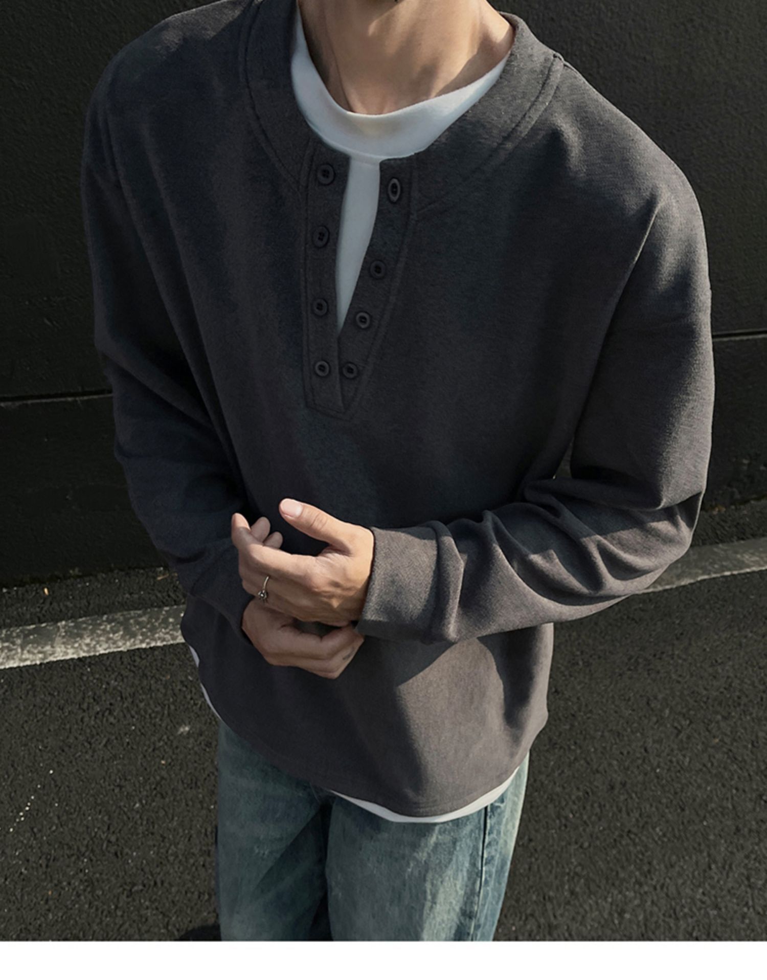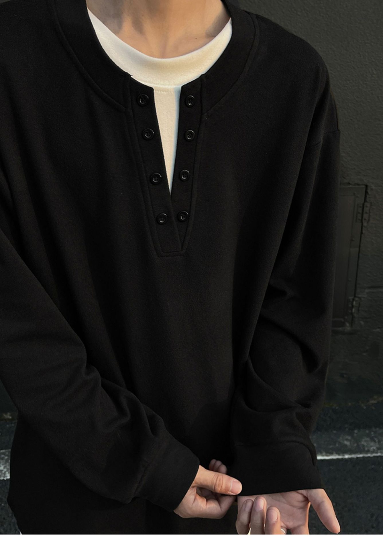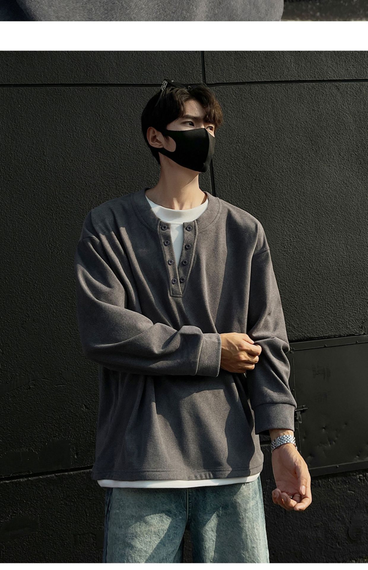 양면 벨벳 헨리 칼라 긴팔 티셔츠 남자 가을 겨울 미국 패션 브랜드 Ins 가짜 투피스 듀플렉스 핸즈섬 내베이스 셔츠스토어 가기