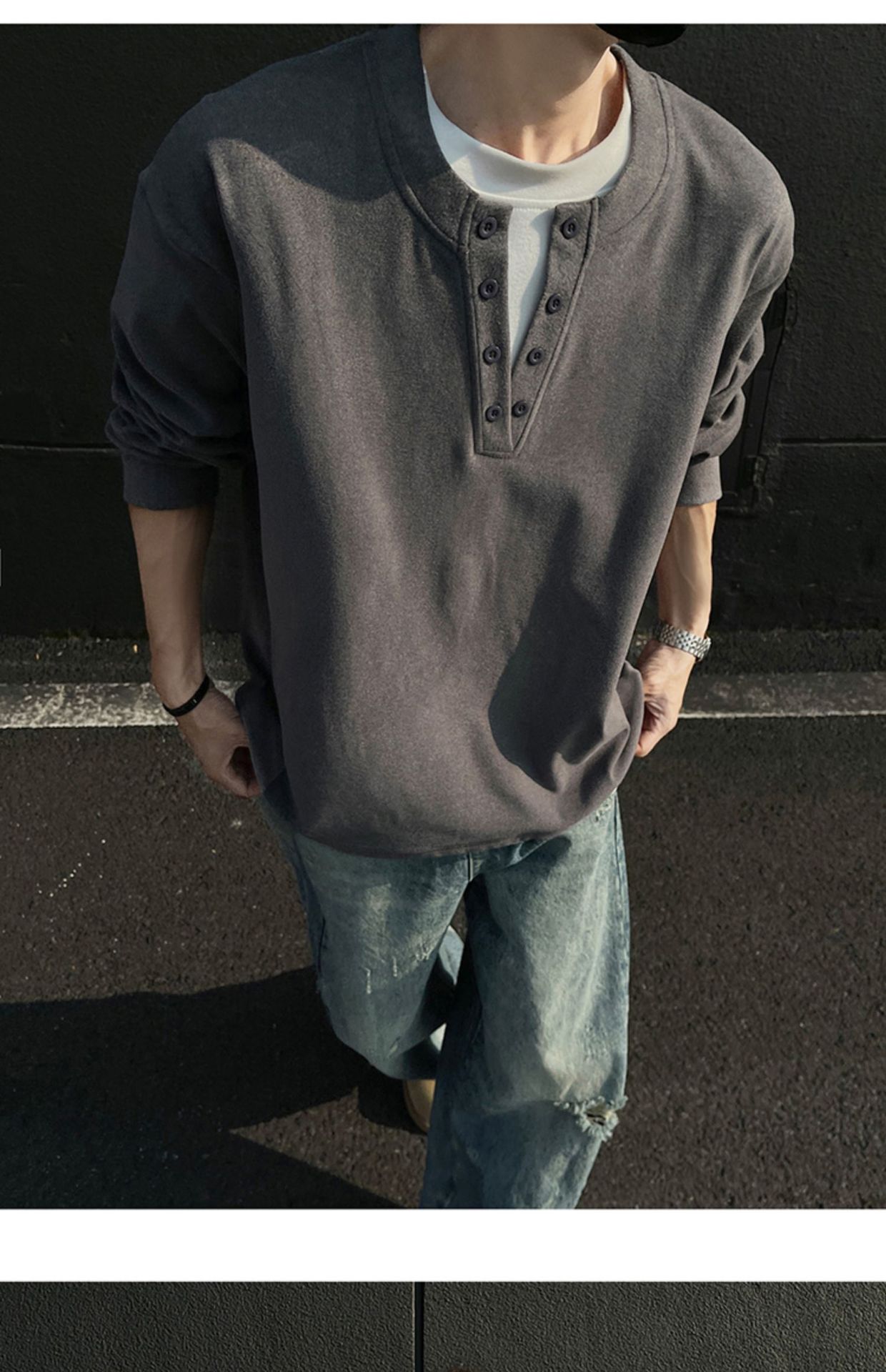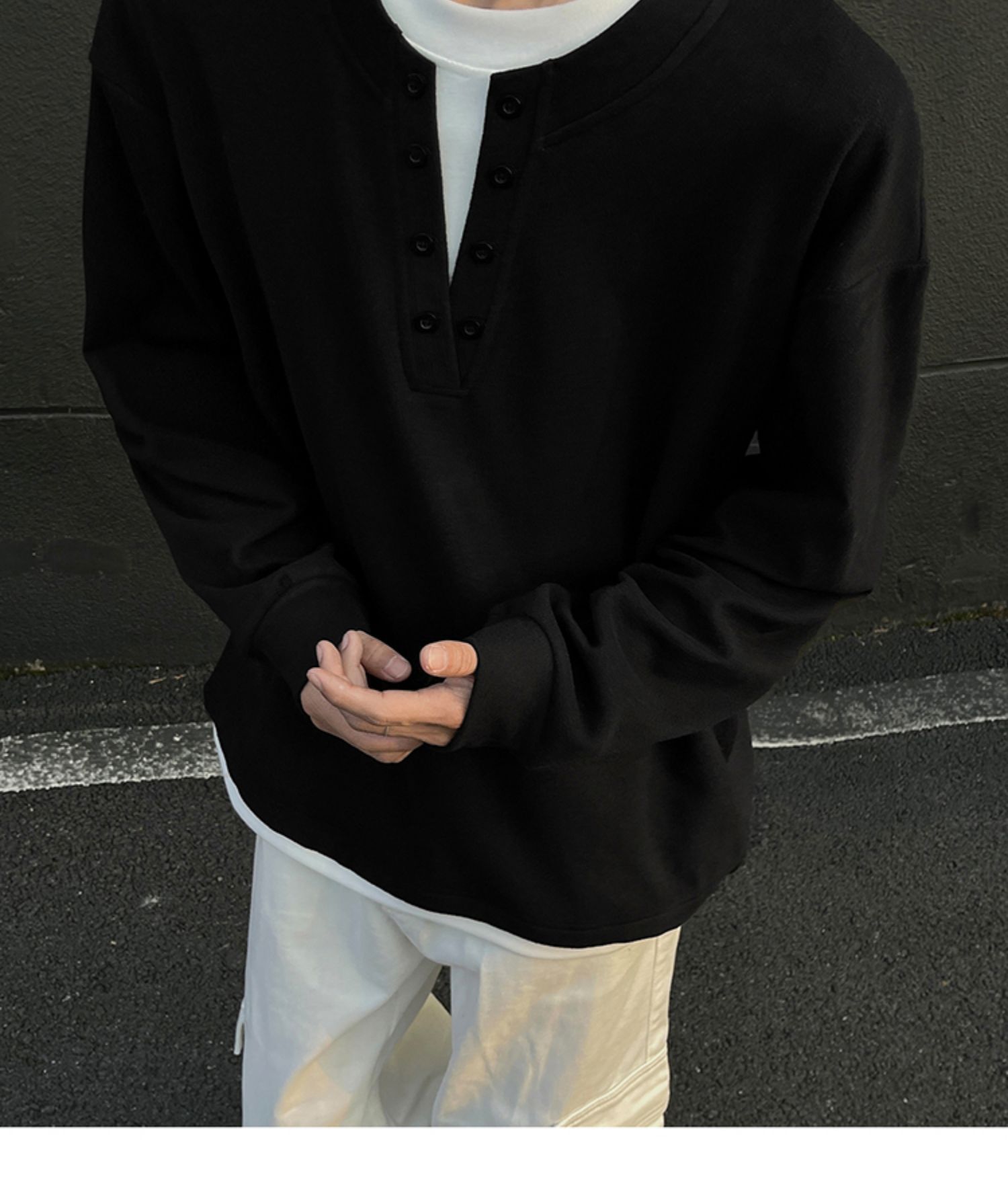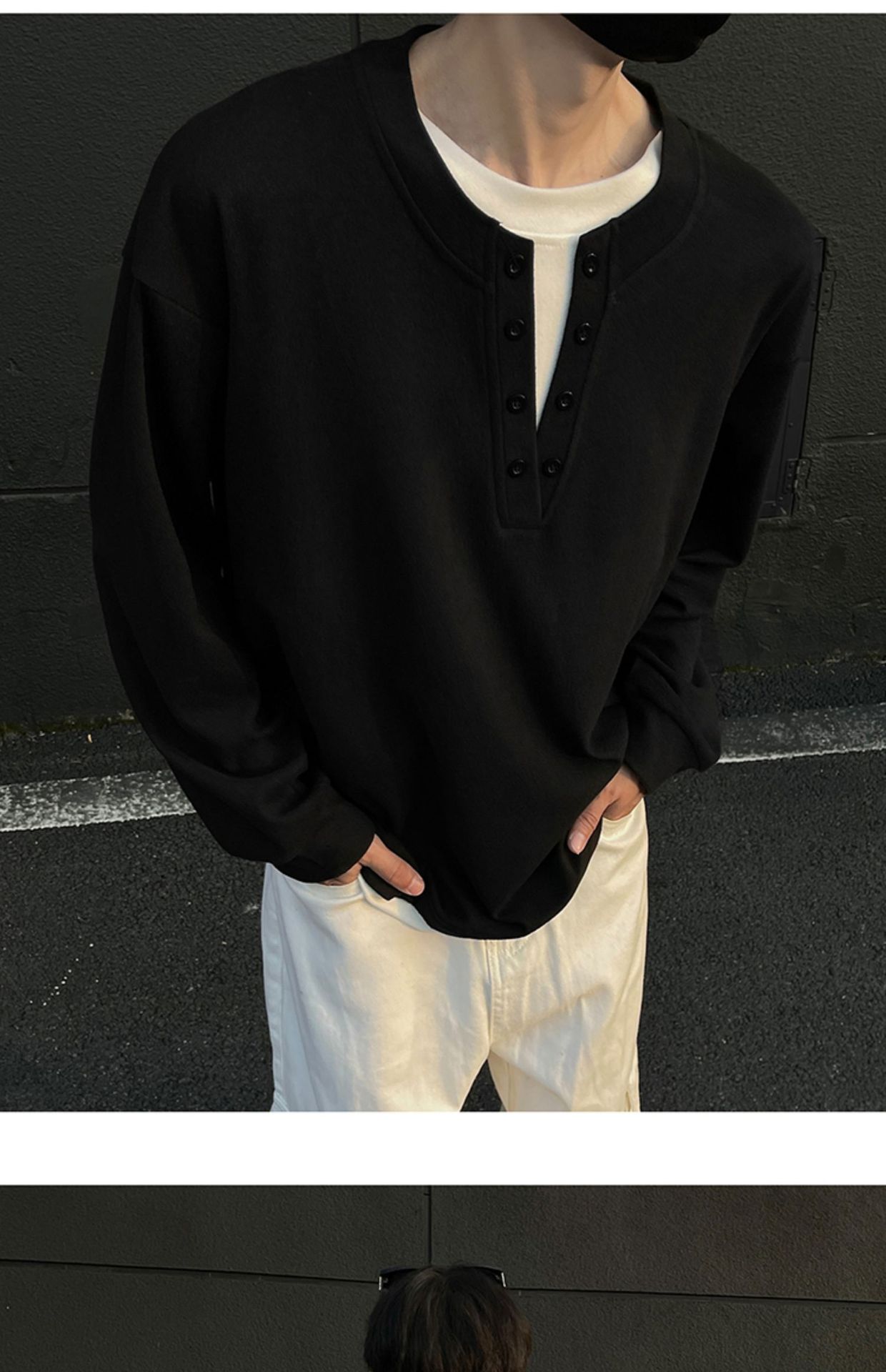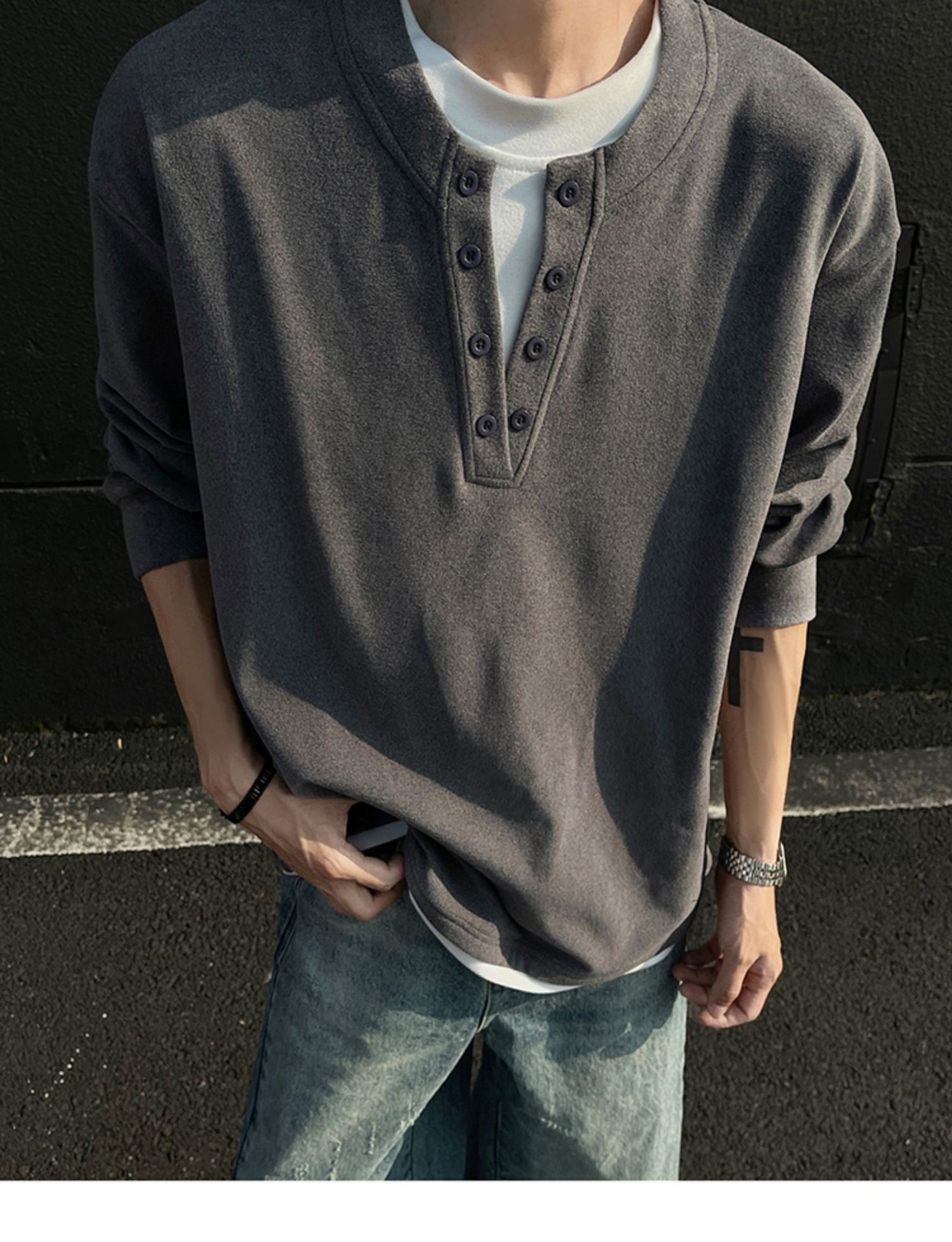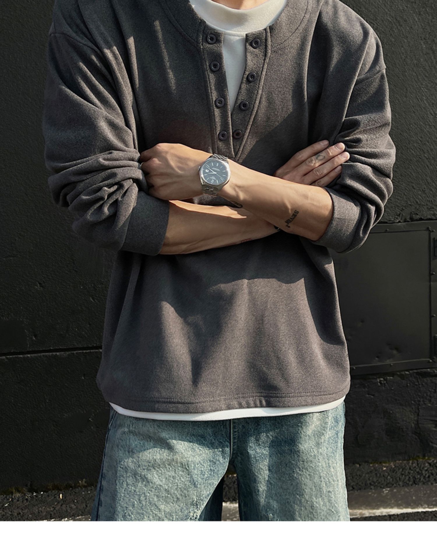 양면 벨벳 헨리 칼라 긴팔 티셔츠 남자 가을 겨울 미국 패션 브랜드 Ins 가짜 투피스 듀플렉스 핸즈섬 내베이스 셔츠스토어 가기