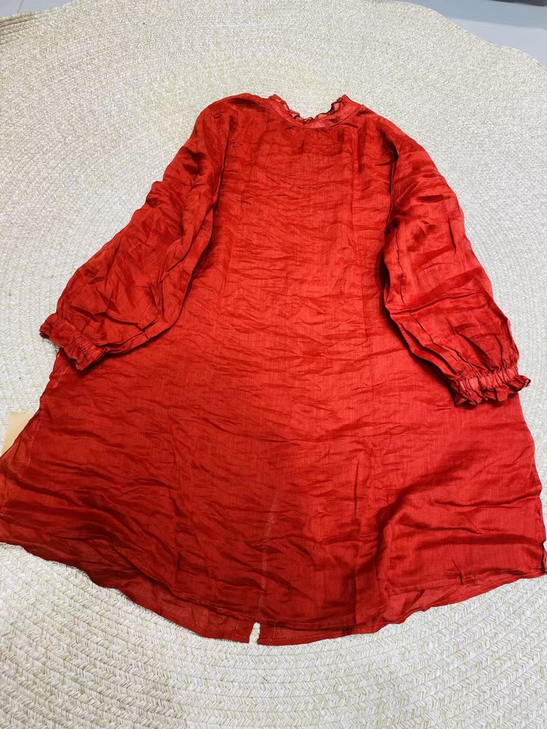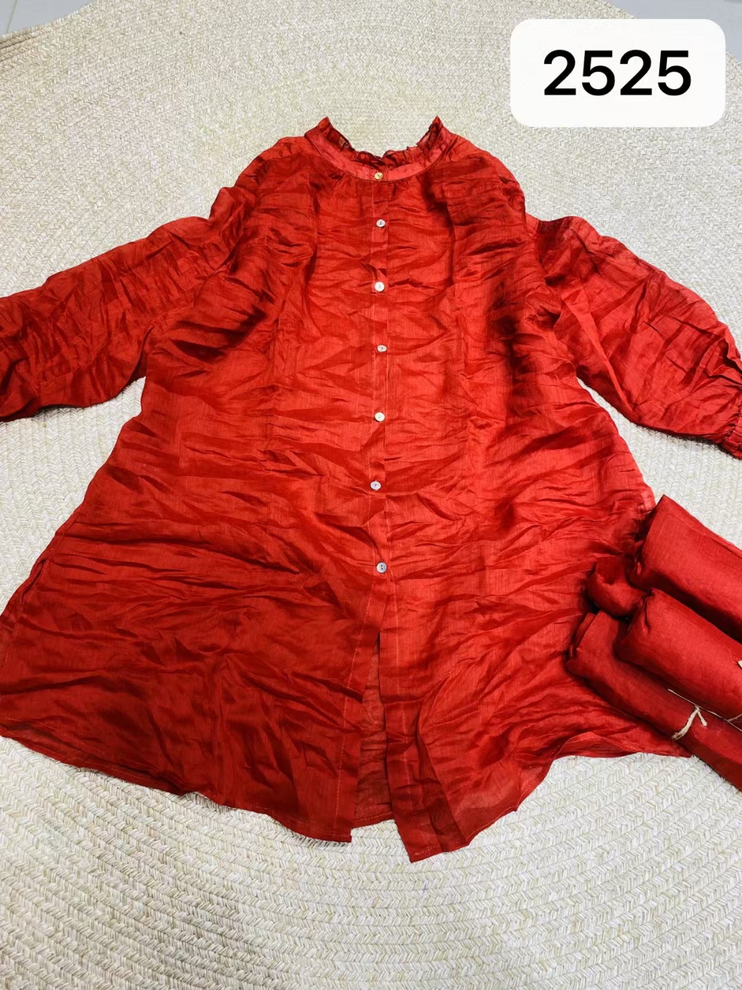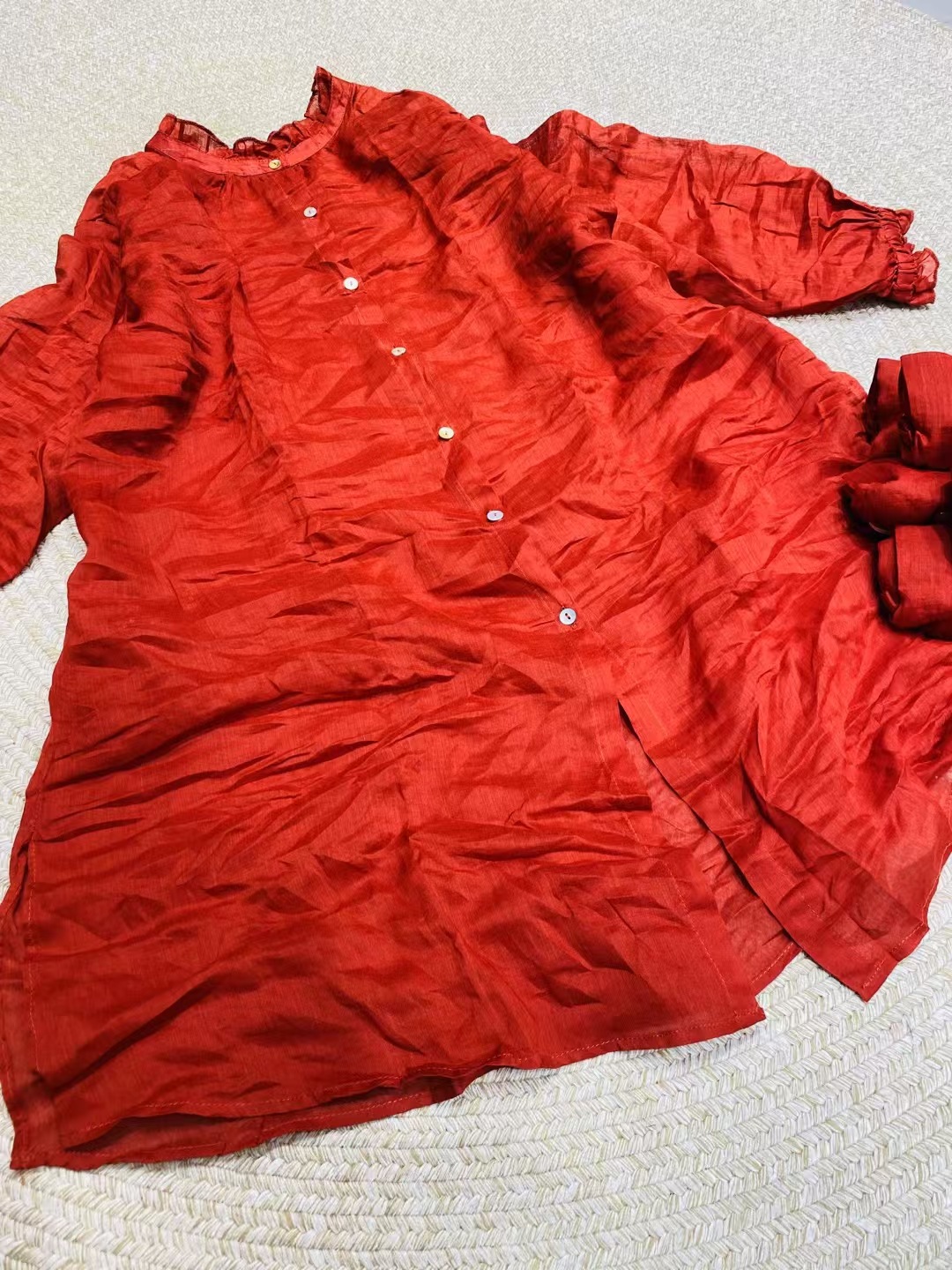 Ramie Ear Blouse 여자 중간 길이 2025 봄 새로운 느슨한 올매치 레드 예술적 새해 원피스스토어 가기