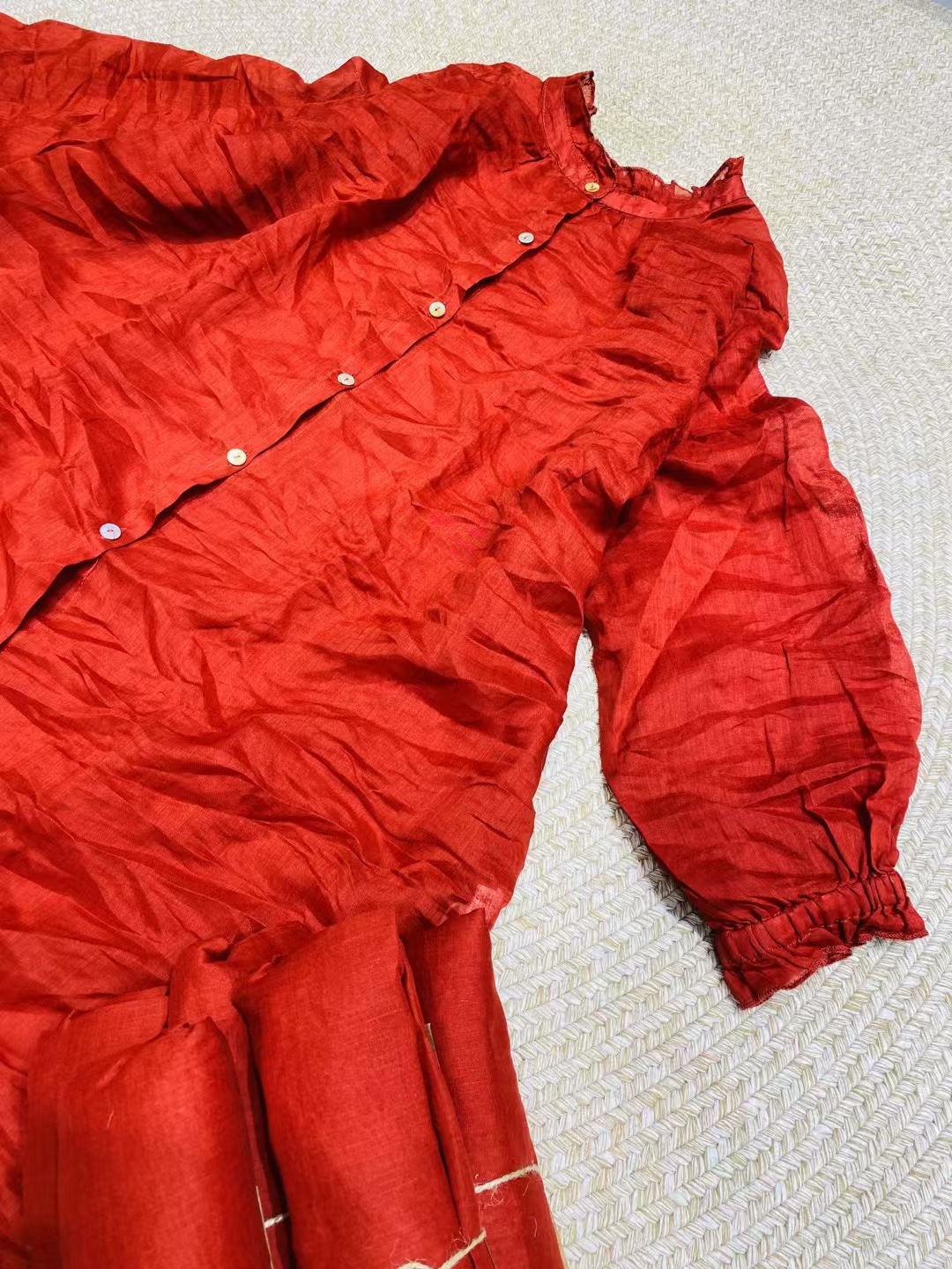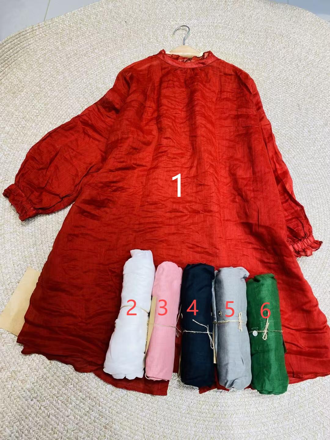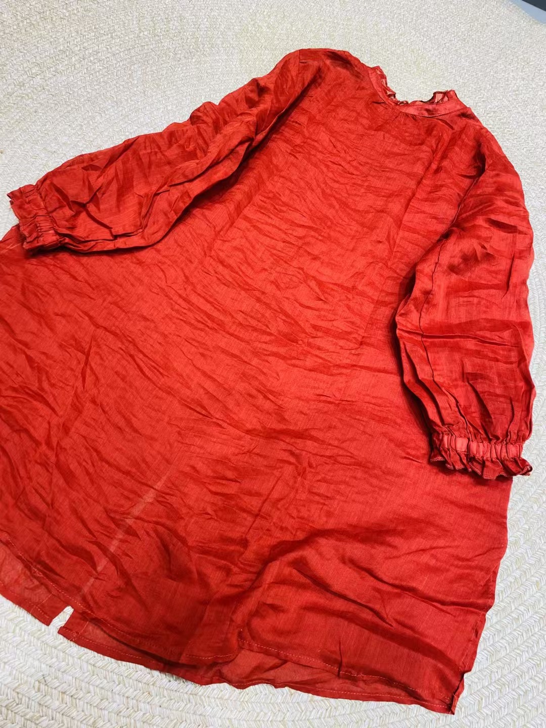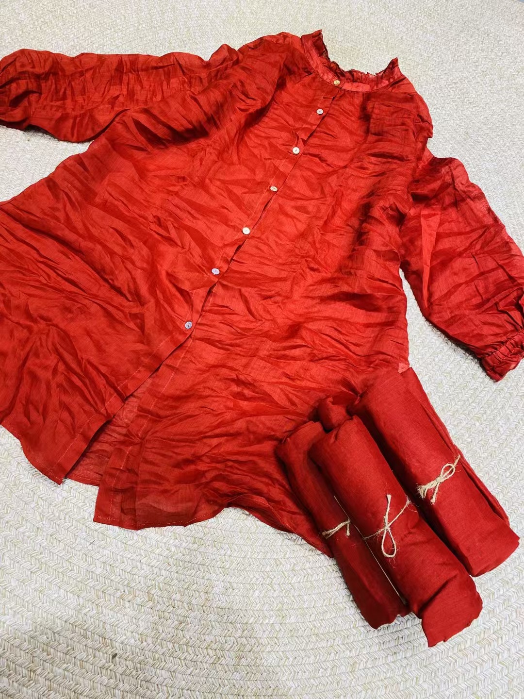 Ramie Ear Blouse 여자 중간 길이 2025 봄 새로운 느슨한 올매치 레드 예술적 새해 원피스