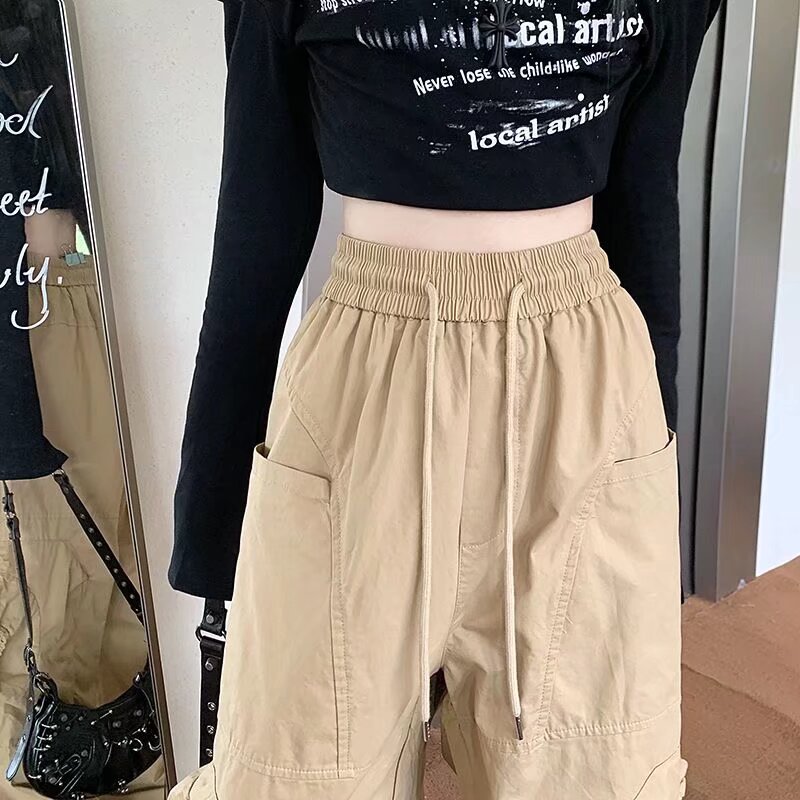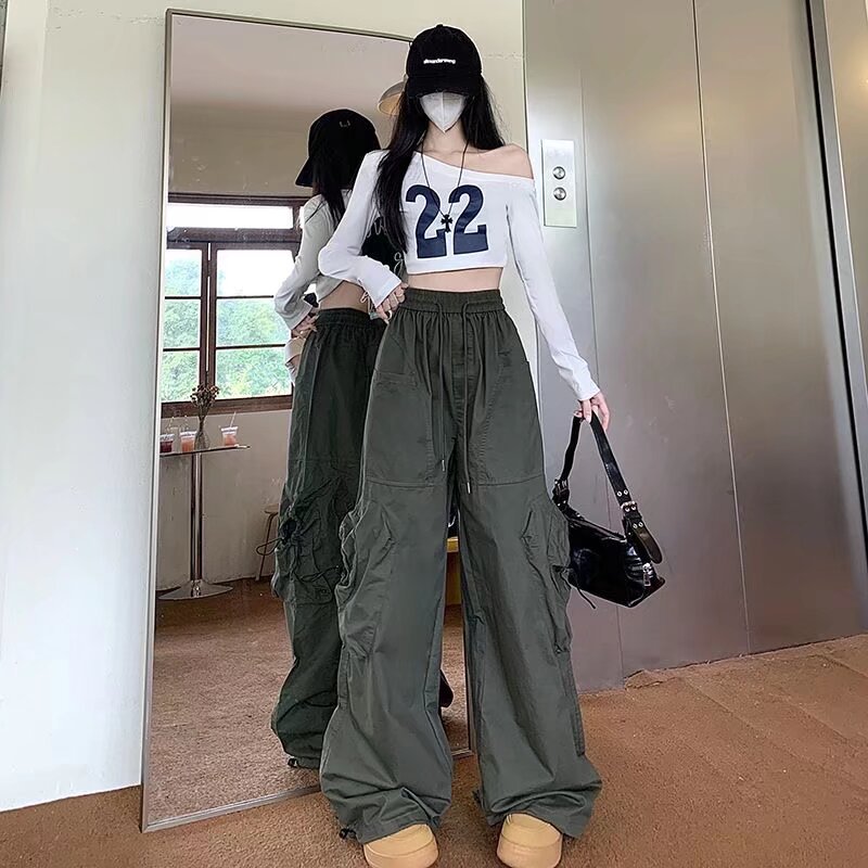 빈티지 넓은 다리 대형 포켓 군중 바지 여성 힙합 봄과 가을 새로운 도착 서랍 다리 느슨한 캐주얼 캐주얼 바지
