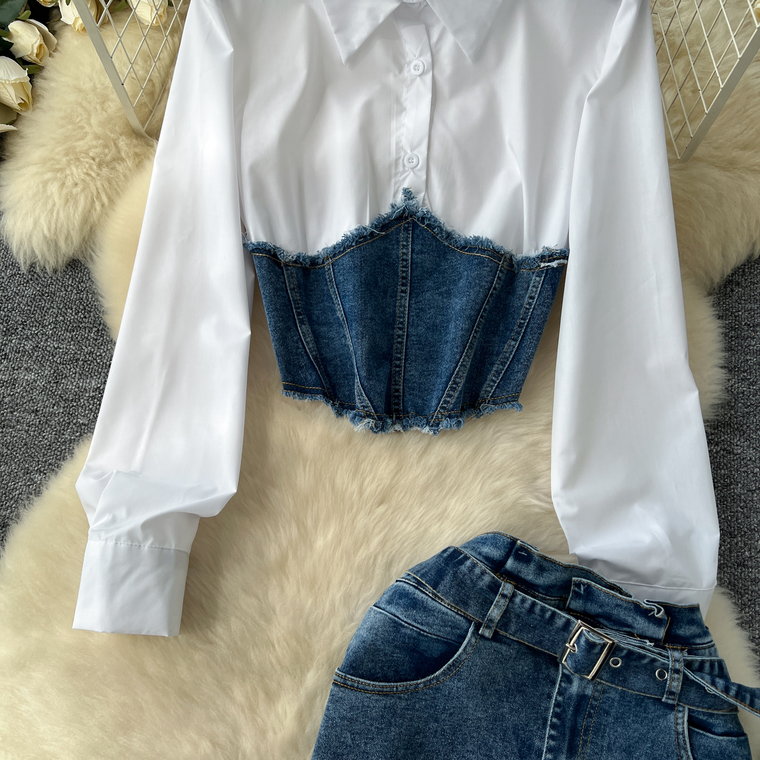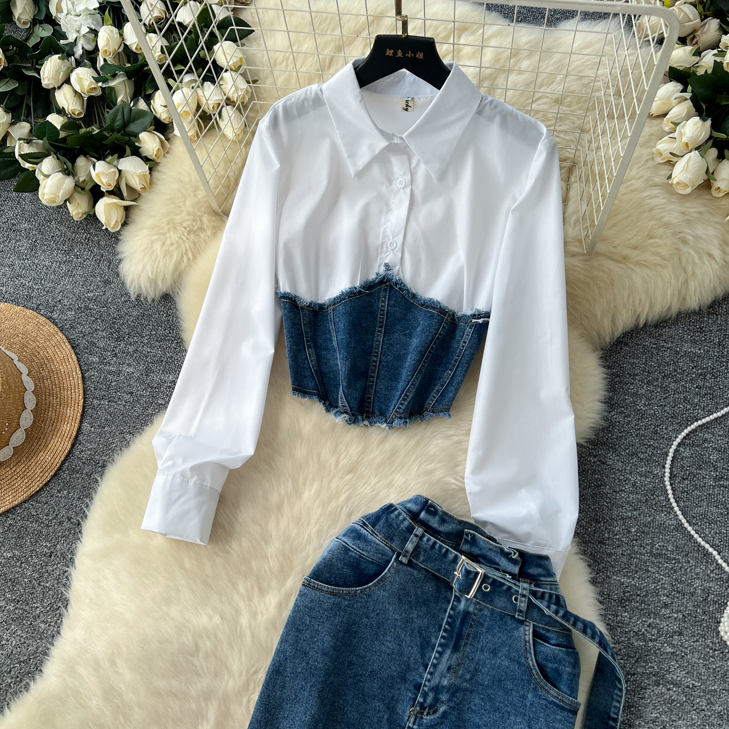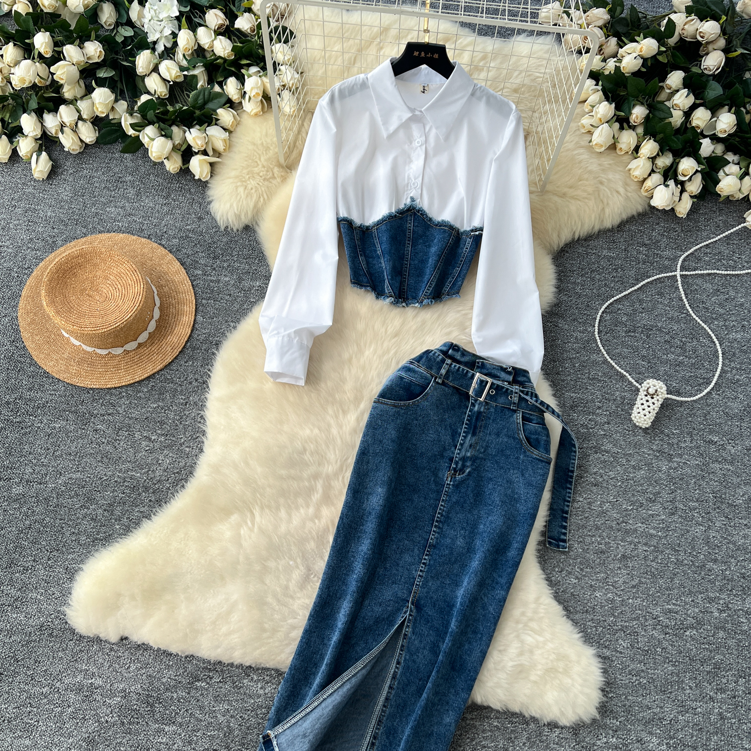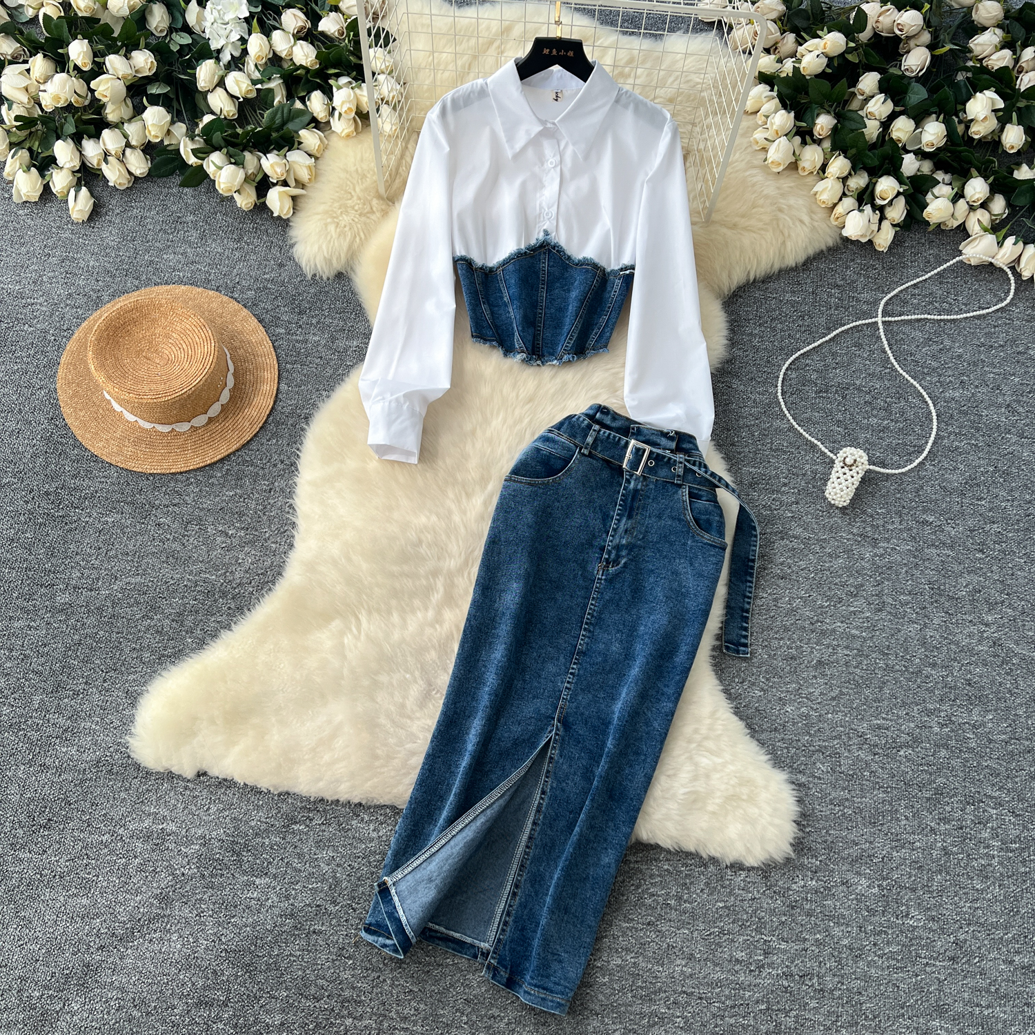 한국 스타일 여신 스타일 패션 바느질 가짜 투피스 긴팔 셔츠 여성용 벨트 타이트 허리 데님 스커트 투피스 세트스토어 가기