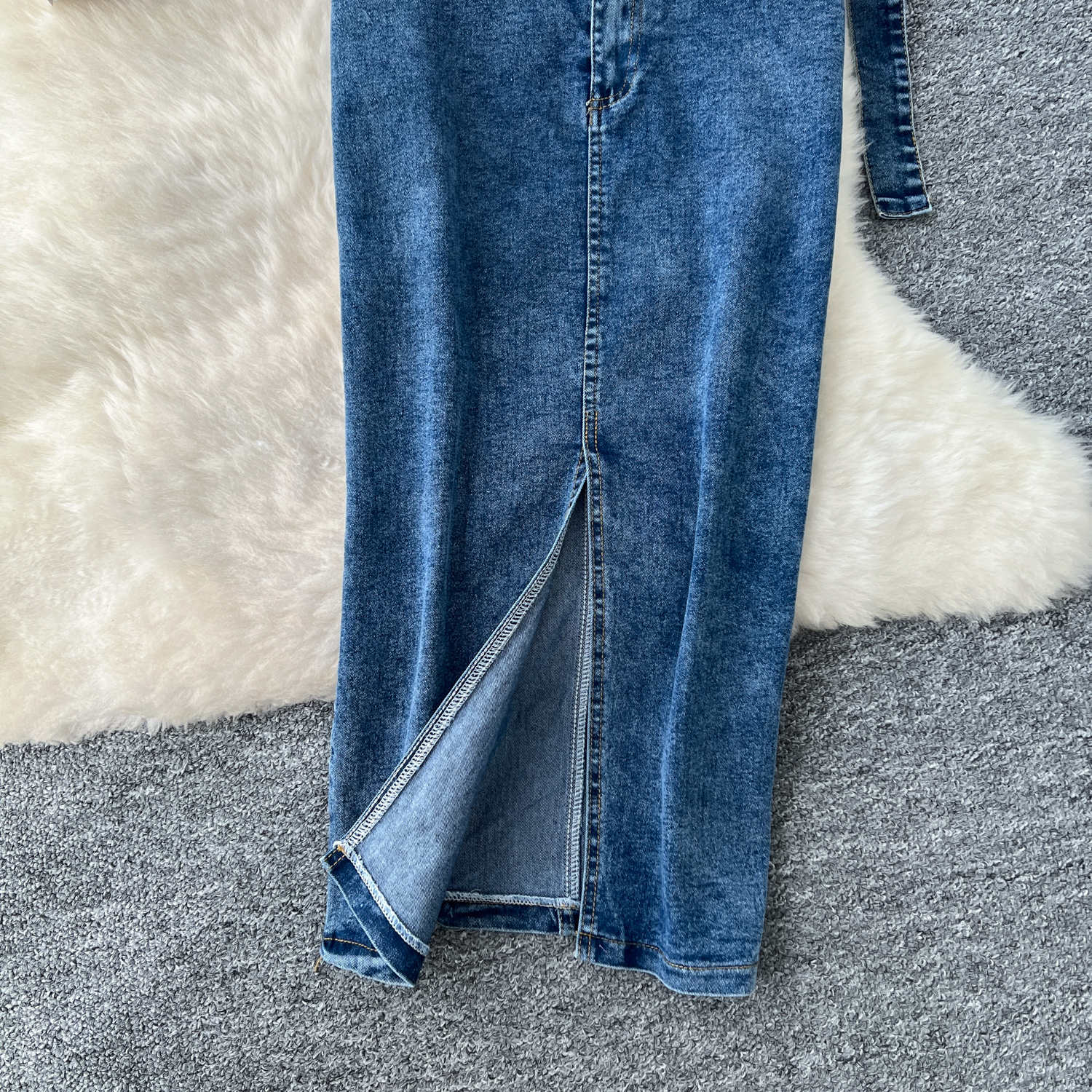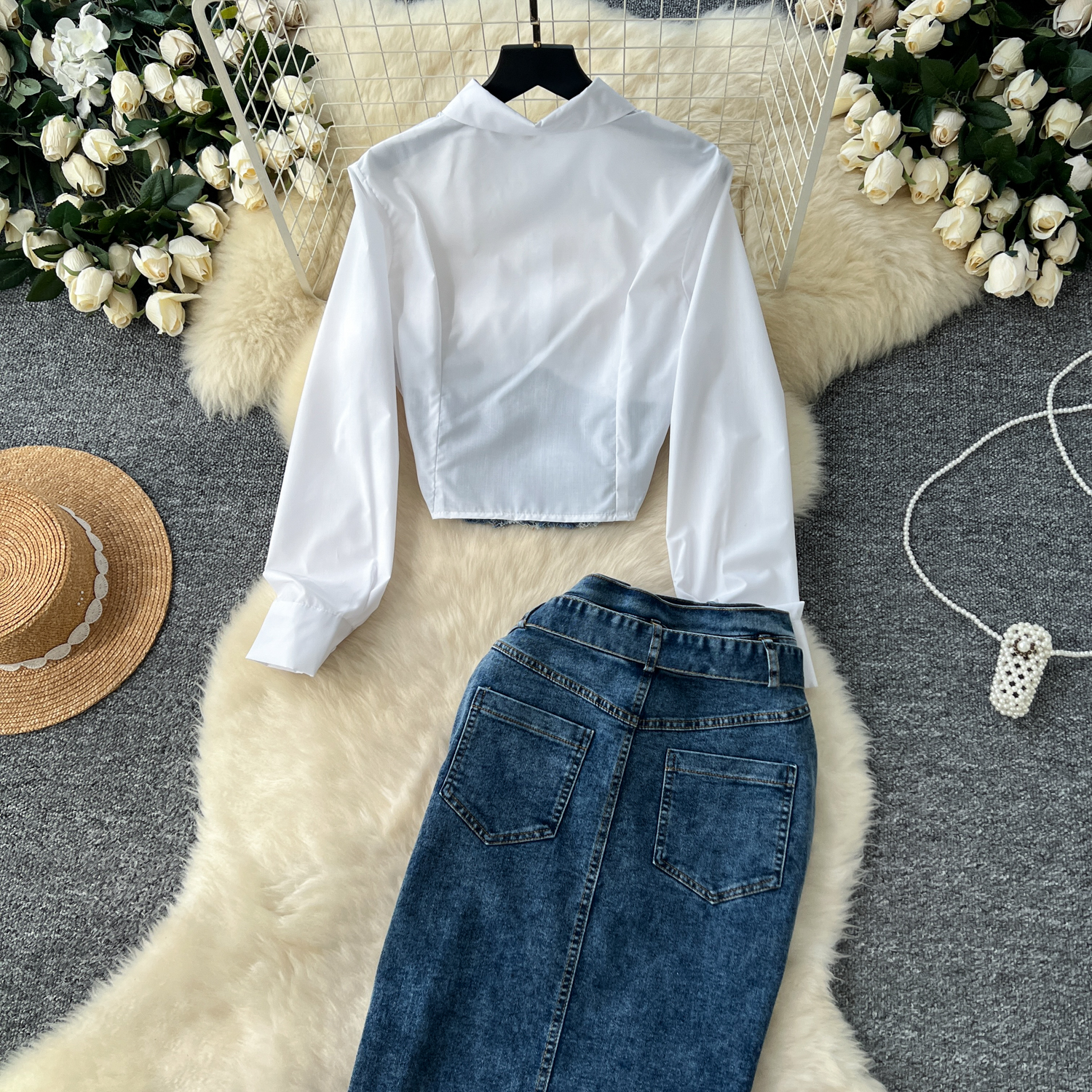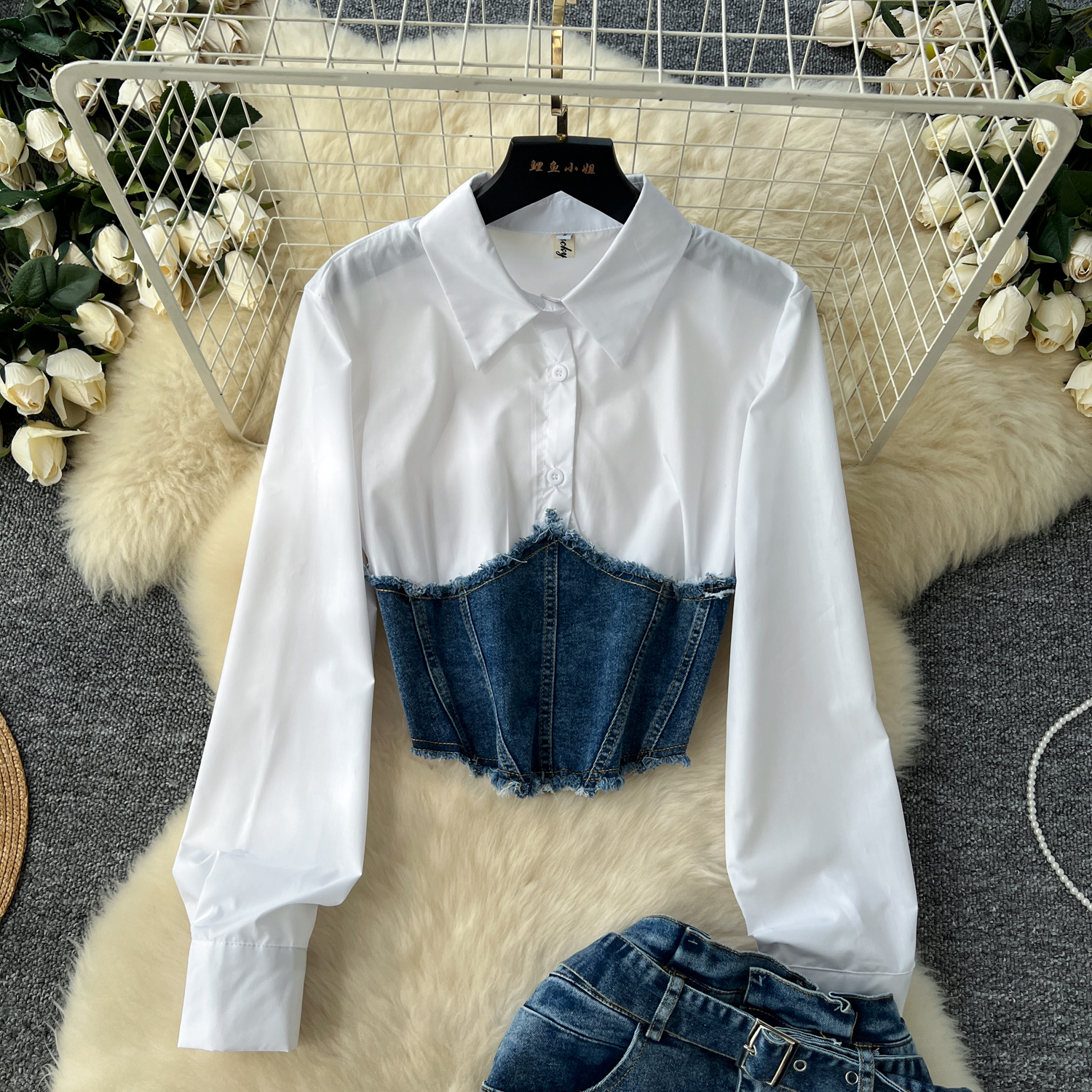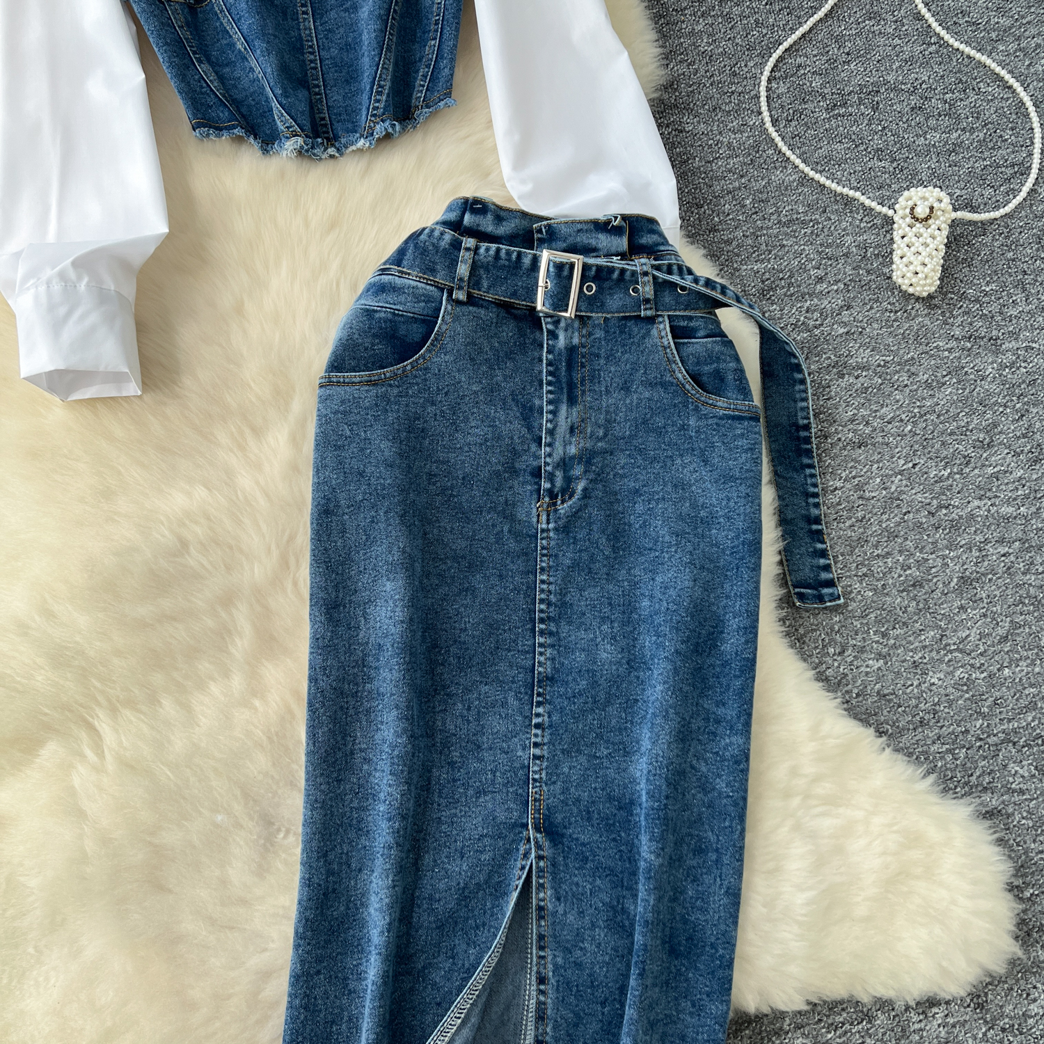 한국 스타일 여신 스타일 패션 바느질 가짜 투피스 긴팔 셔츠 여성용 벨트 타이트 허리 데님 스커트 투피스 세트스토어 가기