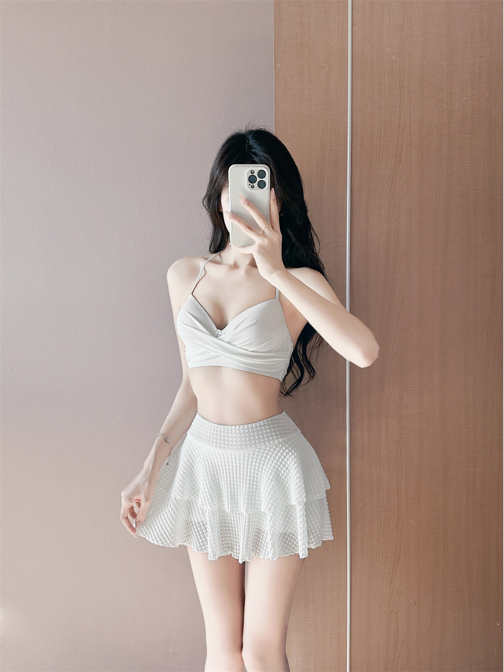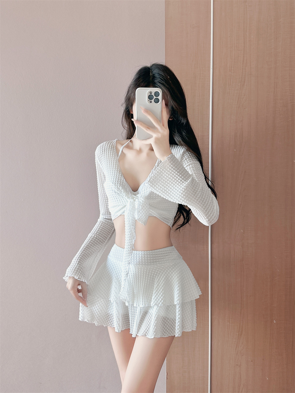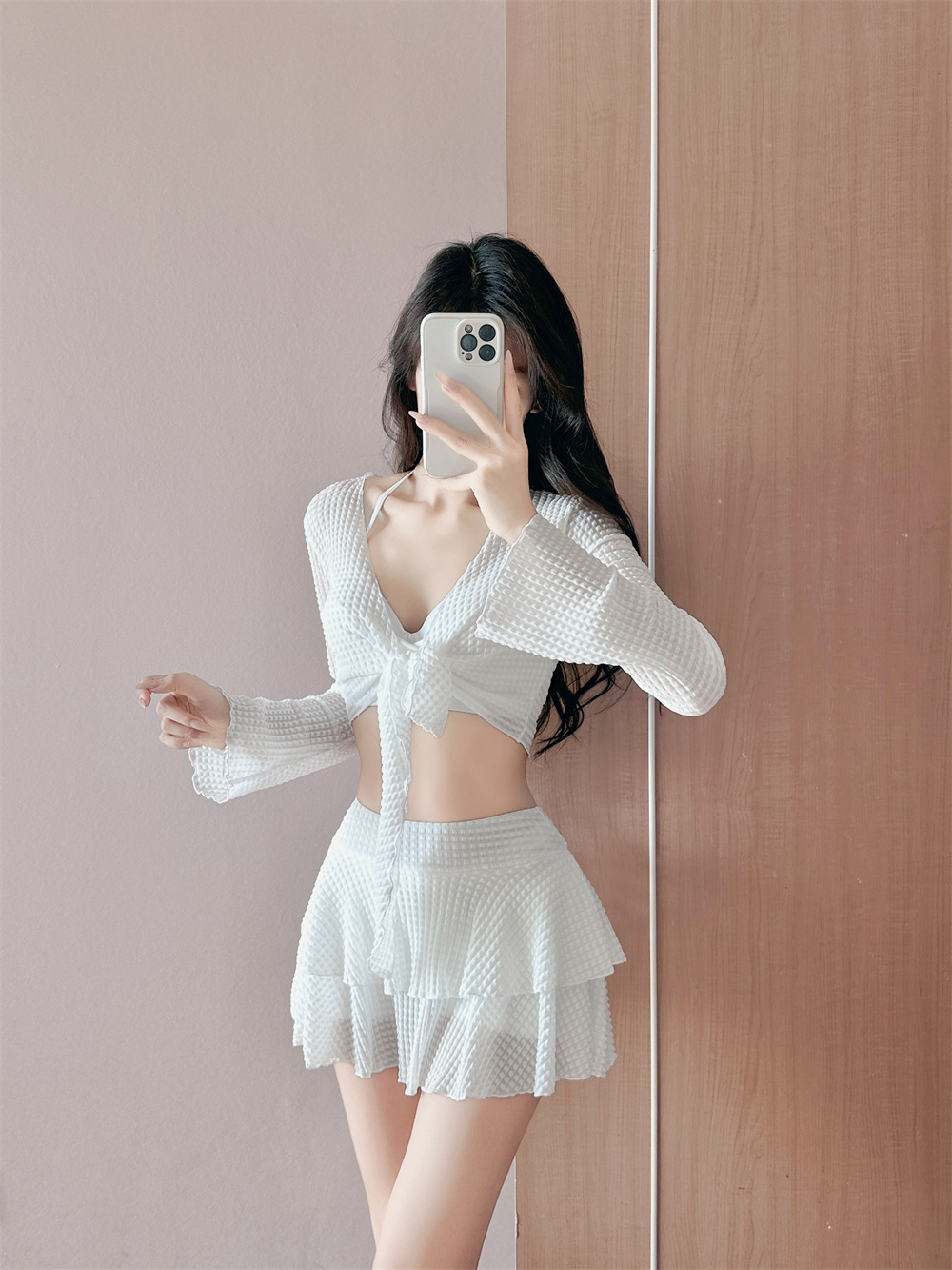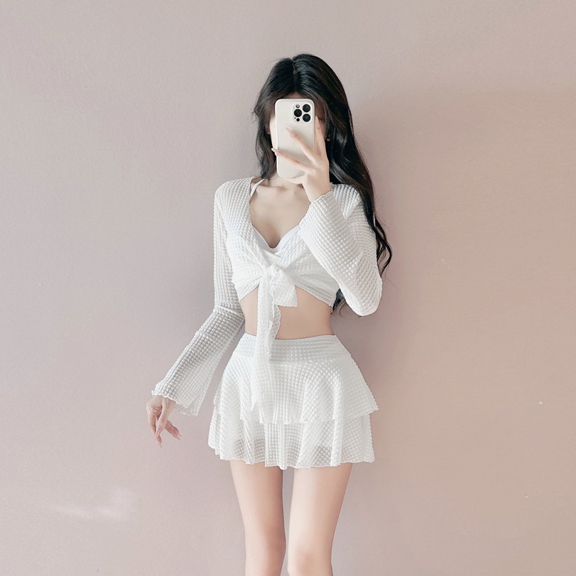 2025 새로운 치마 분할 수영복 여성 블라우스 3 피스 세트 온천 휴가 보수적 인 큰 가슴 푸시 업 태양 보호스토어 가기