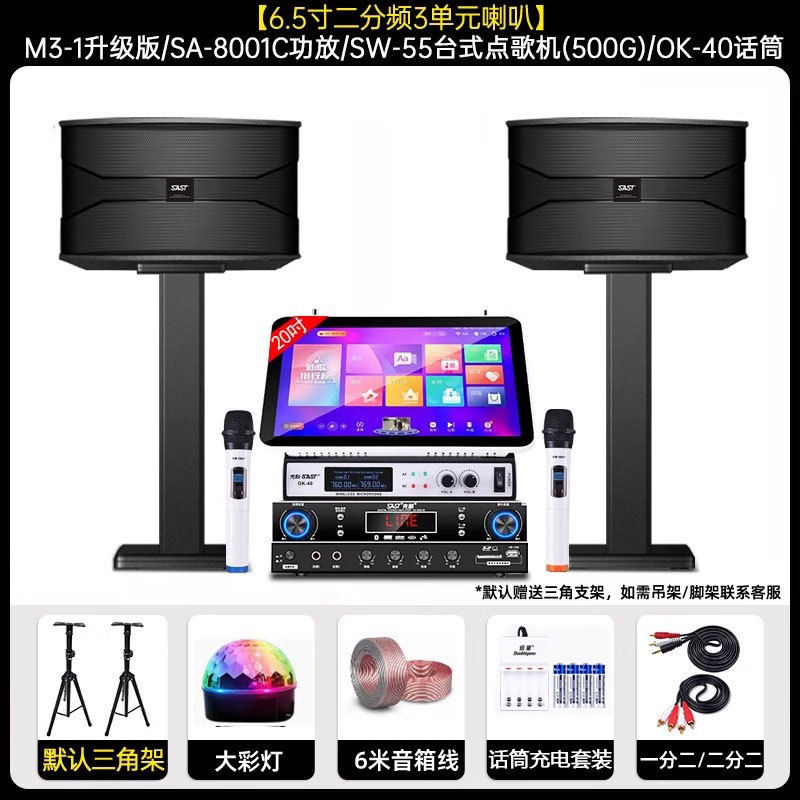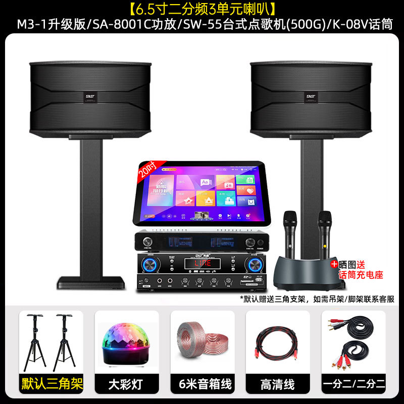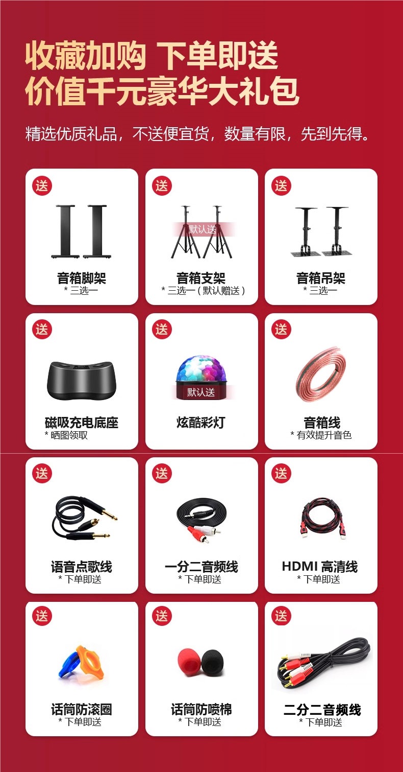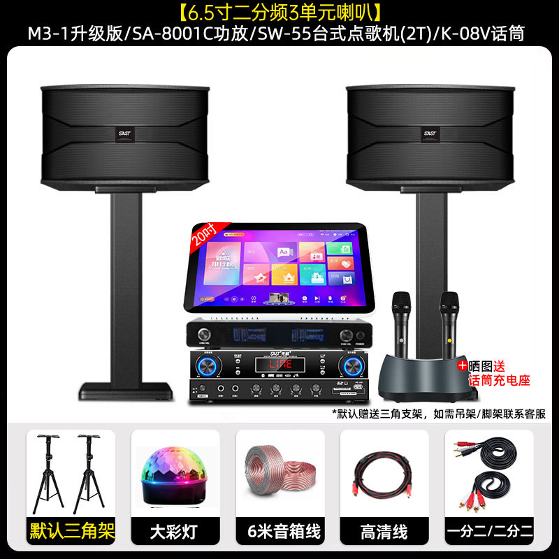 • [한 쌍의 6.5inch 스피커] + 데스크탑 20inch 노래방 기계 2T + 전력 증폭기 + 업그레이드된 충전 마이크 + 액세서리