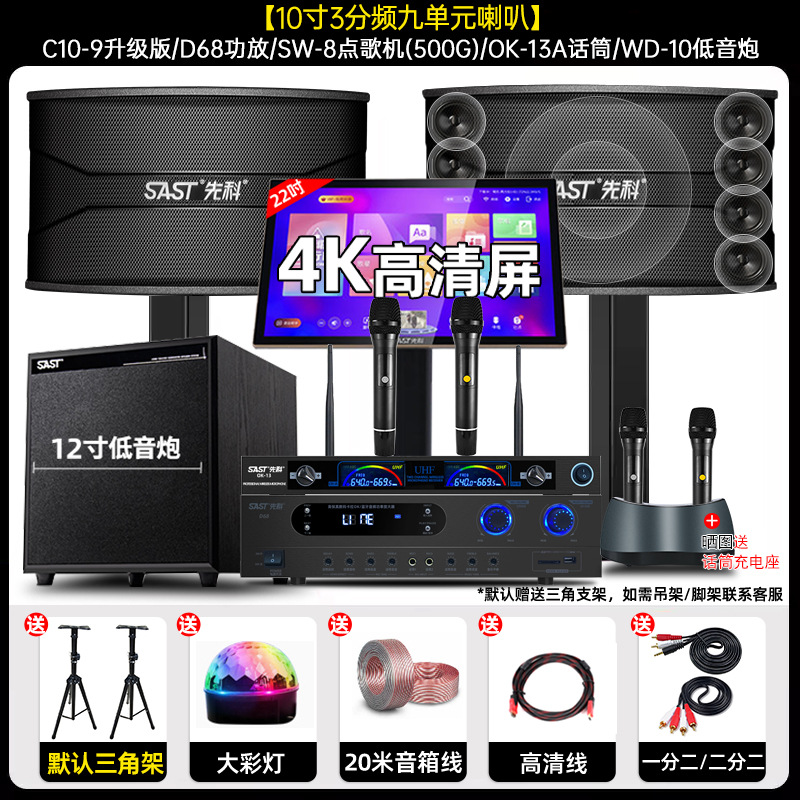 • [쌍당 10.9inch 장치] + 22inch 터치스크린 노래방 기계 500G + 전력 증폭기 + 버전 충전 마이크 + 12inch 서브우퍼 + 액세서리