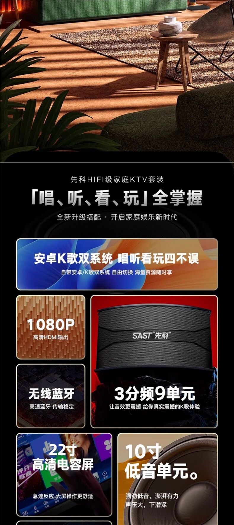• [쌍당 10.9inch 장치] + 22inch 터치스크린 노래방 기계 3T + 전력 증폭기 + 버전 충전 마이크 + 12inch 서브우퍼 + 액세서리