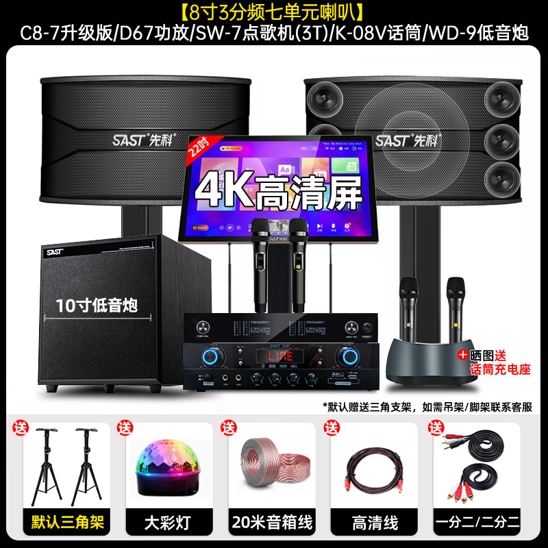 • [쌍당 8.7inch 장치] + 22inch 터치스크린 노래방 기계 3T + 전력 증폭기 + 디럭스 버전 충전 마이크 + 10inch 서브우퍼 + 액세서리