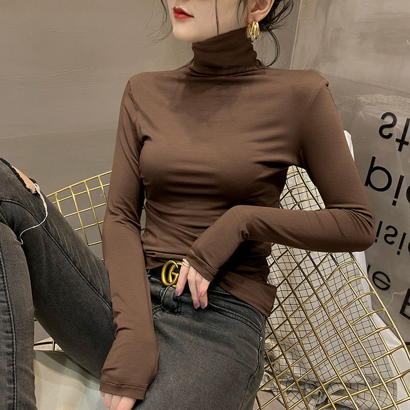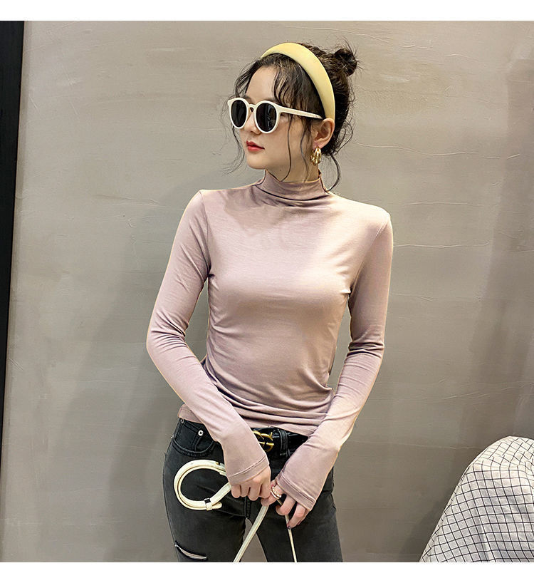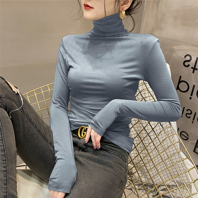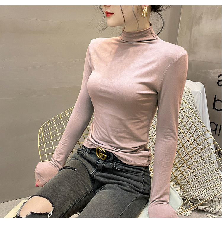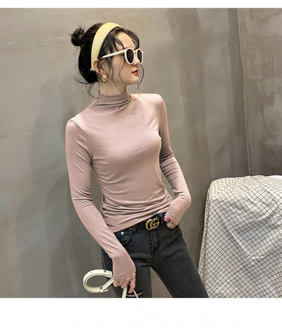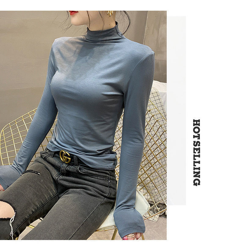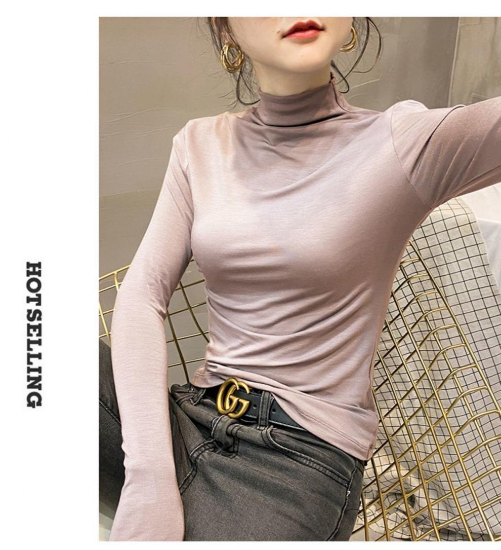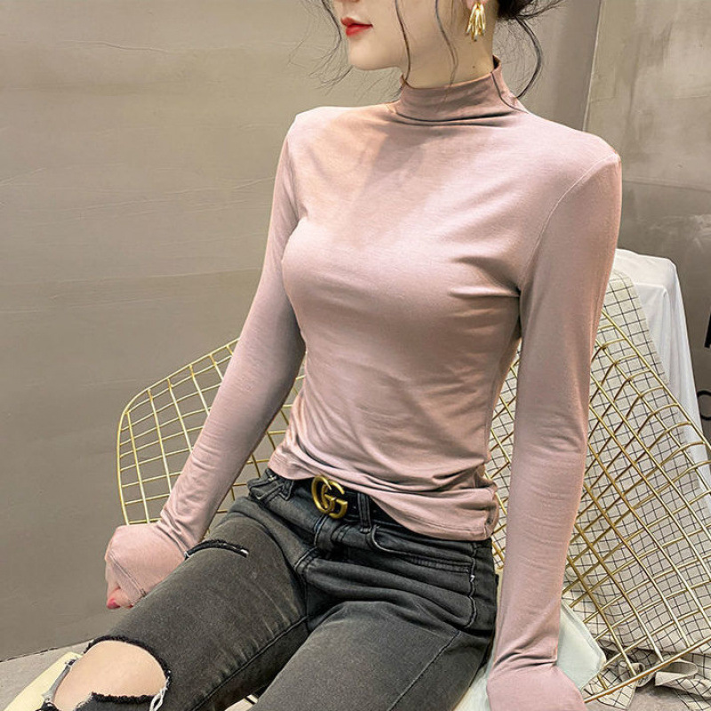 모달베이스 셔츠 여성용 긴팔 티셔츠 하프 하이 칼라 봄 가을 겨울 2024 새로운 올 매치 인테리어 웨스턴 스타일 타이트탑