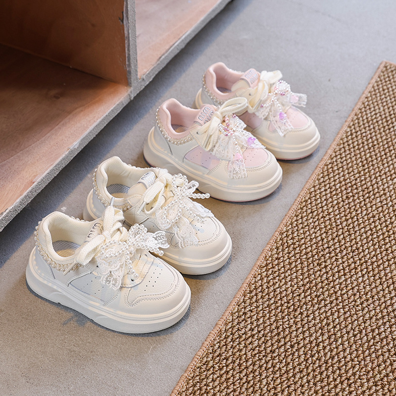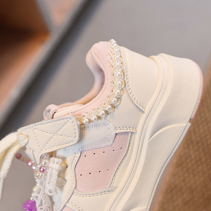 2025 봄 새로운 한국 스타일 어린이 캐주얼 운동화 소녀 진주 활 서양식 부드러운 밑창 흰색 신발스토어 가기