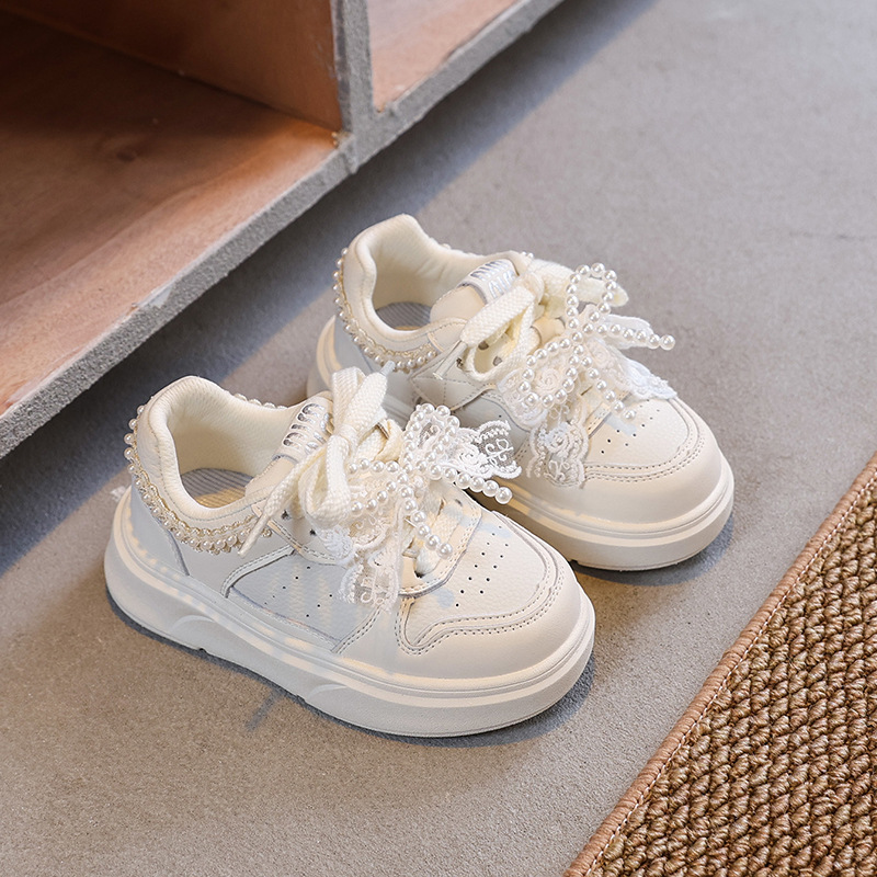 2025 봄 새로운 한국 스타일 어린이 캐주얼 운동화 소녀 진주 활 서양식 부드러운 밑창 흰색 신발