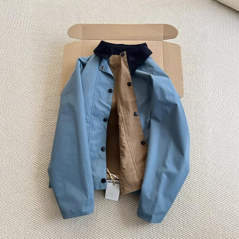 CHAO 클래스 추천! 빈티지 블루 컬러 블록 옷깃 양면 느슨한 캐주얼 재킷 코트 여성 짧은 코트 겨울스토어 가기