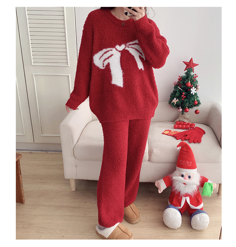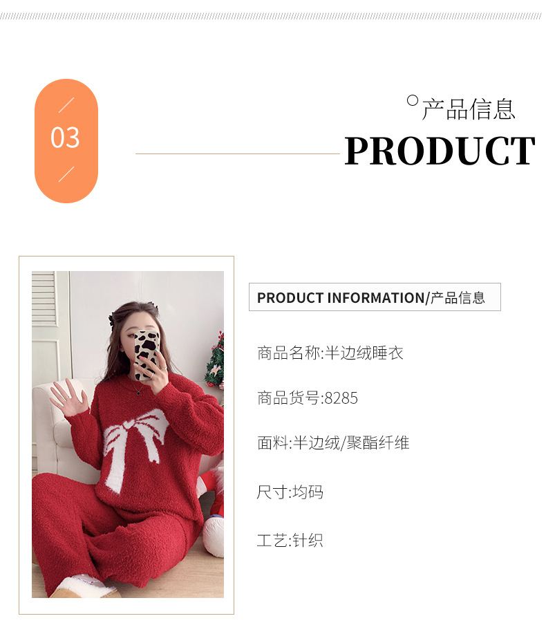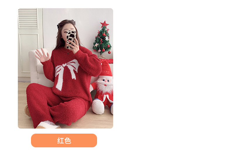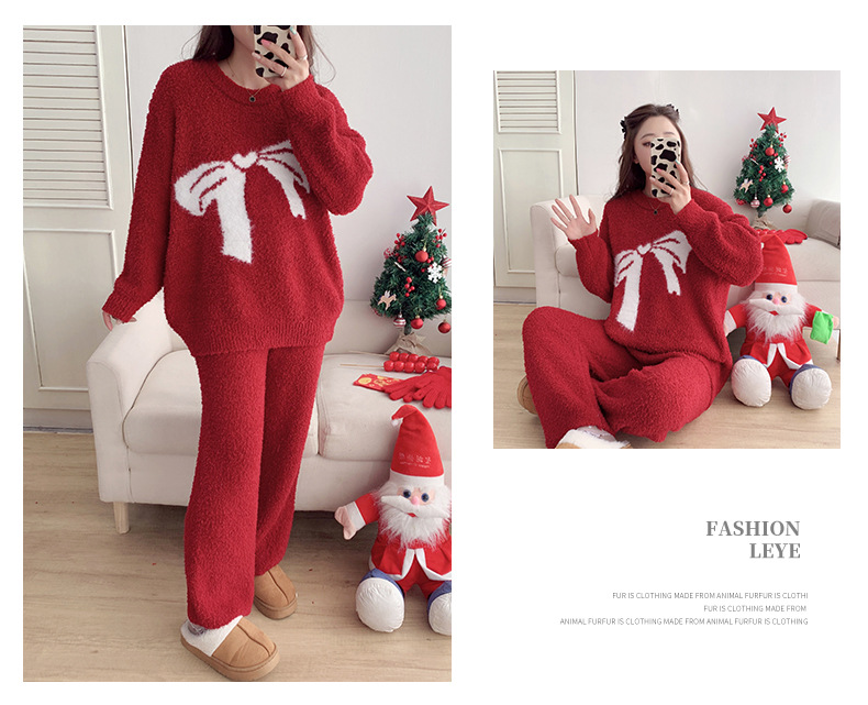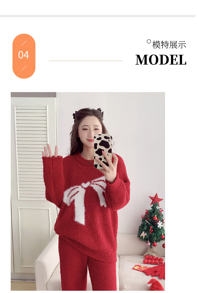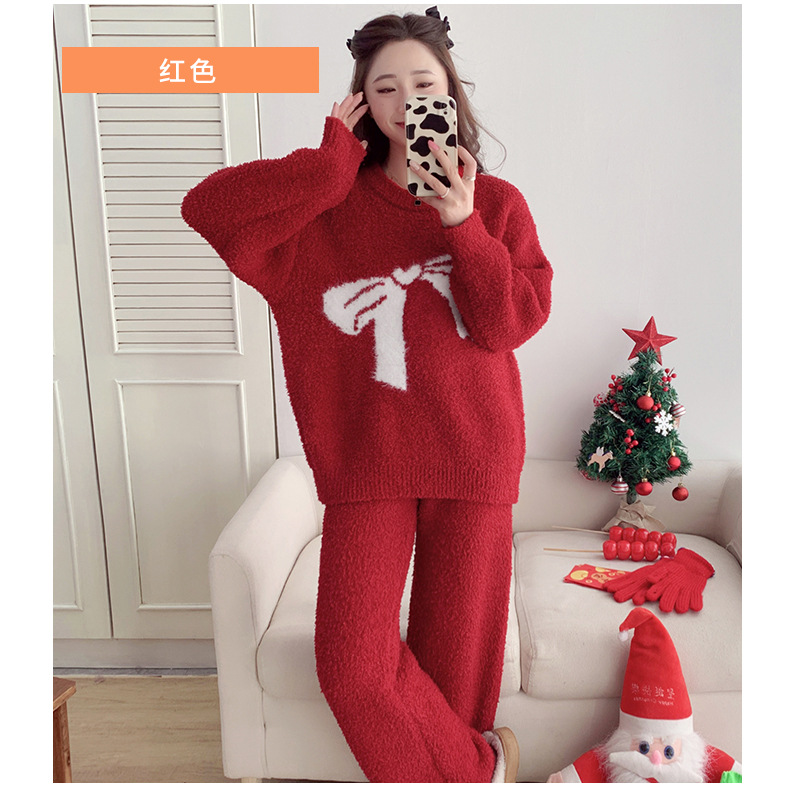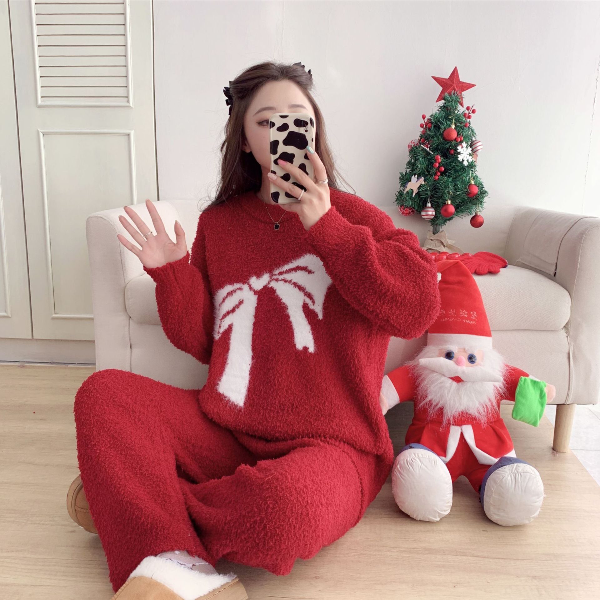 새로운 부드러운 빨간 활 파자마 여성 반쪽 벨벳 두꺼운 따뜻한 집 옷 세트 달콤한 잠옷스토어 가기