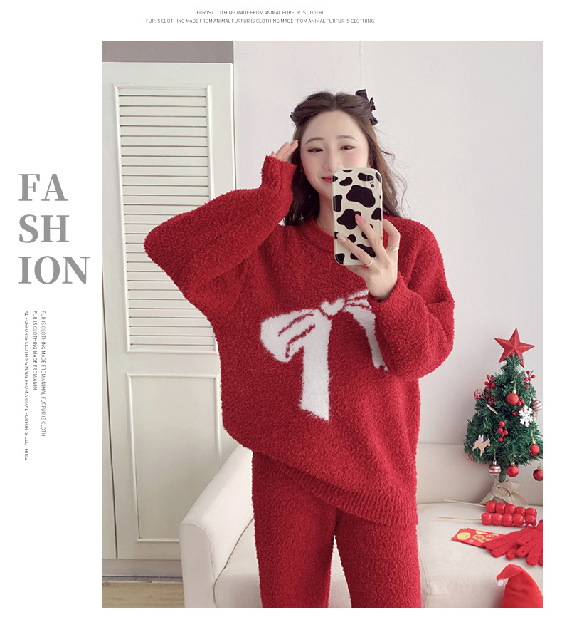 새로운 부드러운 빨간 활 파자마 여성 반쪽 벨벳 두꺼운 따뜻한 집 옷 세트 달콤한 잠옷
