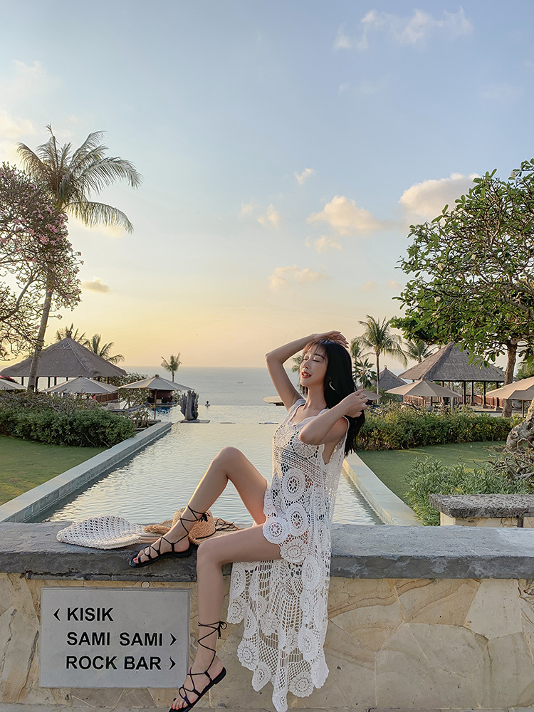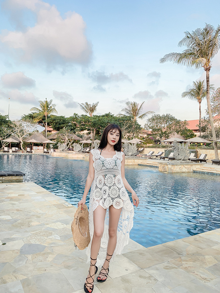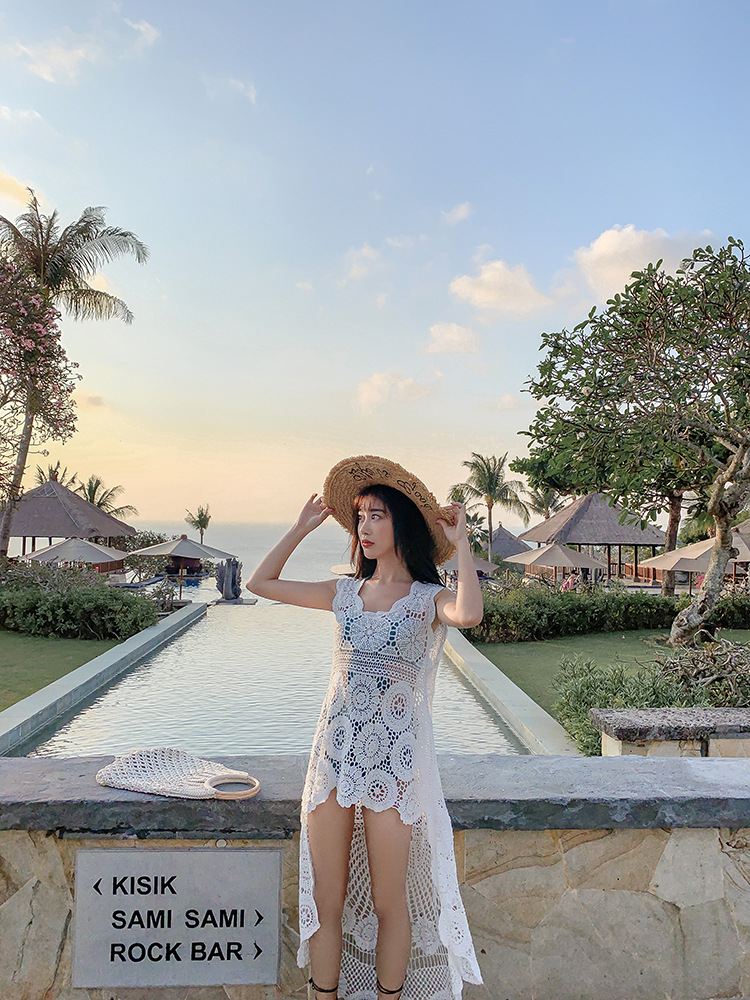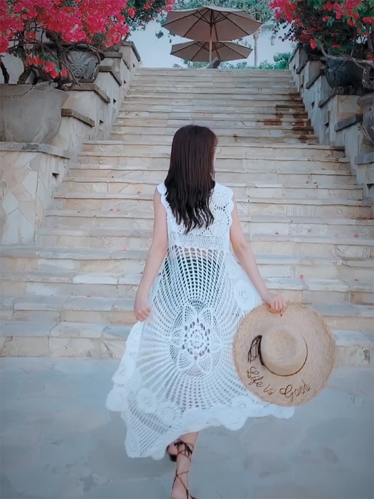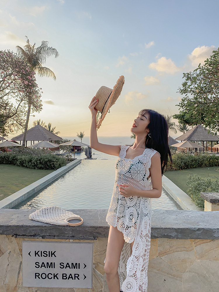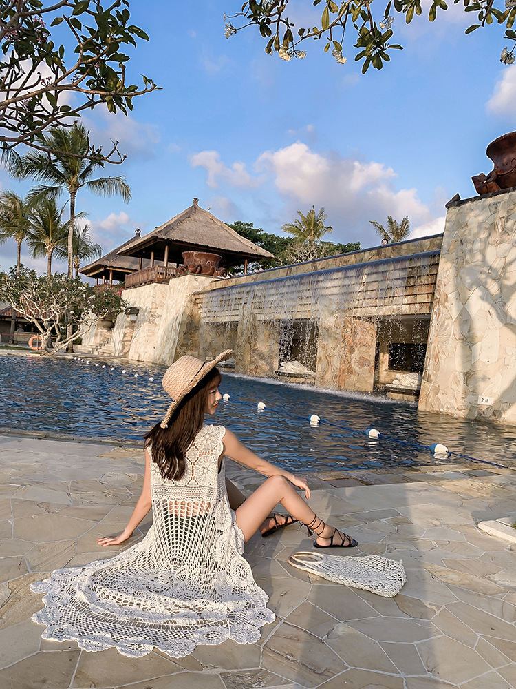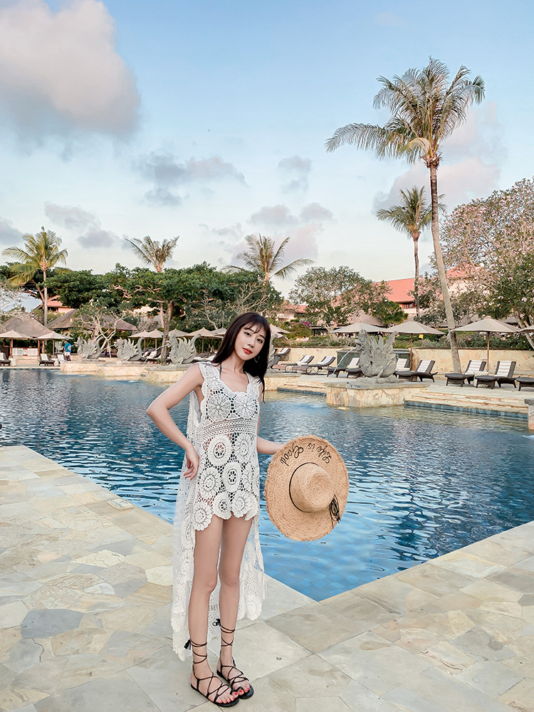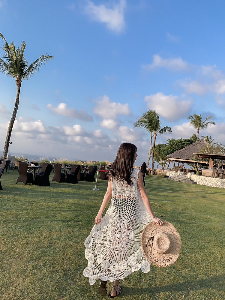 镂空外搭蕾丝背心百搭长款棉女钩花凤尾无袖针织马夹上衣海边罩衫