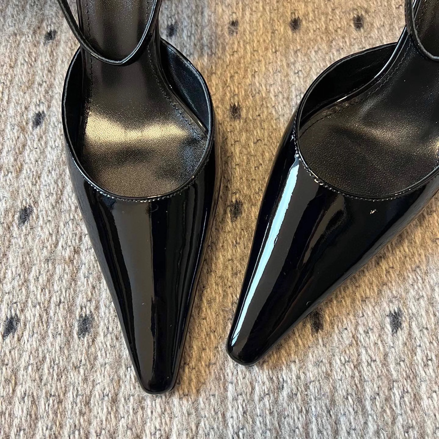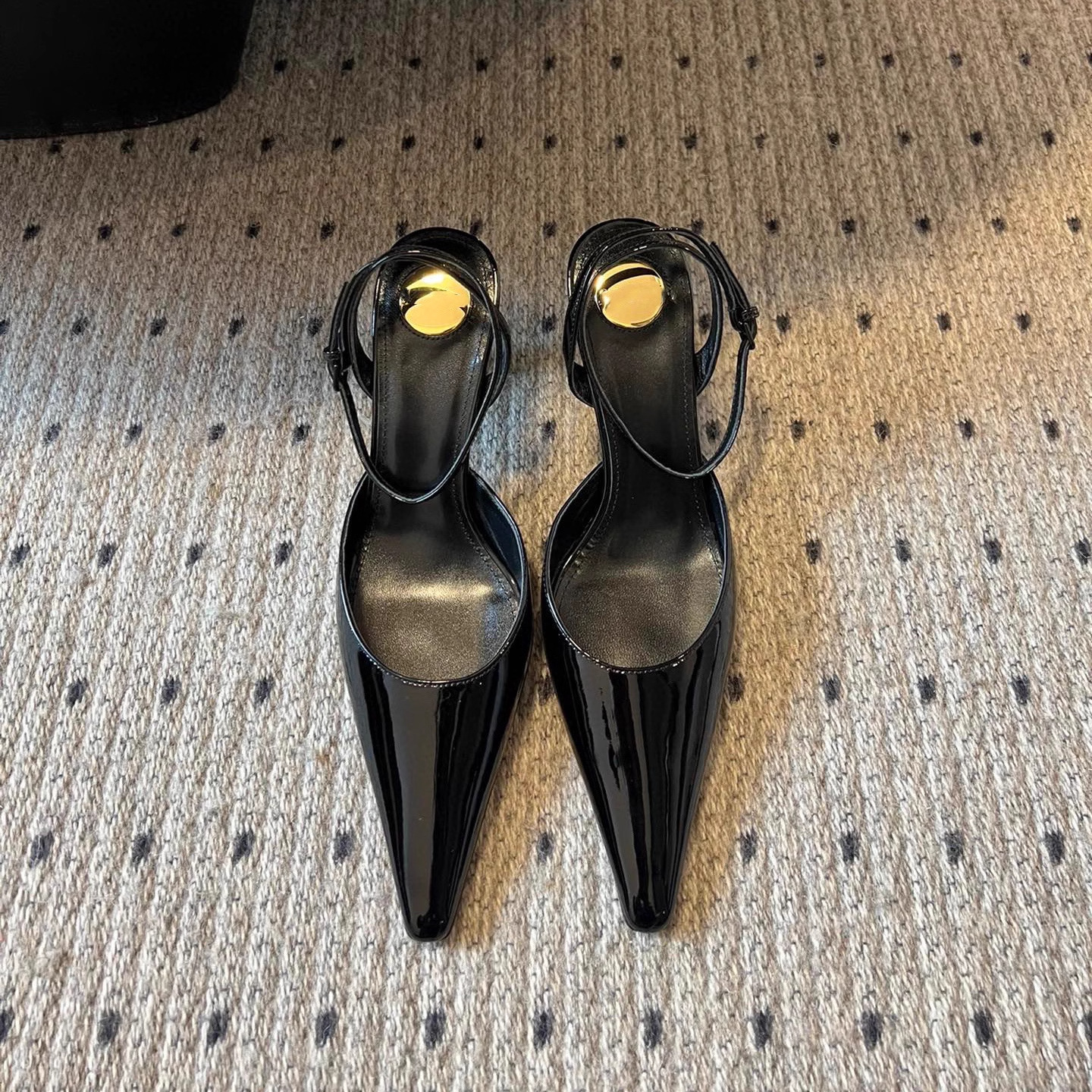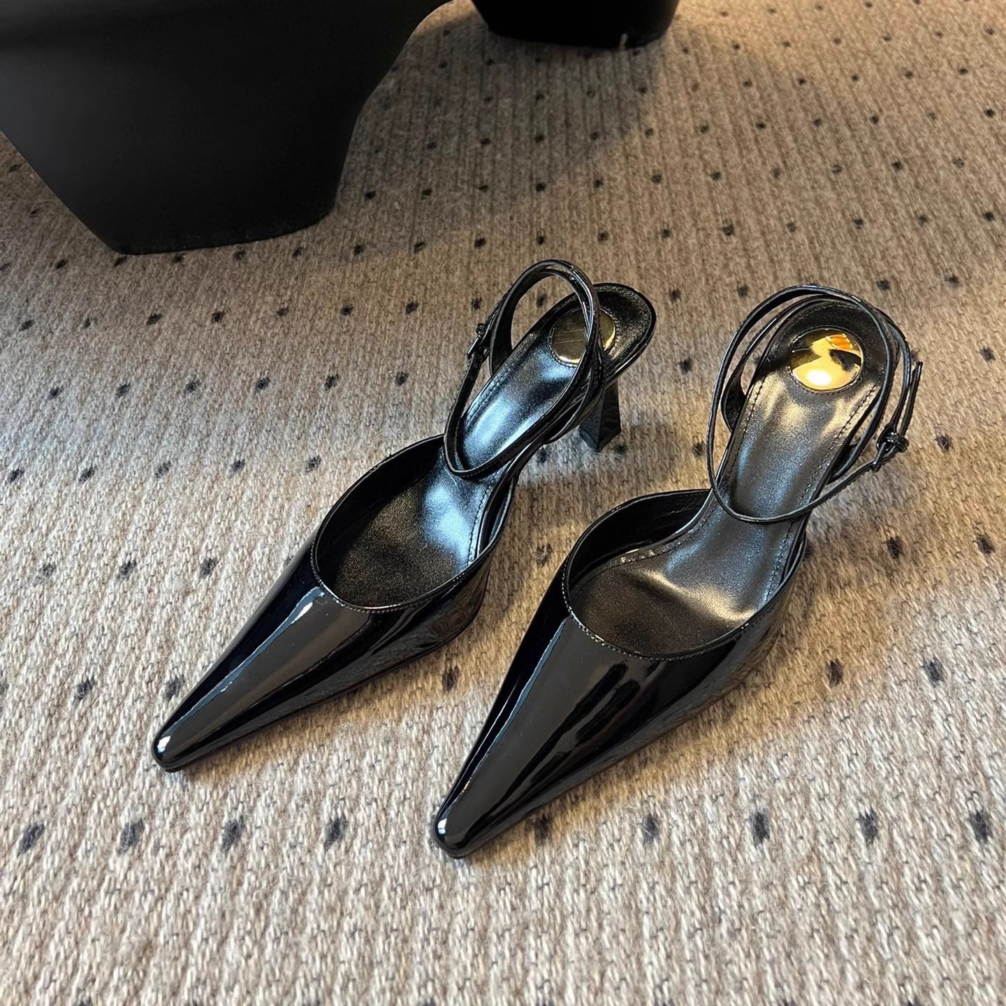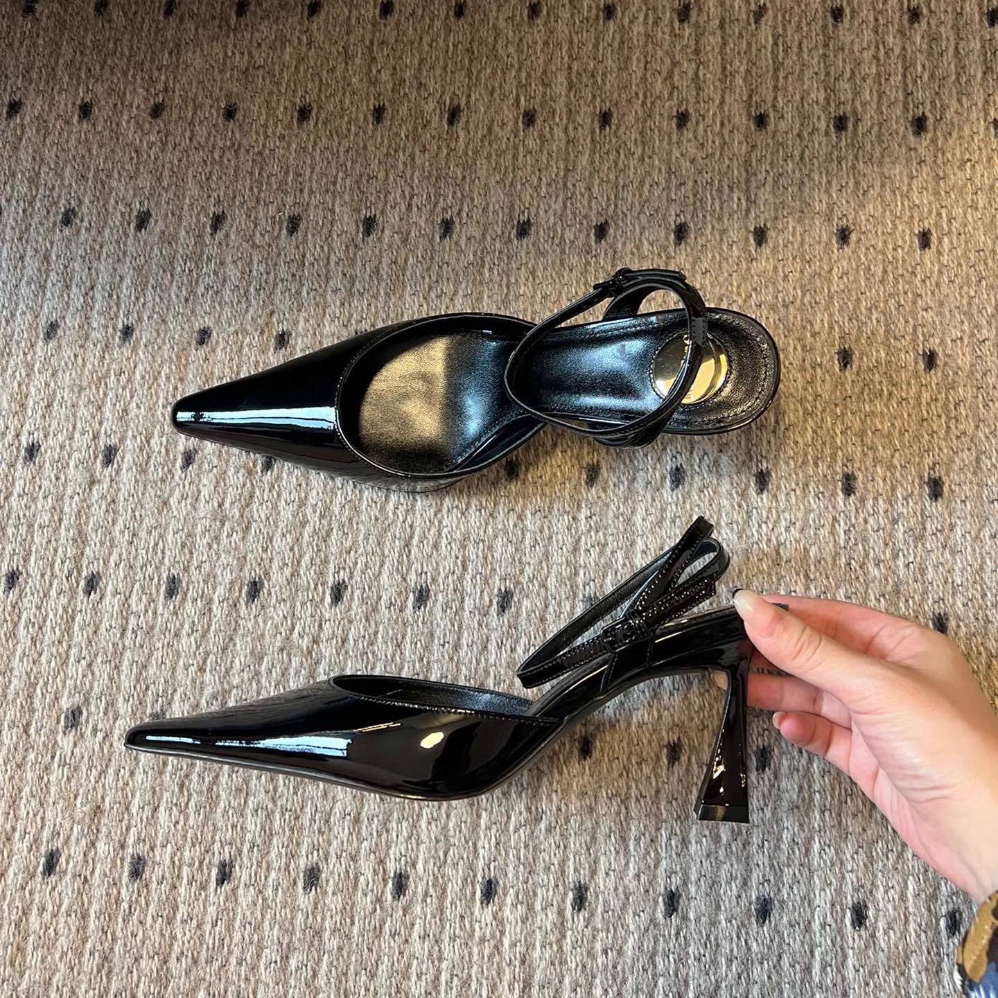 • 블랙 글로시 하이힐 포인티드 토 샌들, 굽 높이 약 7.5cm